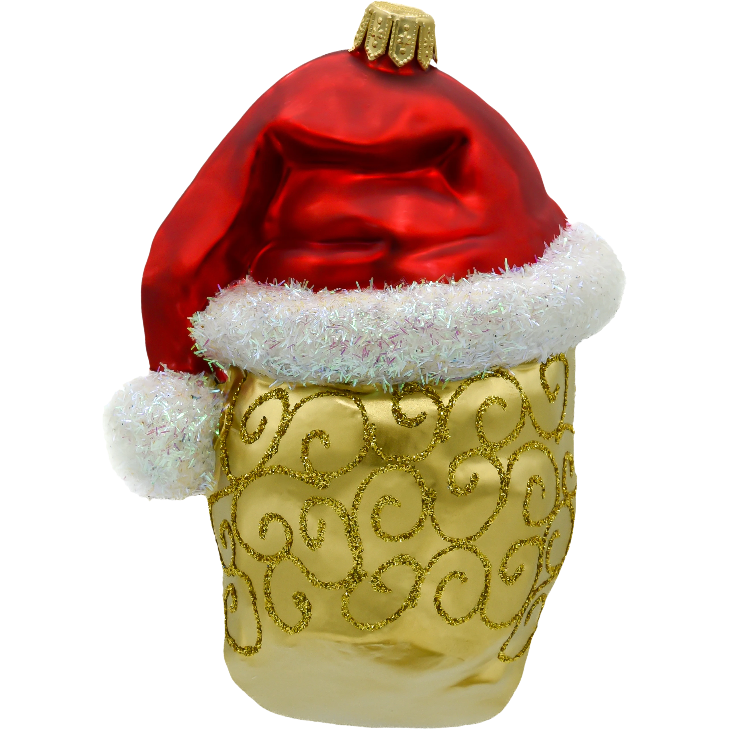 Kolorystyka: Bogata złota barwa czaszki kontrastuje z głęboką czerwienią czapki i białymi, lśniącymi detalami. Czarne, brokatowe akcenty podkreślają detale czaszki, tworząc efekt głębi i blasku, który wspaniale odbija światło choinkowych lampek.
