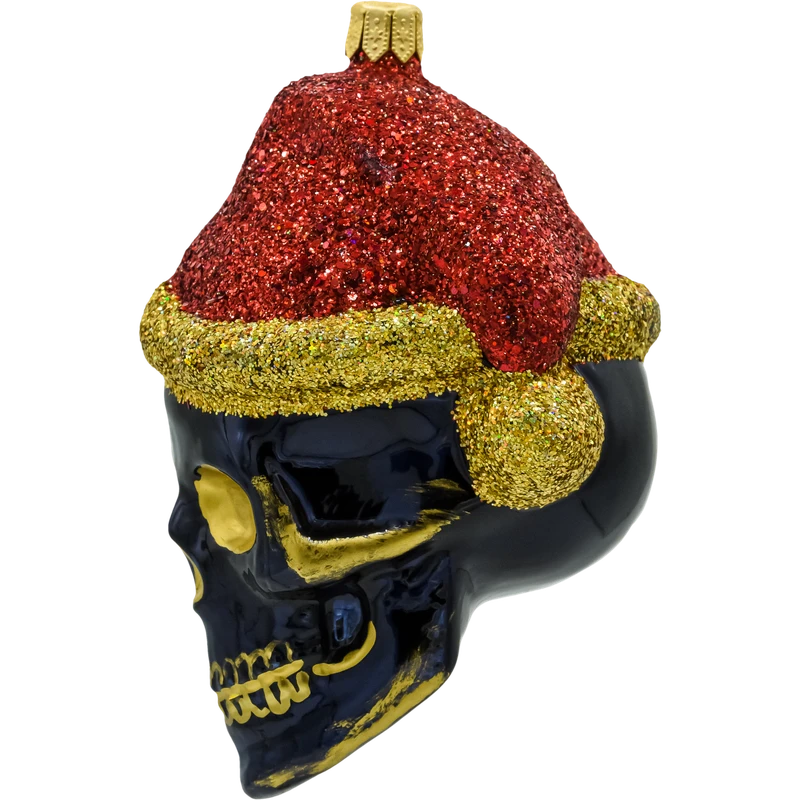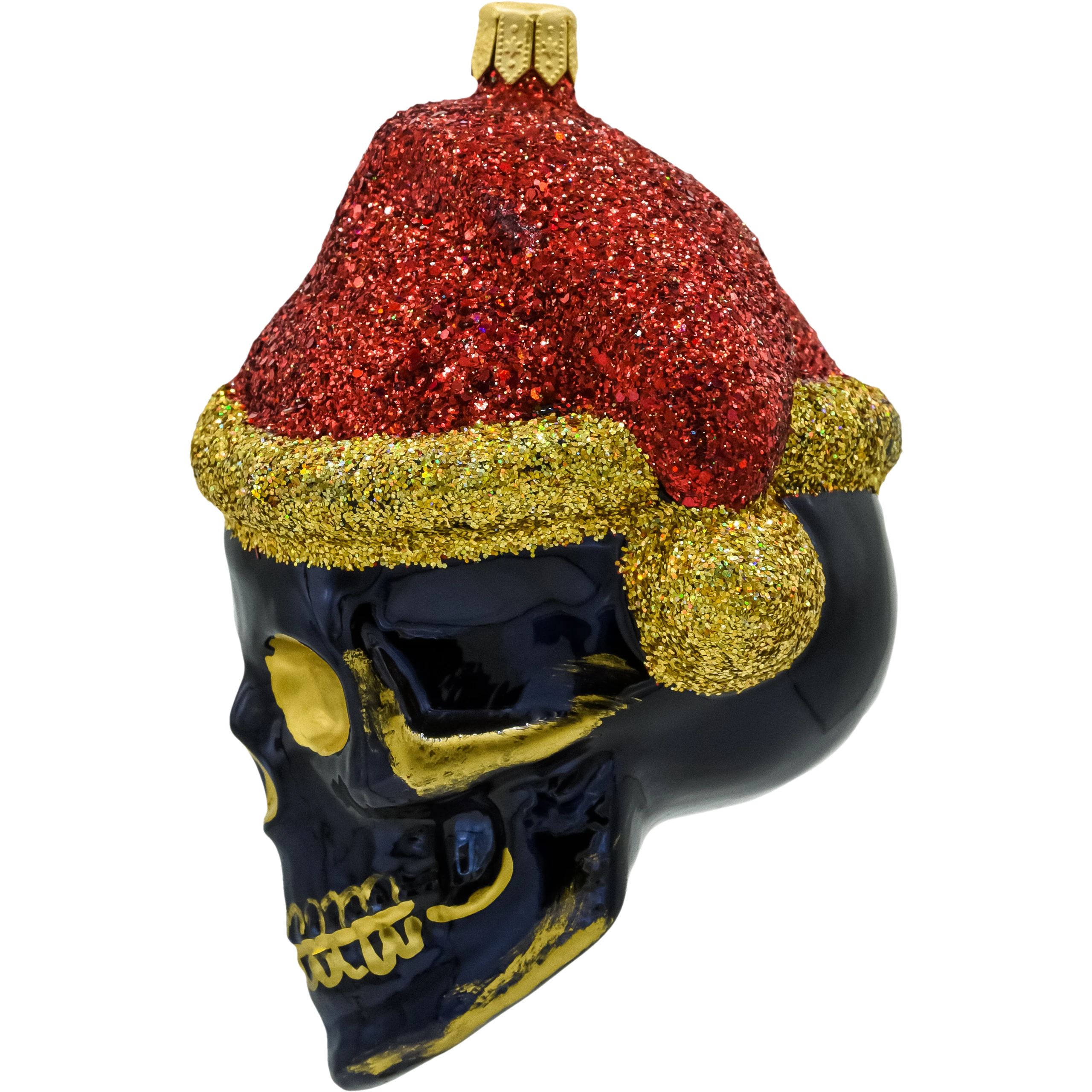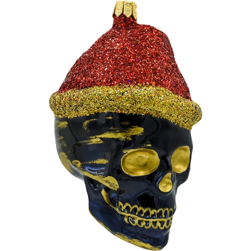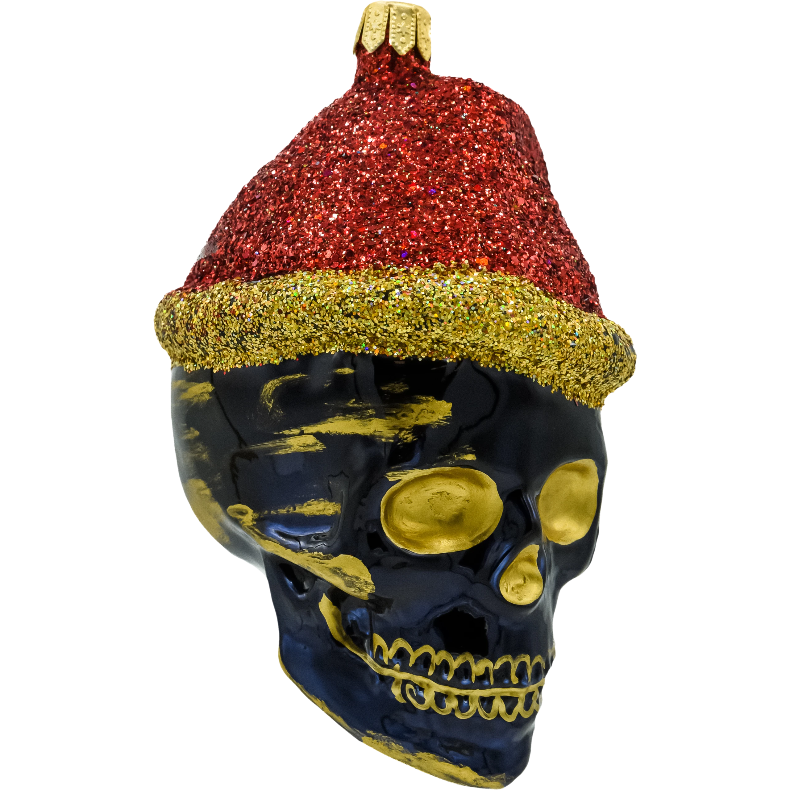 Czaszka nosi klasyczną czerwoną czapkę świętego Mikołaja, pokrytą intensywnie błyszczącym brokatem, a wykończenie czapki zrobione jest z złotego brokatu, co tworzy kontrast z ciemnym, gotyckim wyglądem czaszki.
