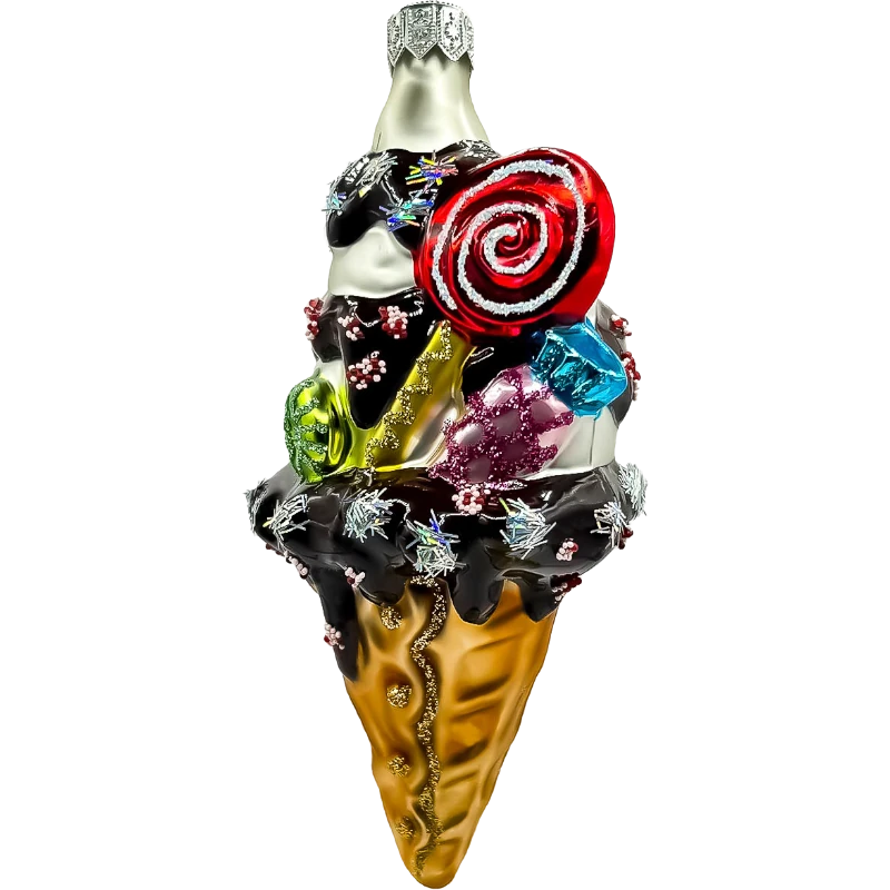 Główna część bombki wykonana jest w kształcie rożka z czekoladową polewą i detalami przypominającymi śnieżne gwiazdki. Na szczycie dekoracji umieszczony jest kolorowy lizak oraz inne słodkie akcenty, które wprowadzają dodatkowy element świątecznej fantazji. Każdy szczegół, od drobnych srebrnych zdobień po pastelowe, jaskrawe cukierki, został wykonany z najwyższą precyzją, co nadaje bombce artystyczny i niepowtarzalny charakter.