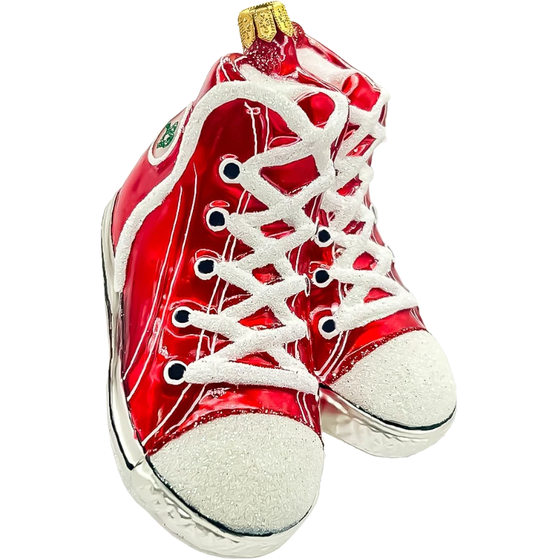 Bombka w kształcie trampek została zaprojektowana z niezwykłą dbałością o szczegóły. Czerwony, lakierowany kolor z białymi sznurówkami i podeszwami nawiązuje do klasycznego obuwia sportowego, które zdobyło serca ludzi na całym świecie. Dodatkowe detale, takie jak okrągłe otwory na sznurówki oraz realistyczna faktura podeszwy, czynią tę ozdobę wyjątkową.