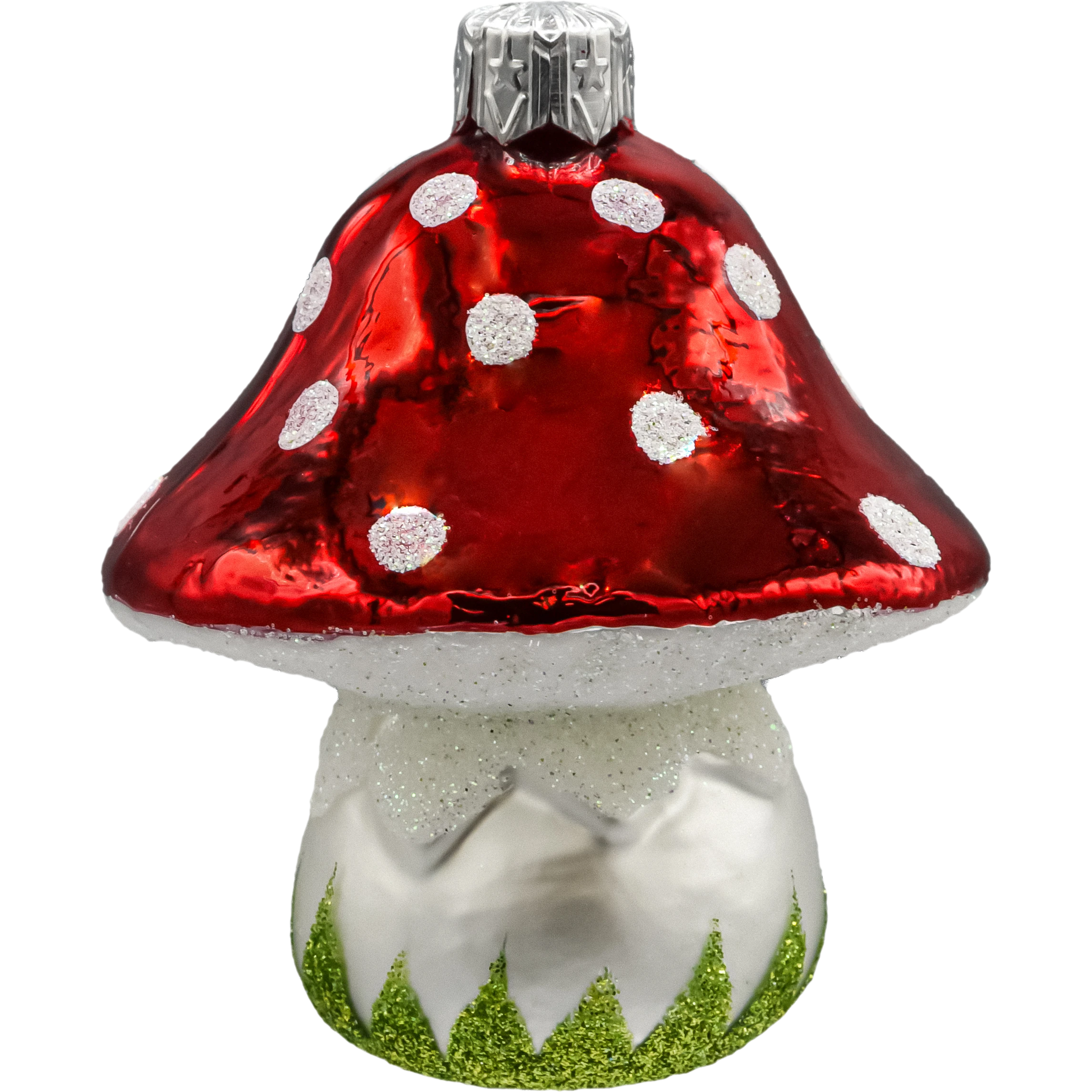 Wprowadź do swojej choinki nutę leśnej magii i nostalgii z wyjątkową bombką w kształcie klasycznego czerwonego muchomora. Ta ręcznie wykonana bombka choinkowa ze szkła dmuchanego zachwyca intensywnym połyskiem, kontrastem czerwieni z białymi brokatowymi kropkami oraz dekoracyjnym trzonem w odcieniach srebra i zieleni. Dolna część grzyba została ozdobiona imitacją śnieżnego płaszcza i trawiastej podstawy, co nadaje jej wyjątkowego uroku i naturalnego charakteru.