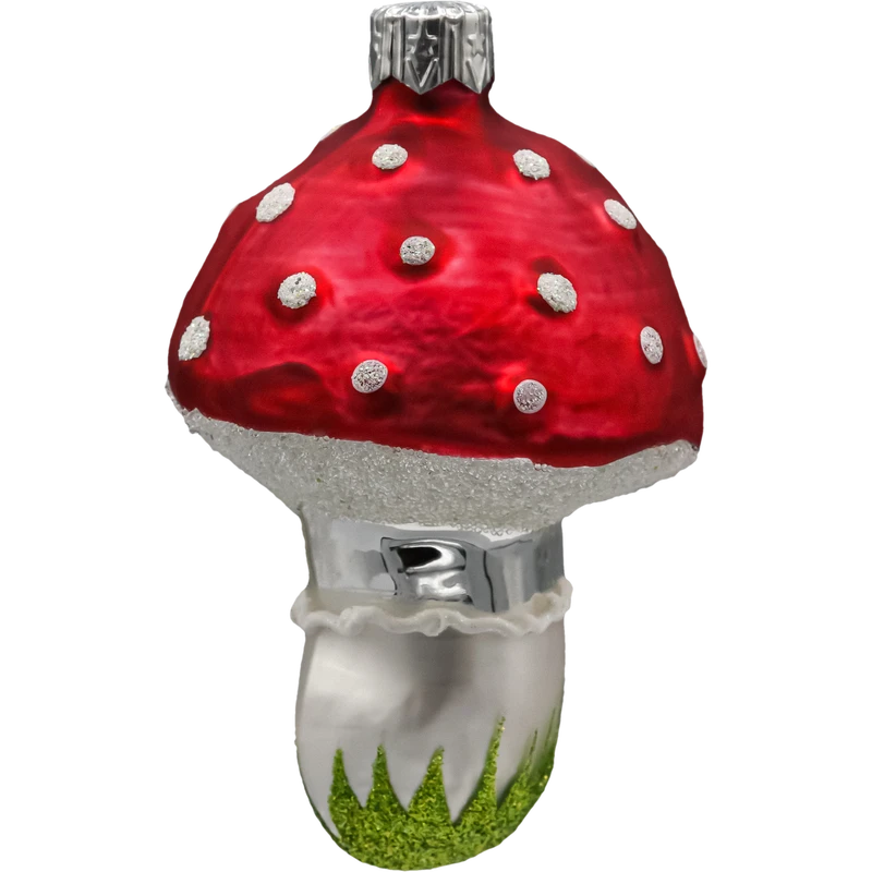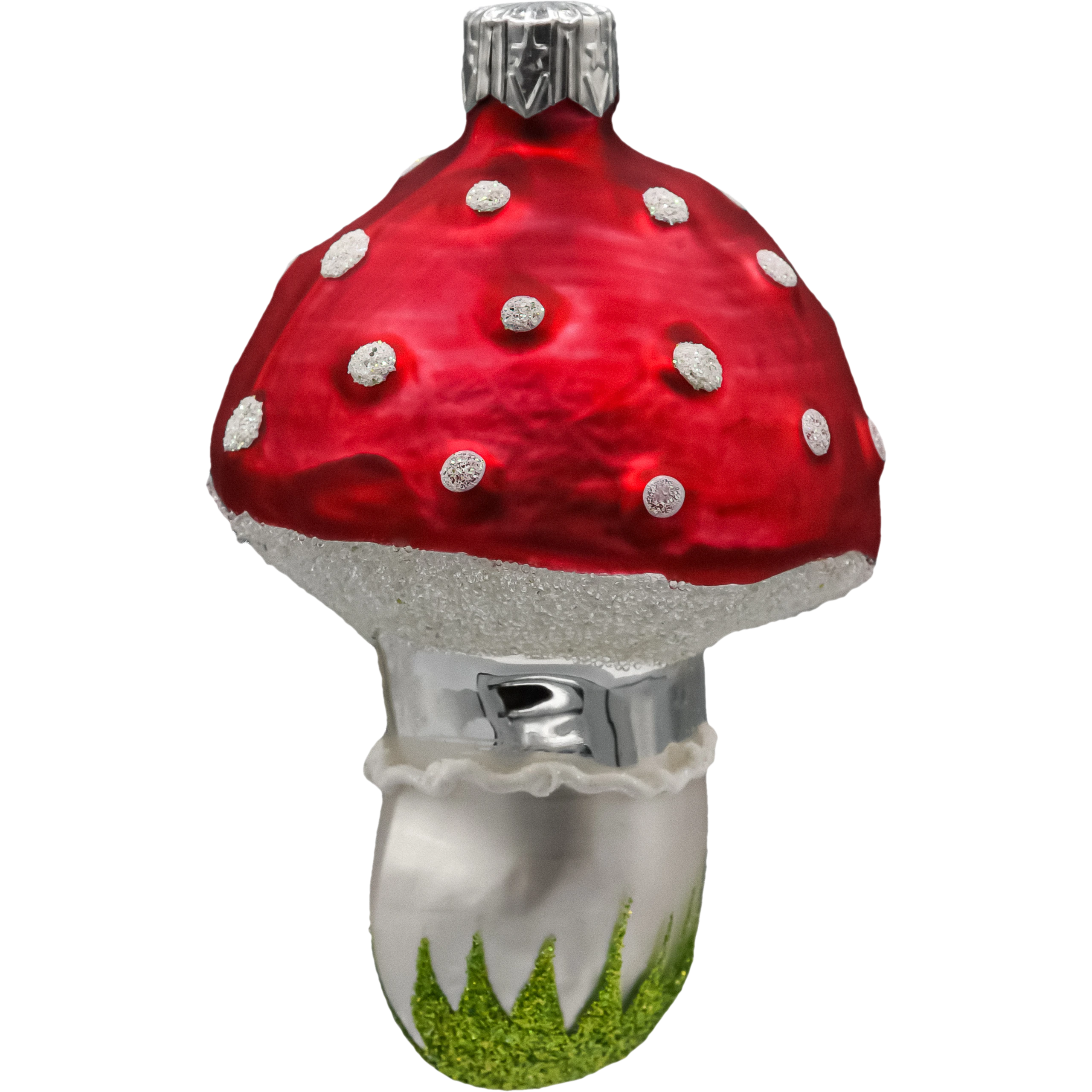 Wprowadź odrobinę leśnej magii na swoją choinkę dzięki tej wyjątkowej bombce choinkowej w kształcie czerwonego muchomora. To ręcznie wykonana bombka figurka, stworzona ze szkła dmuchanego, która urzeka żywą kolorystyką i eleganckim wykończeniem. Głęboka, połyskująca czerwień kapelusza pokryta jest białymi brokatowymi kropkami, a nóżkę dekorują zielone, iskrzące źdźbła trawy. Całość dopełnia subtelny srebrzysty połysk i klasyczna, metalowa zawieszka.