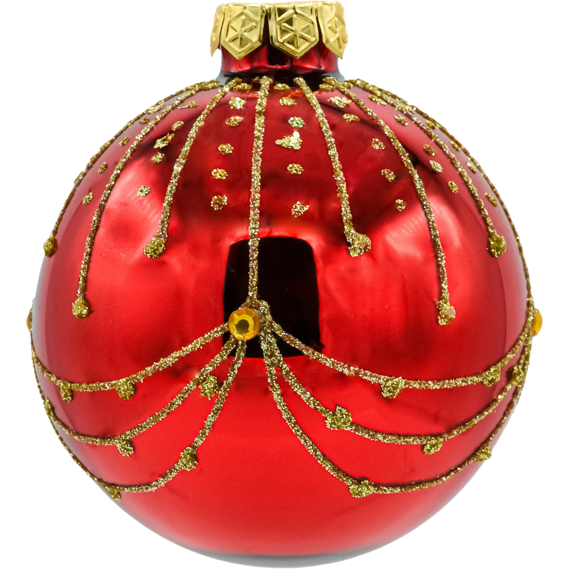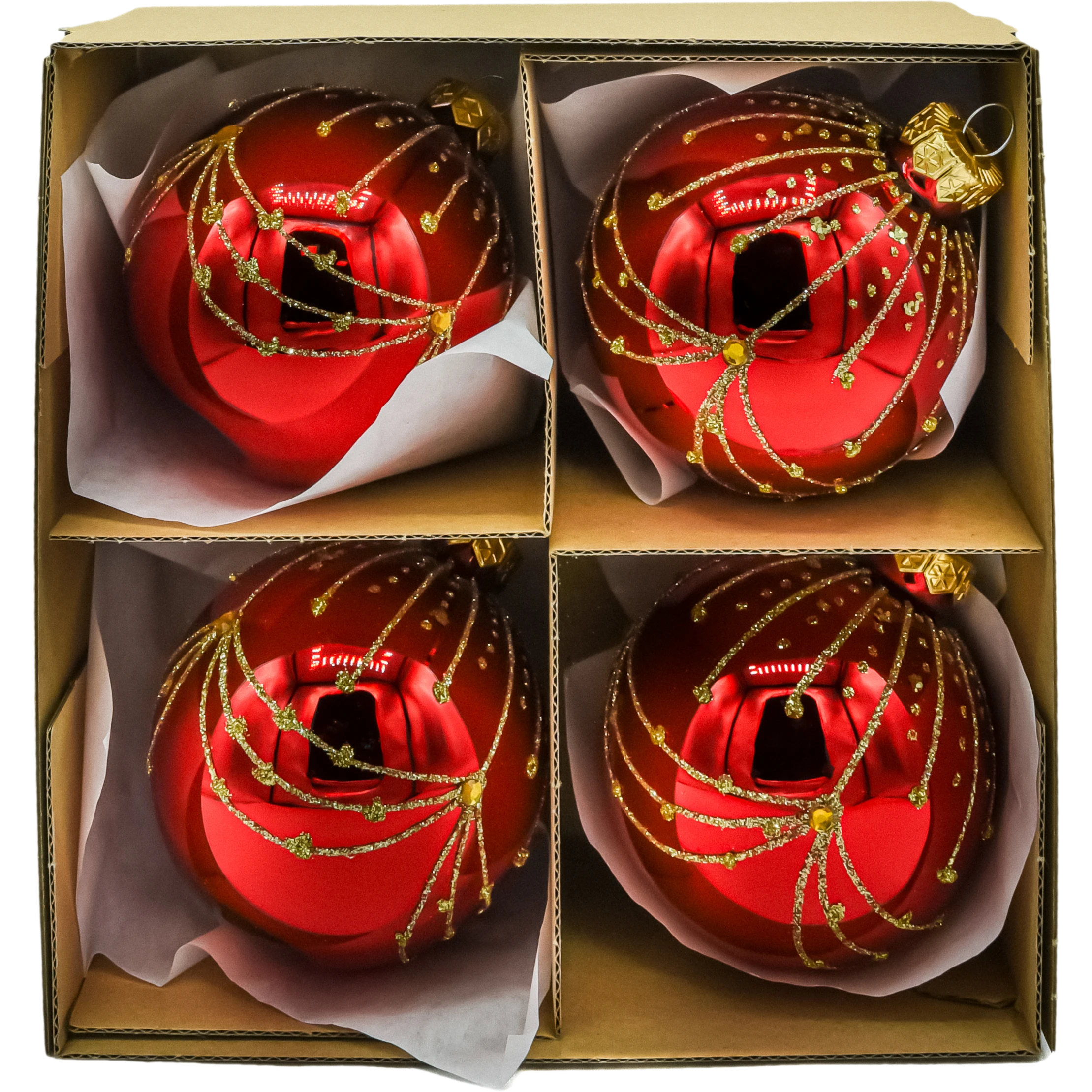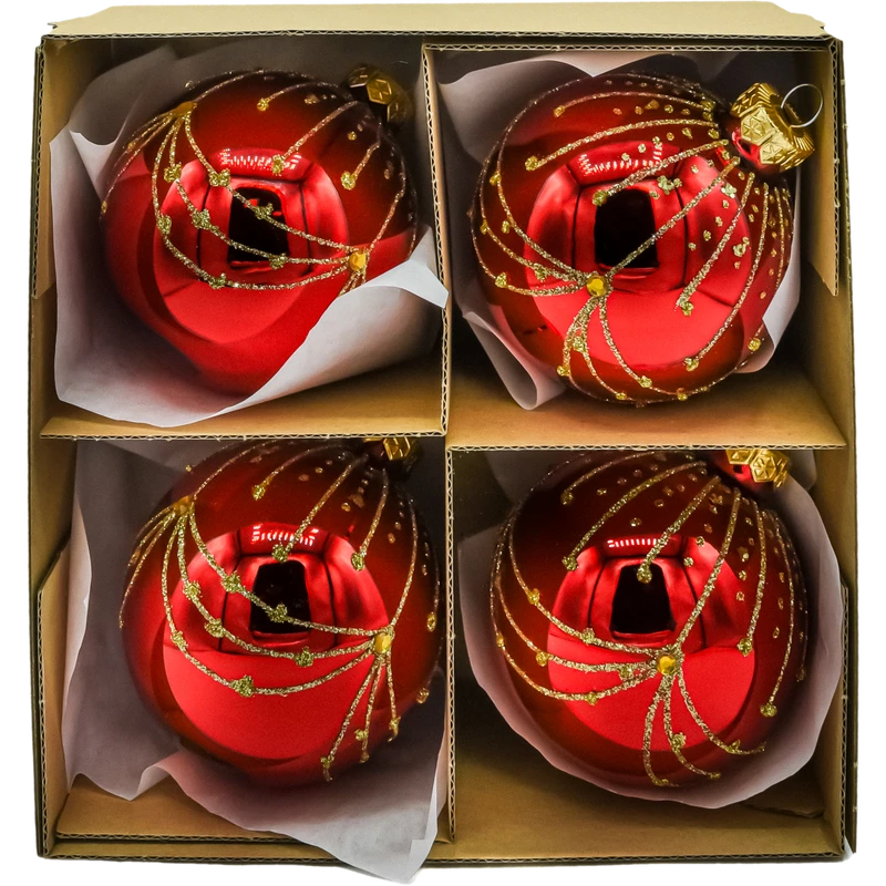 Zestaw 4 czerwonych, szklanych bombek 10 cm z złotym brokatowym ornamentem i kamyczkami. Lekkie, błyszczące, ze złotą metalową zawieszką; zapakowane w kartonowe pudełko z przekładkami. Idealne bombki choinkowe do klasycznych aranżacji w czerwieni i złocie – do domu, biura i na prezent.