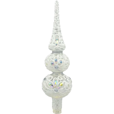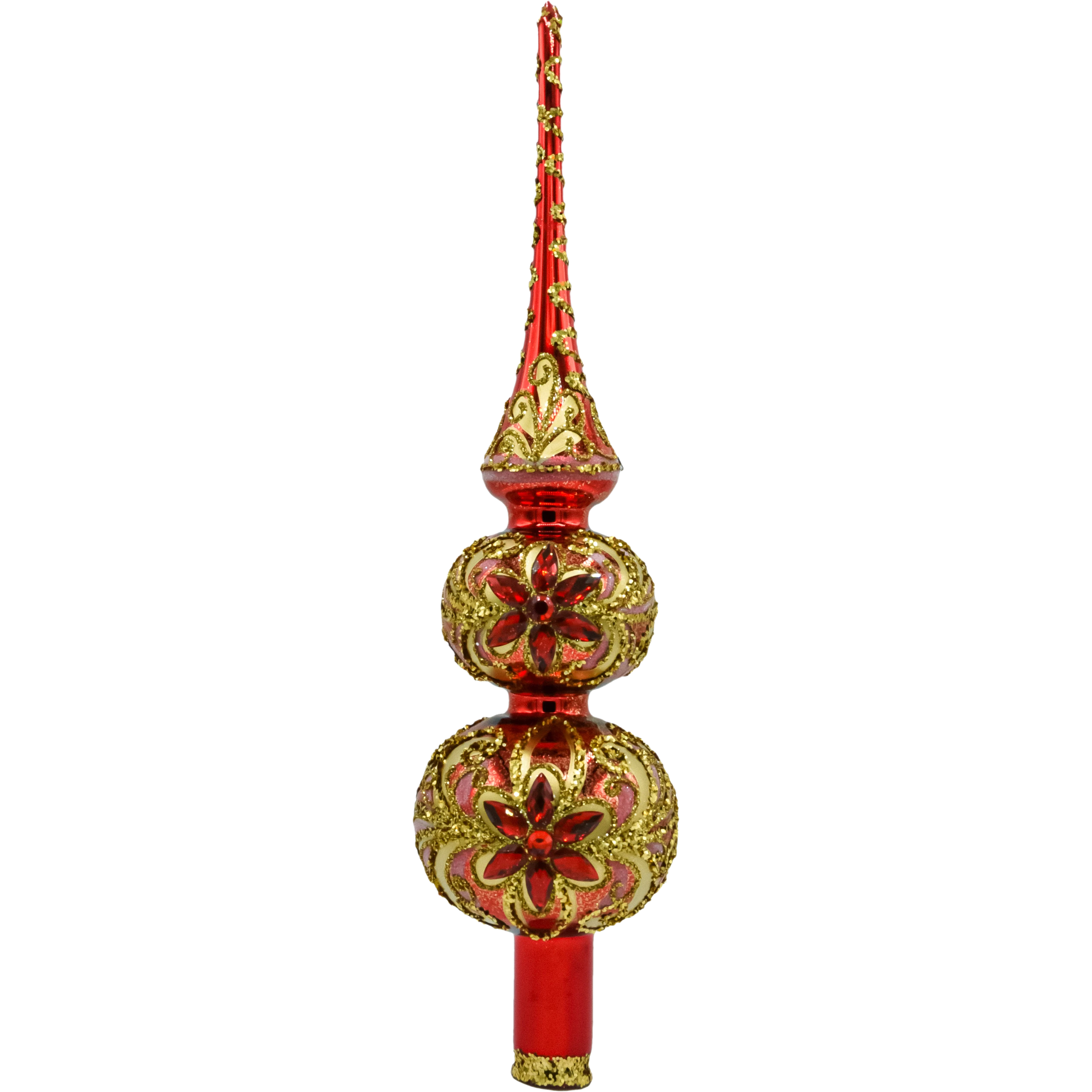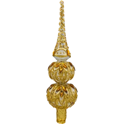 Wytworny szpic na choinkę wykonany z ręcznie dmuchanego szkła to ukoronowanie świątecznego drzewka w stylu glamour. Trójstopniowa forma z wysoką iglicą, dwoma kulami i elegancką tuleją mocującą została pokryta czerwonym lakierem o lustrzanym połysku, a następnie ręcznie dekorowana złotym brokatem, reliefowymi ornamentami i aplikacjami kamieni w odcieniach szlachetnej zieleni i rubinowej czerwieni. Każdy egzemplarz powstaje w polskiej pracowni – jest niepowtarzalny i kolekcjonerski.
