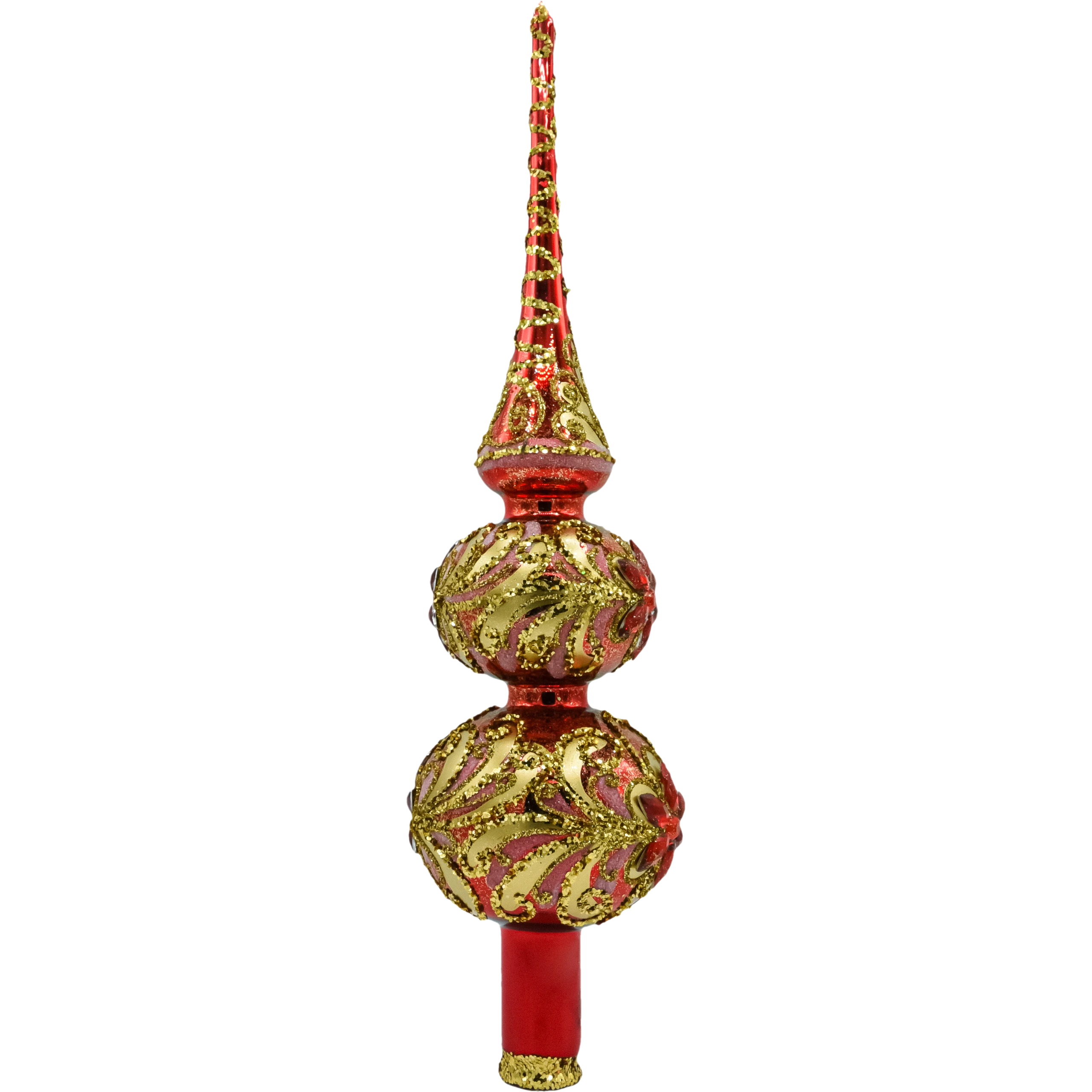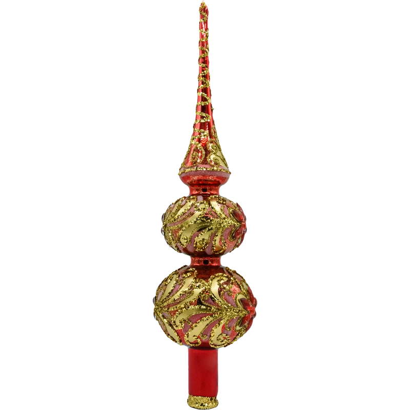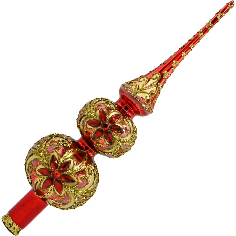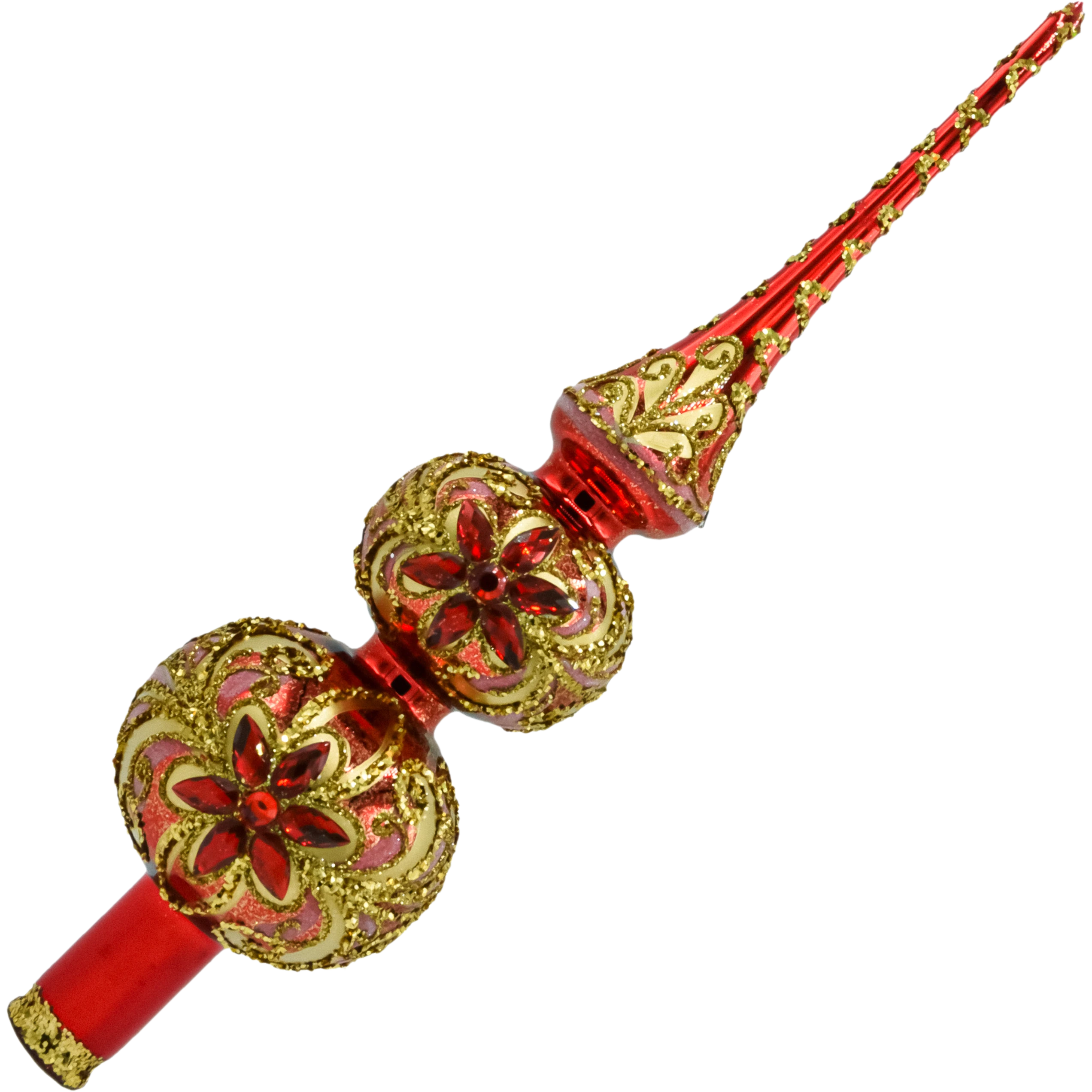 Bogato zdobiony czub na choinkę 30 cm z ręcznie dmuchanego szkła w czerwono-złotej palecie. Reliefowe ornamenty z brokatu i błyszczące kamienie tworzą królewski efekt glamour. Polska ręczna robota, klasyczna tuleja montażowa – idealne, ekskluzywne zwieńczenie świątecznego drzewka.