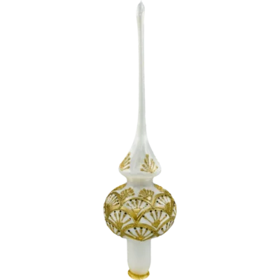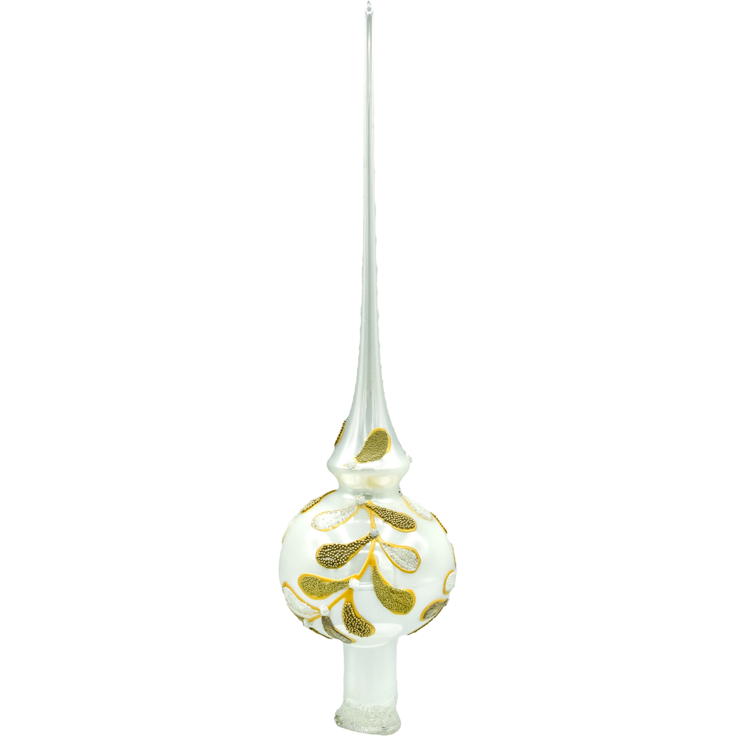 Biało-złoty szklany szpic na choinkę „Jemioła” – ręcznie dmuchany i malowany, ze smukłą iglicą i kulą zdobioną złotymi liśćmi oraz perłowymi jagodami. Standardowa tuleja, polska produkcja. Elegancki czub choinkowy pasujący do aranżacji glamour i scandi – idealny, by dodać choince wyrafinowanego blasku. (frazy: szpic choinkowy szklany, czubek na choinkę, biało złoty czub choinkowy, polskie bombki ręcznie malowane, ozdoby świąteczne ze szkła).