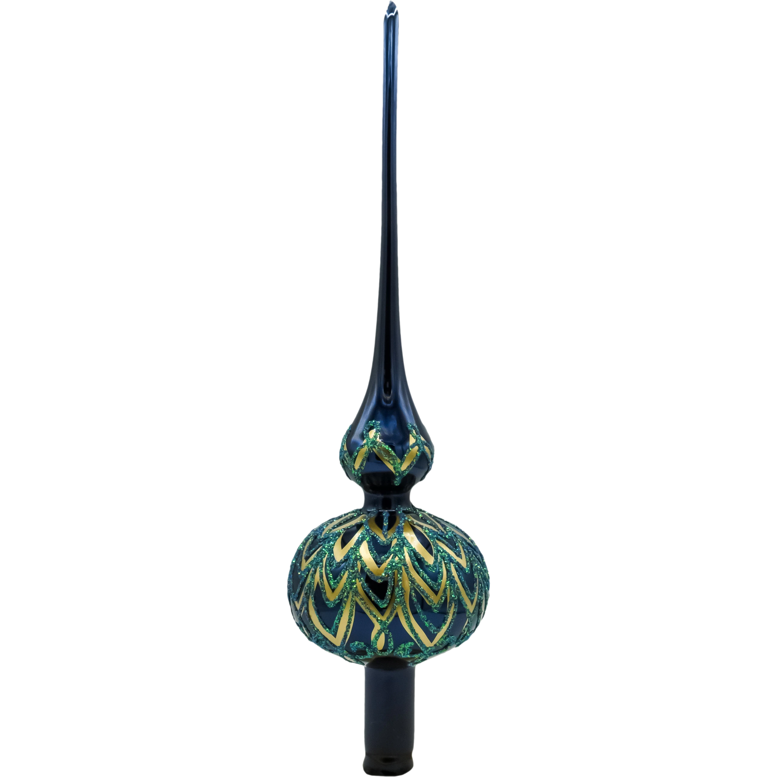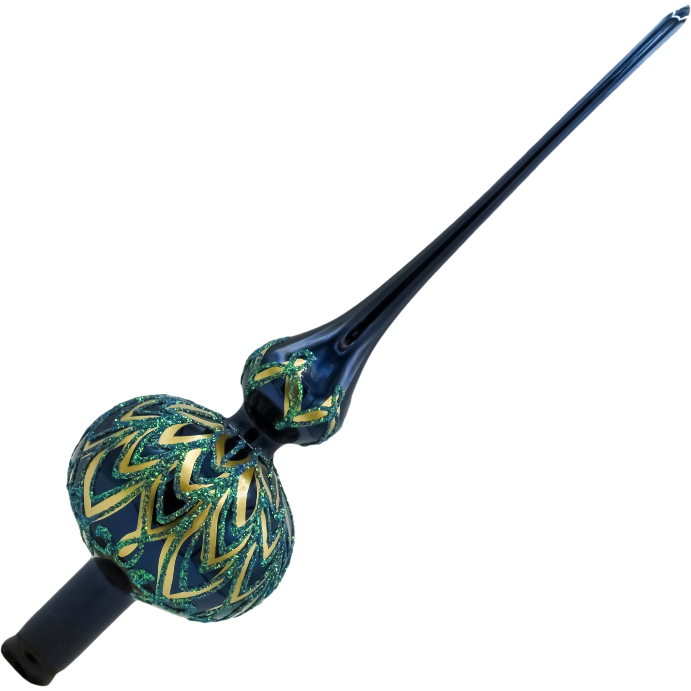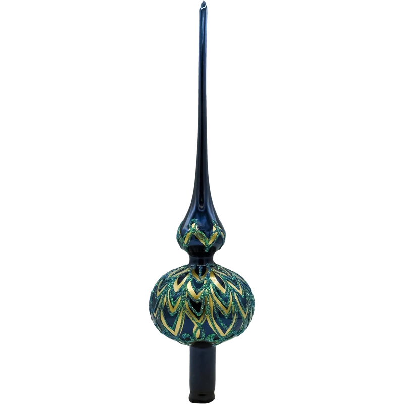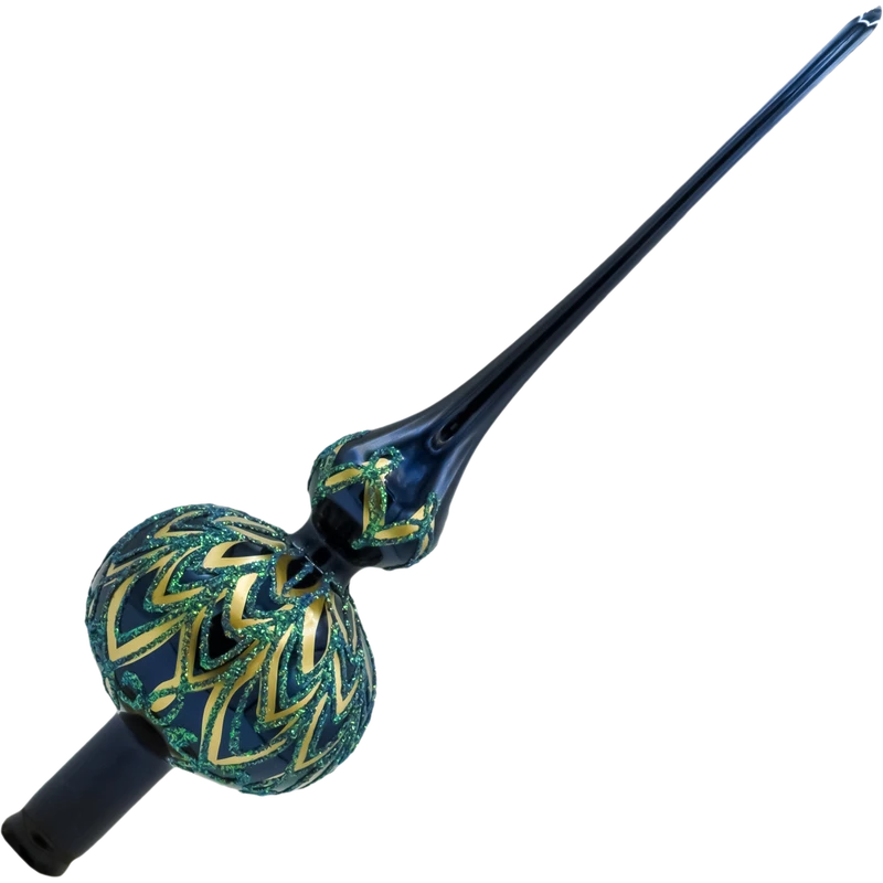 Elegancki szklany czubek na choinkę w kolorze granatu i zieleni ze złotymi zdobieniami. Ręcznie malowany szpic świąteczny z polskiego szkła. Idealna ozdoba na szczyt choinki – klasyczny, luksusowy styl.