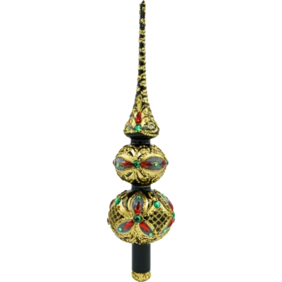 Czubek charakteryzuje się smukłą, stożkowatą formą o wysokim zakończeniu oraz kulistą podstawą ozdobioną misternym, choinkowym wzorem ze złotych konturów i zielonych brokatowych liści. Całość sprawia wrażenie lekkości i harmonii, a delikatny połysk szkła odbija światło choinkowych lampek, tworząc magiczną aurę.