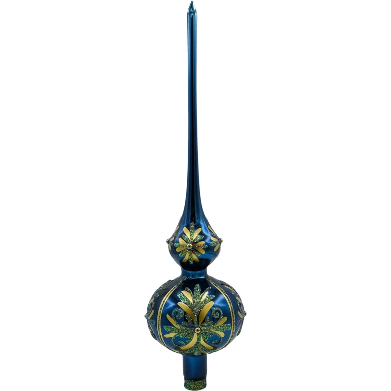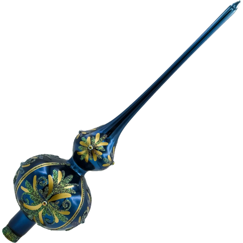 Elegancki szklany czubek na choinkę „Niebieski Pałac” z ręcznie malowanymi zdobieniami i błyszczącymi kryształkami. Granatowy szpic bożonarodzeniowy ze szkła – idealne zwieńczenie choinki.