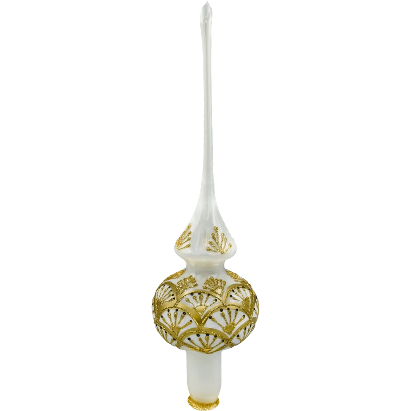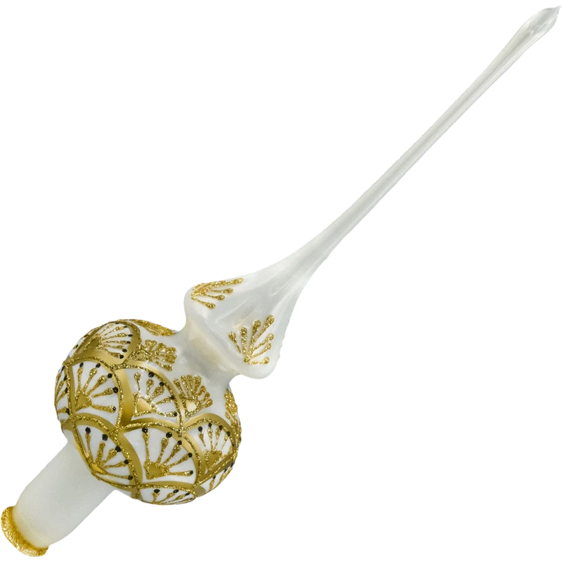 Szklany czubek na choinkę w biało-złotym kolorze z ornamentem wachlarzy. Ręcznie malowany, elegancki szpic ze szkła dmuchanego. Idealny jako świąteczna ozdoba klasyczna i art déco.