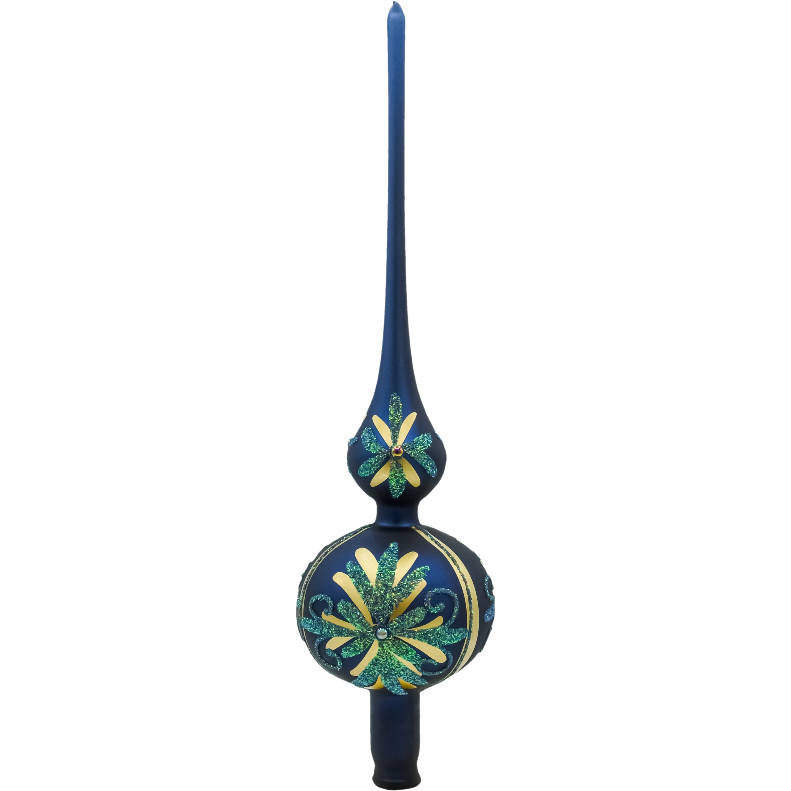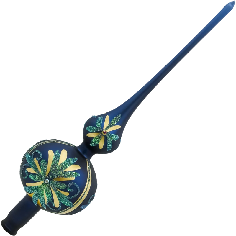 Ręcznie zdobiony czubek na choinkę „Szafirowa Gwiazda” z matowego szkła, z brokatowymi ornamentami w kolorze złota i zieleni. Szklany szpic choinkowy w eleganckim, szafirowym odcieniu – perfekcyjne wykończenie bożonarodzeniowego drzewka.
