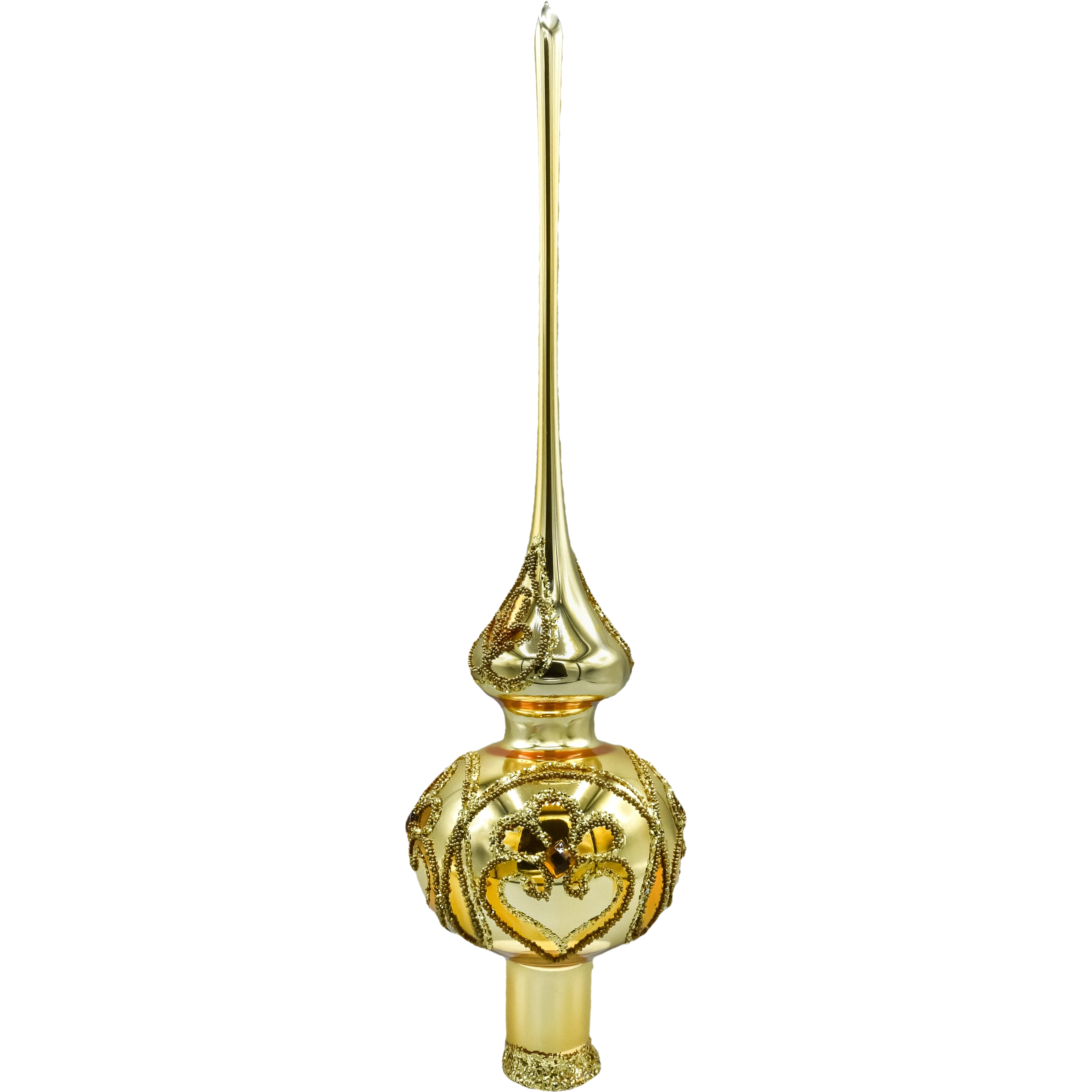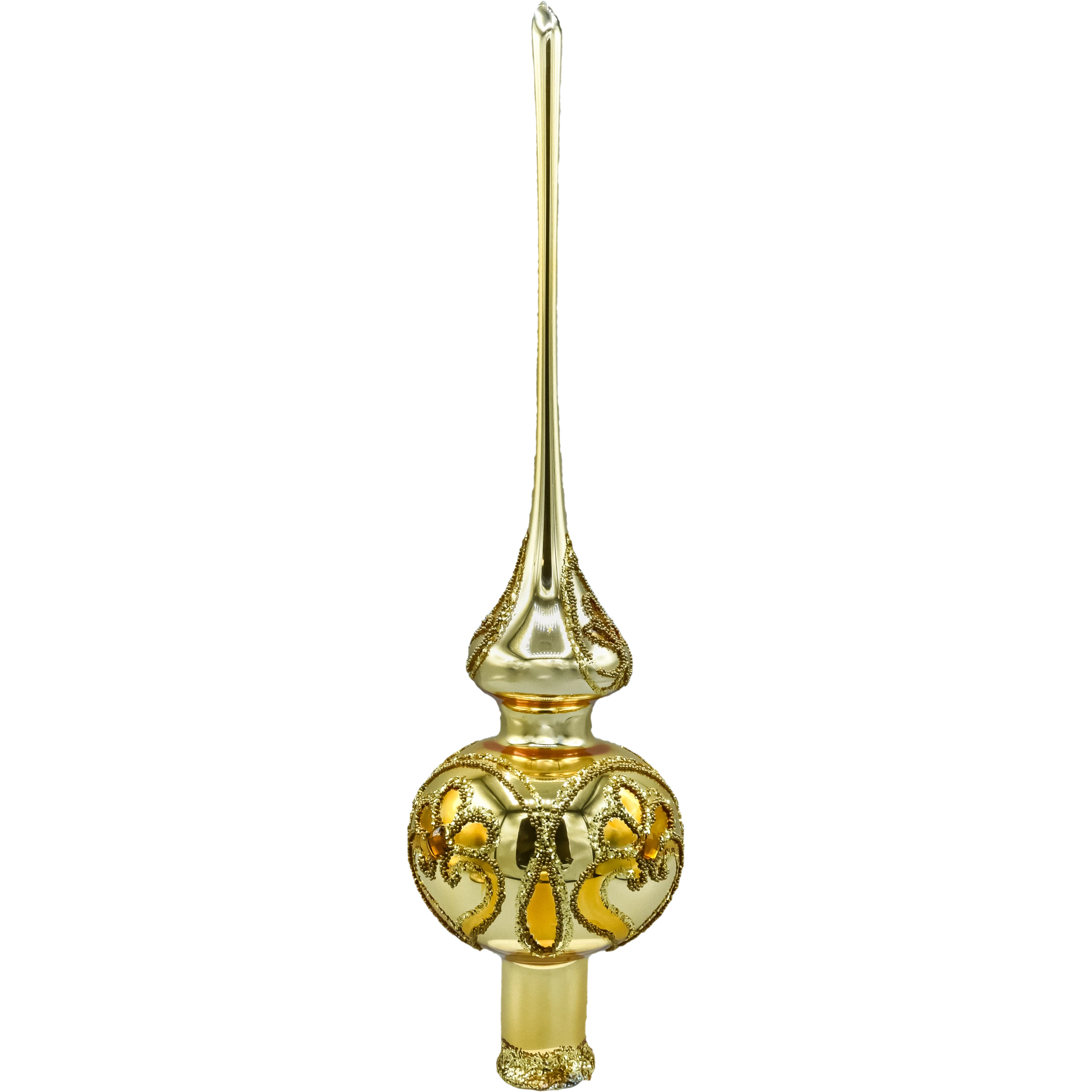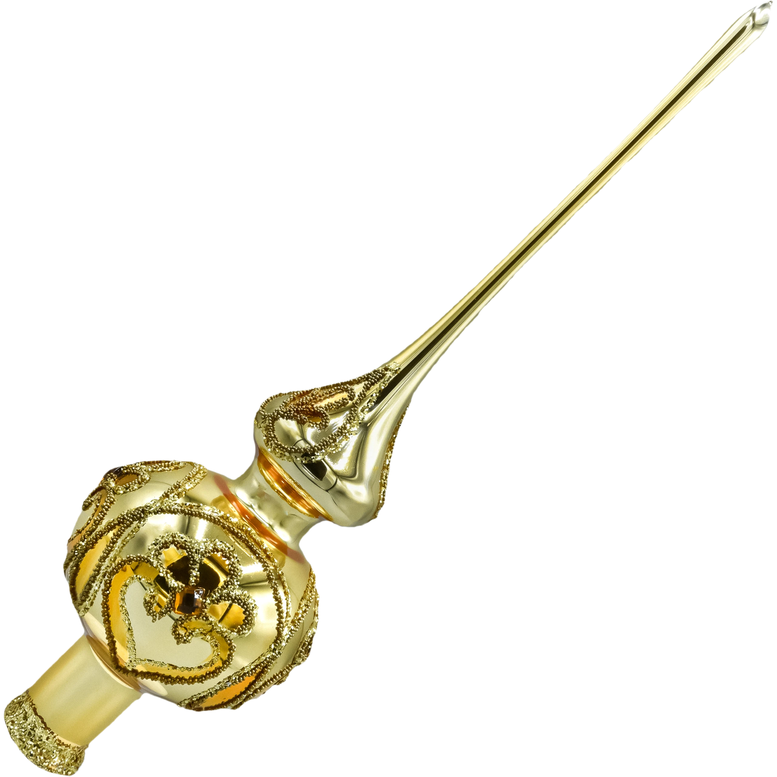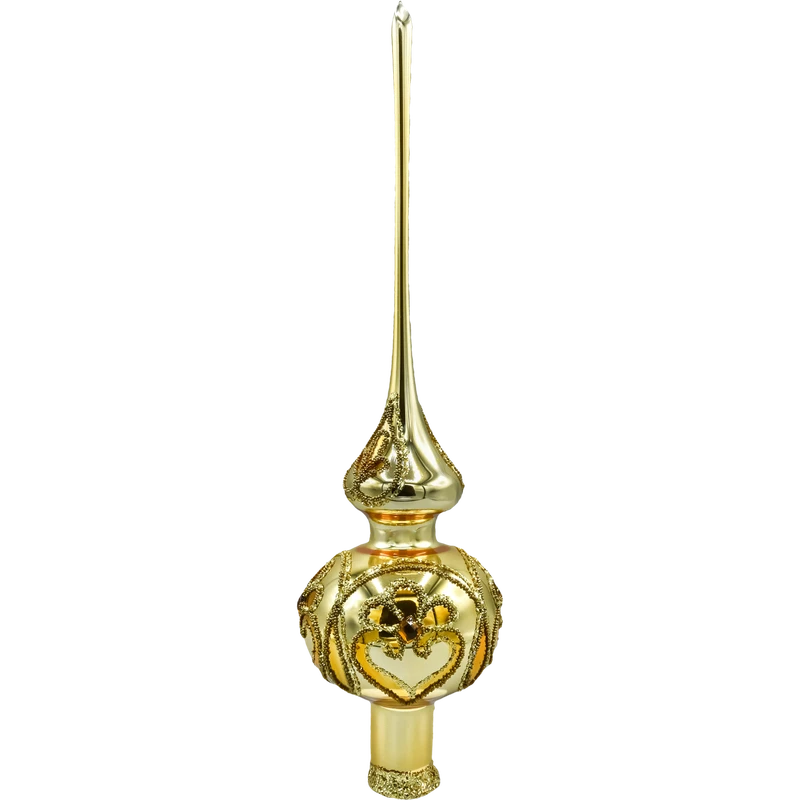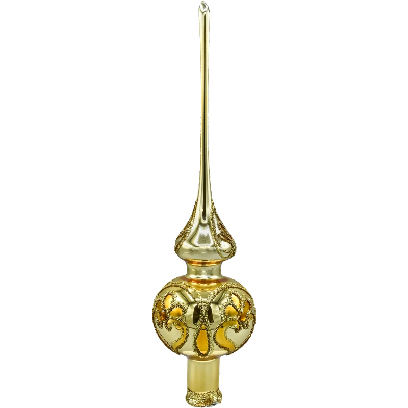 Wytworny szpic/ czub choinkowy w kolorze ciepłego złota, który nada Twojej choince perfekcyjne zwieńczenie i pałacowy blask. Ręcznie wydmuchany ze szkła i misternie malowany w polskiej pracowni, zachwyca połyskliwą iglicą oraz dekorowaną kulą z roślinnymi ornamentami. Brokatowe reliefy i wstawki przypominające kryształki pięknie odbijają światło lampek, dzięki czemu szpic wygląda jak biżuteria choinki – w stylu glamour, klasycznym lub vintage.