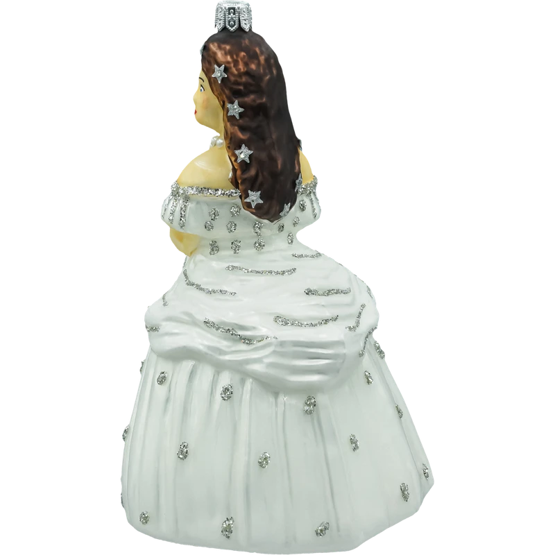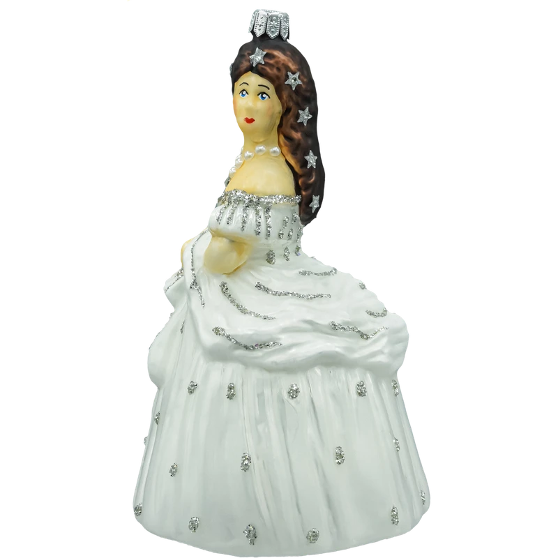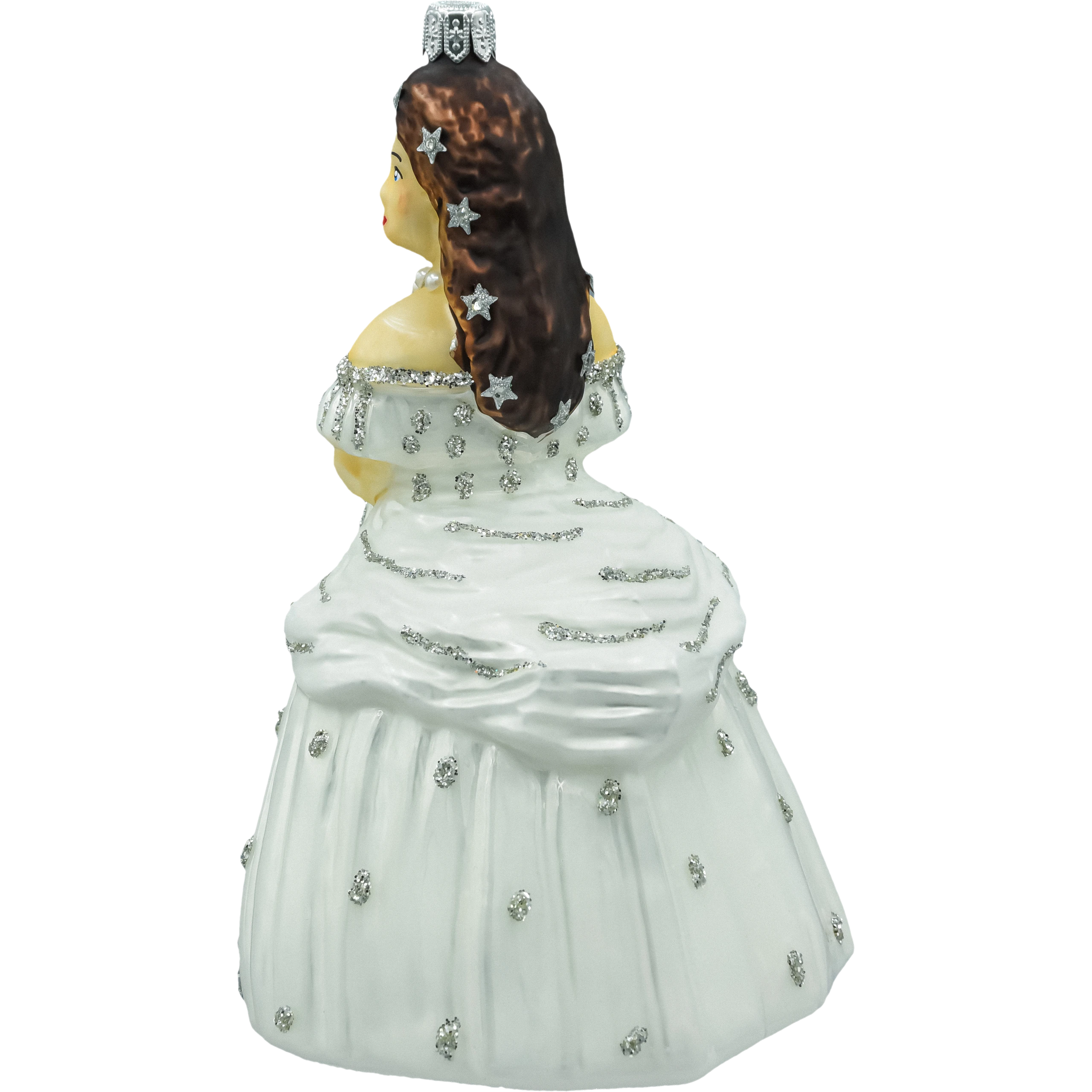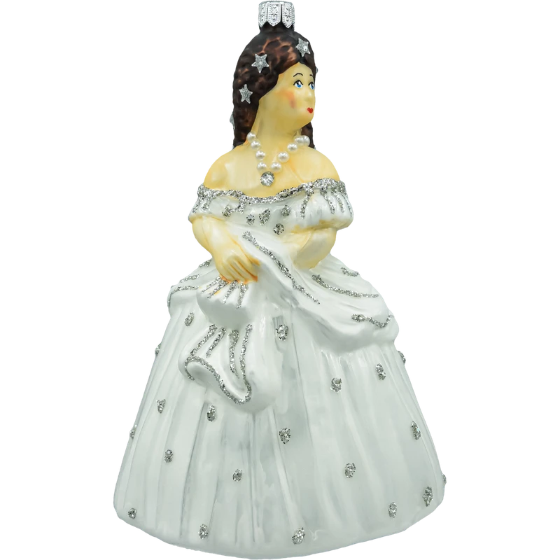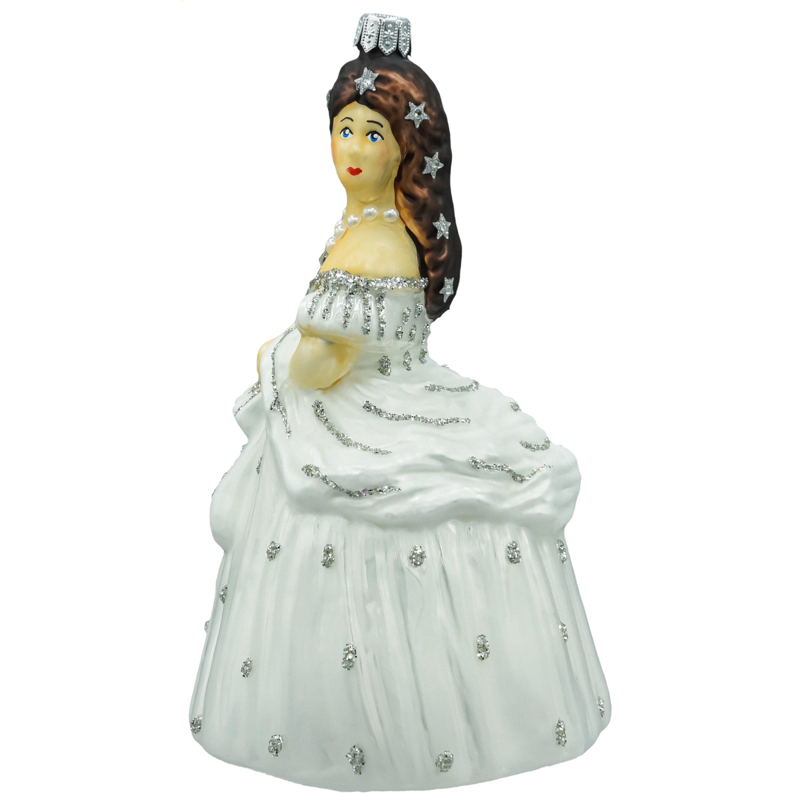 Ręcznie malowana bombka szklana – Księżniczka Sisi w białej sukni. Figuralna ozdoba z brokatem i perełkami, idealna do aranżacji glamour i na prezent świąteczny.