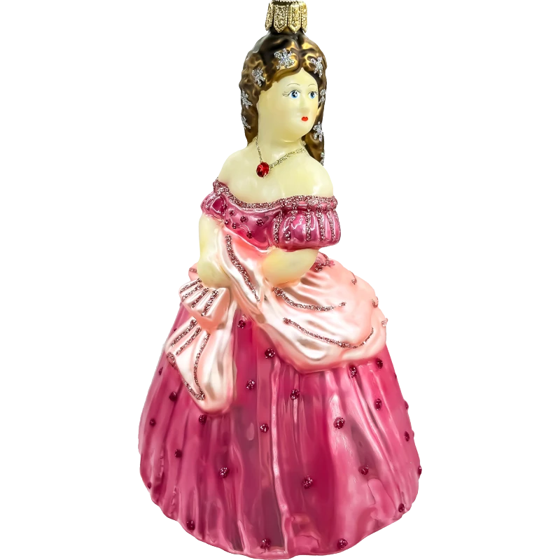 Bombka została wykonana z najwyższej jakości szkła i ręcznie pomalowana przez doświadczonych artystów. Delikatne detale, takie jak bogato zdobiona suknia z brokatowymi wzorami i drobnymi, błyszczącymi akcentami, nadają jej niepowtarzalnego uroku. Twarz damy została subtelnie wymodelowana, podkreślając piękno i elegancję tej postaci. Jej fryzura oraz naszyjnik z czerwonym kamieniem dopełniają całości, tworząc obraz wytworności i klasy.