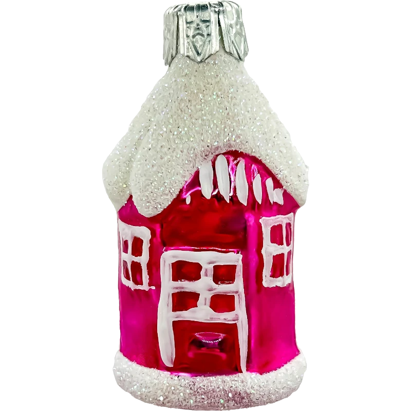 Wprowadź wyjątkowy, nostalgiczny klimat do swojego świątecznego wnętrza dzięki tej szklanej bombce w kształcie charakterystycznego domku z czasów PRL-u z lat 80., w pięknym, intensywnie różowym kolorze. Ręcznie wykonana i ozdobiona, bombka przyciąga uwagę swoim niecodziennym odcieniem oraz ośnieżonym, brokatowym dachem, który dodaje jej uroku zimowej scenerii.