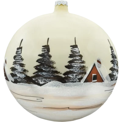 Ręcznie dekorowana bombka choinkowa „Domek w śniegu” – szklana ozdoba z brokatem i kryształkami, idealna do zimowych, eleganckich aranżacji świątecznych.