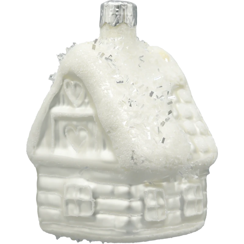 Domek zachwyca detalami: widoczne są zarysy okien, drzwi oraz dekoracyjnego serca nad wejściem. Mimo że kolorystyka jest minimalistyczna, to forma i wykończenie sprawiają, że ozdoba prezentuje się niezwykle elegancko i delikatnie. Dzięki srebrnemu uchwytowi z zawieszką, bombka idealnie komponuje się z choinką utrzymaną w stylu glamour, skandynawskim czy klasycznym, tworząc zimową krainę w zaciszu domowego salonu.