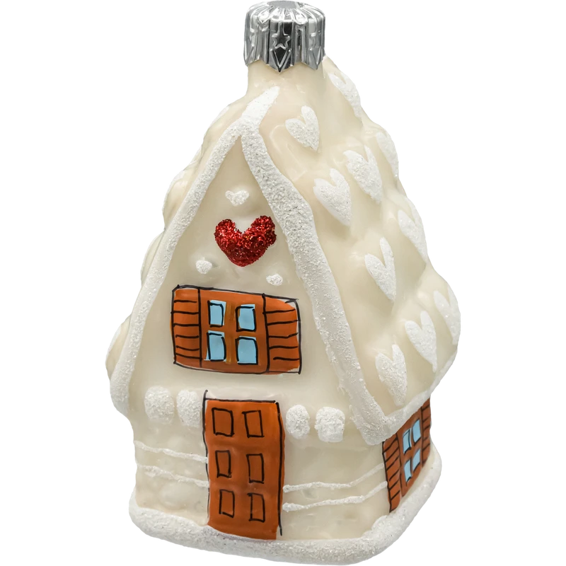 Szklana bombka choinkowa w kształcie kremowego domku z sercem – ręcznie zdobiona ozdoba bożonarodzeniowa w stylu piernikowym. Idealna na choinkę lub na prezent.