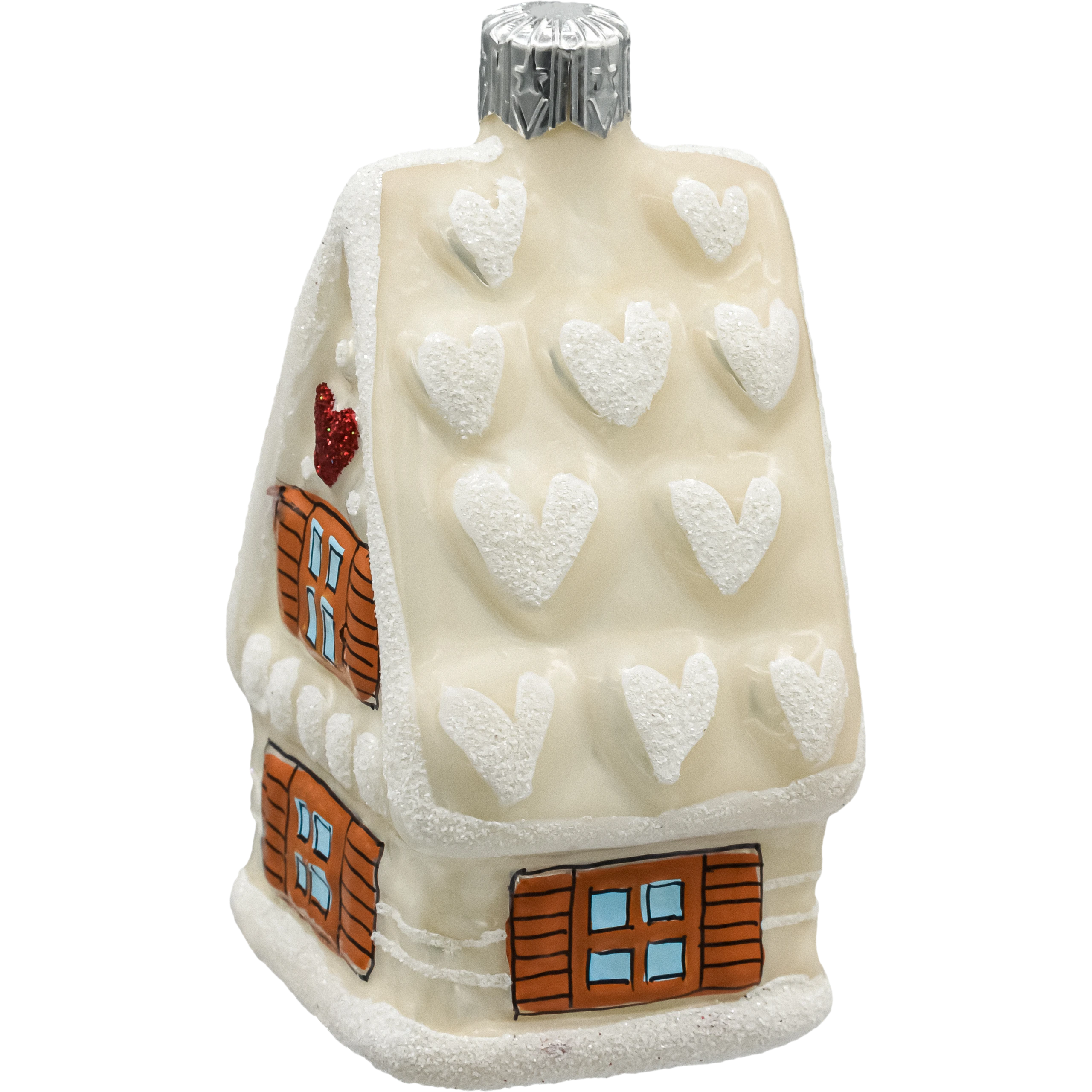 Jej delikatna, mleczno-kremowa kolorystyka została uzupełniona białym, brokatowym śniegiem oraz wypukłymi sercami na dachu, które symbolizują ciepło domowego ogniska. Na fasadzie domku znajduje się brokatowe czerwone serduszko, przyciągające wzrok i dodające całości uroczego, romantycznego akcentu. Otwory okienne oraz drzwi zdobione są ręcznie malowanymi detalami w odcieniu drewna i błękitnego szkła, tworząc efekt przytulnego domostwa w zimowej scenerii.