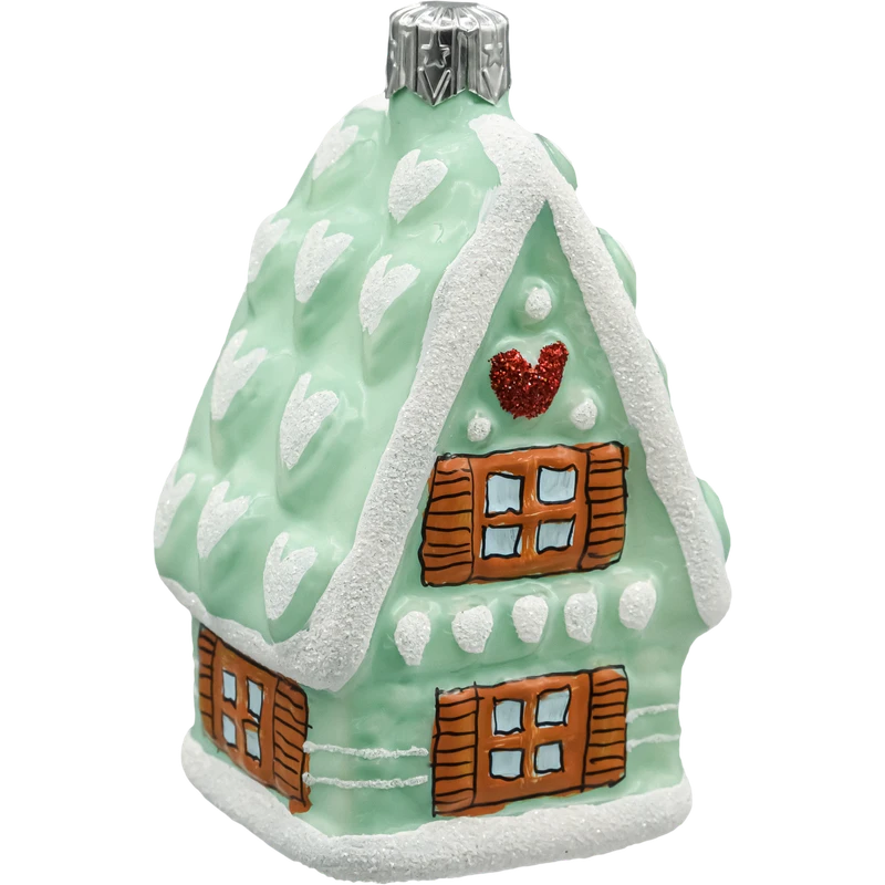 Zachwycająca szklana bombka choinkowa w kształcie domku piernikowego w kolorze miętowym to wyjątkowa ozdoba świąteczna, która wprowadzi do Twojego wnętrza nutę bajkowego uroku. Ręcznie malowany, pastelowy domek z efektownym dachem ozdobionym wypukłymi białymi sercami i brokatowymi zdobieniami przywołuje klimat domowego ciepła i zimowej magii.