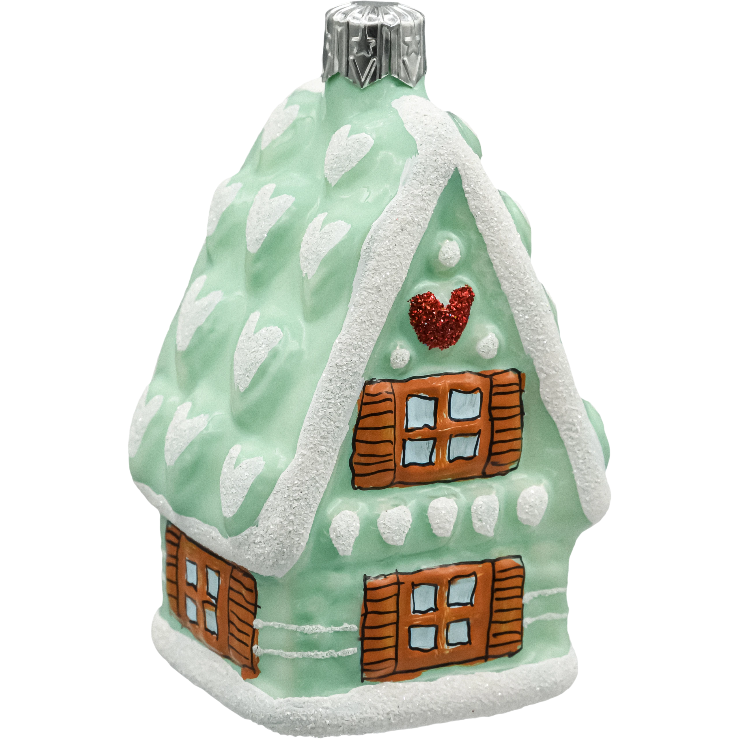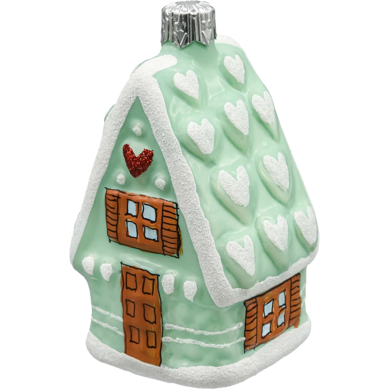 Ręcznie malowana bombka choinkowa w kształcie miętowego domku piernikowego ze szkła. Zdobiona sercami, brokatem i śnieżną bielą – idealna dekoracja świąteczna i pomysł na prezent bożonarodzeniowy.