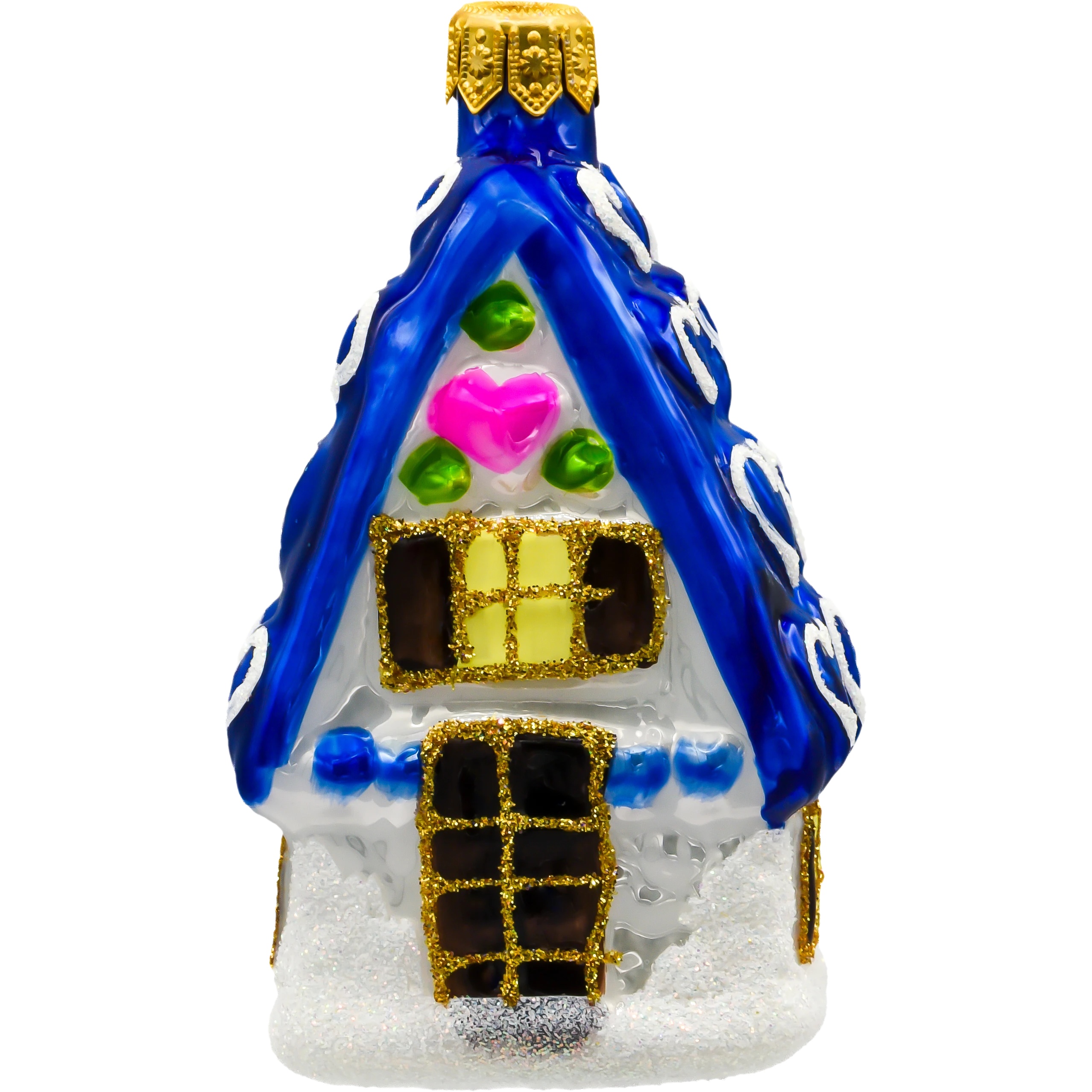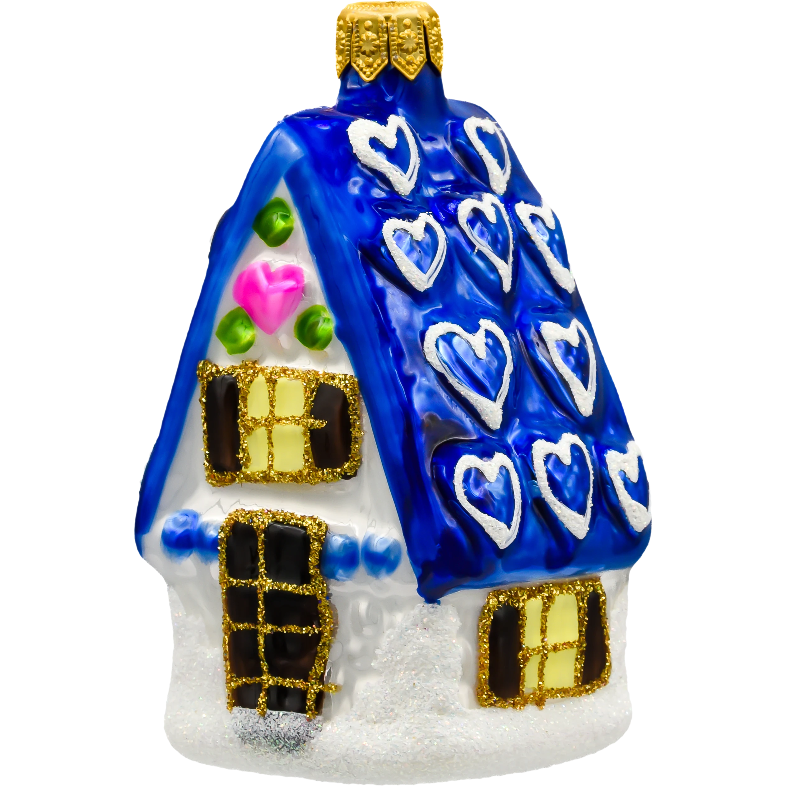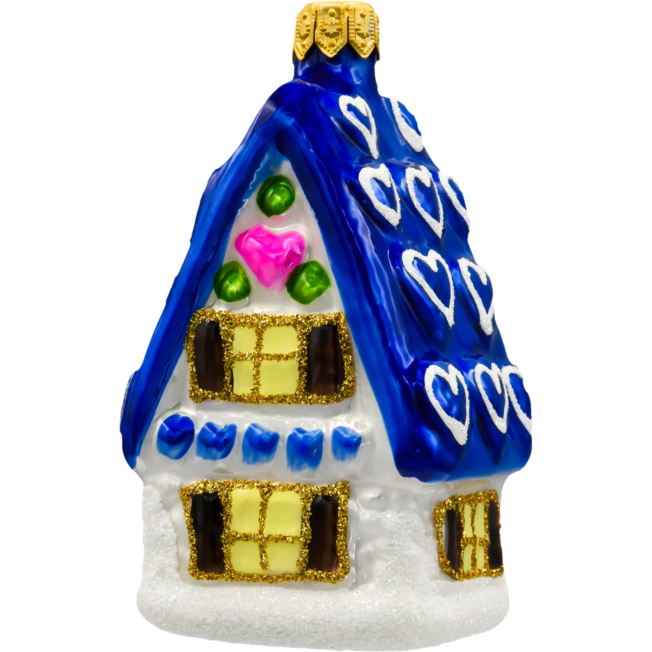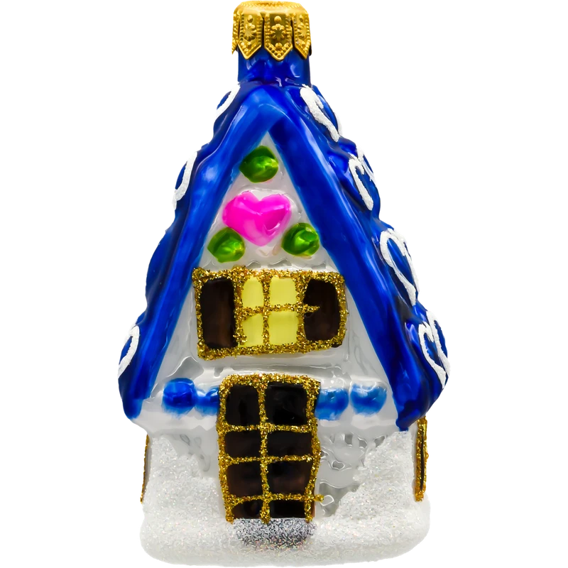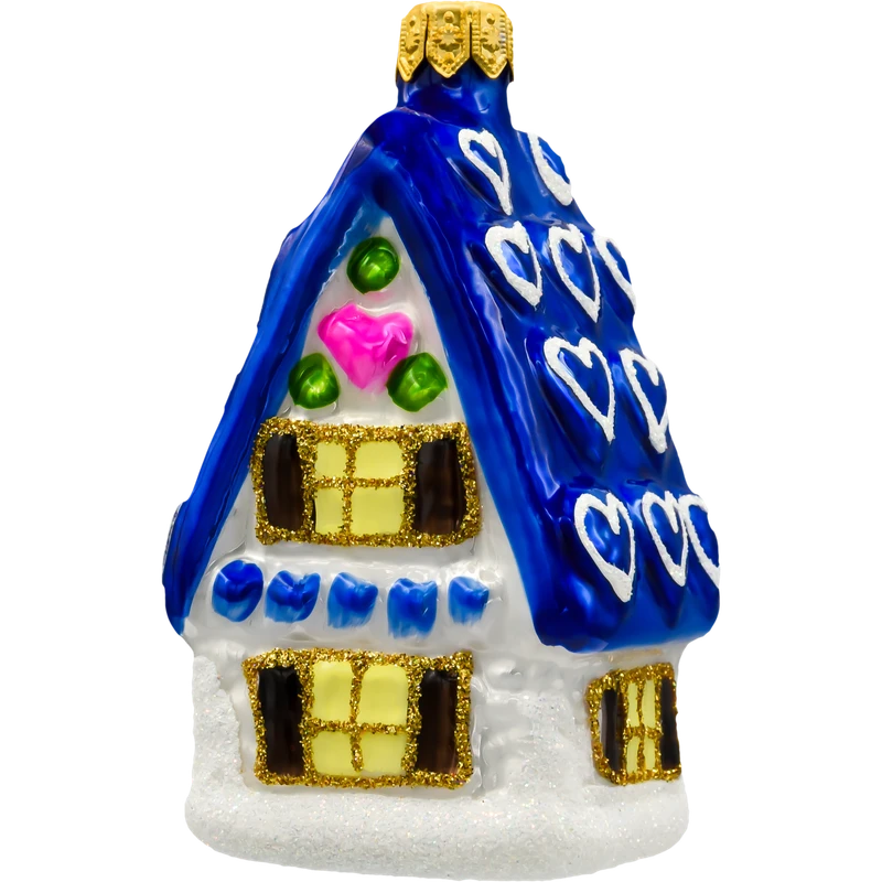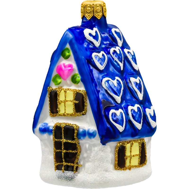 Szklana bombka choinkowa w kształcie urokliwego domku z niebieskim dachem ozdobionym serduszkami. Ręcznie malowana i zdobiona brokatem – idealna dekoracja choinkowa w stylu bajkowym i retro.