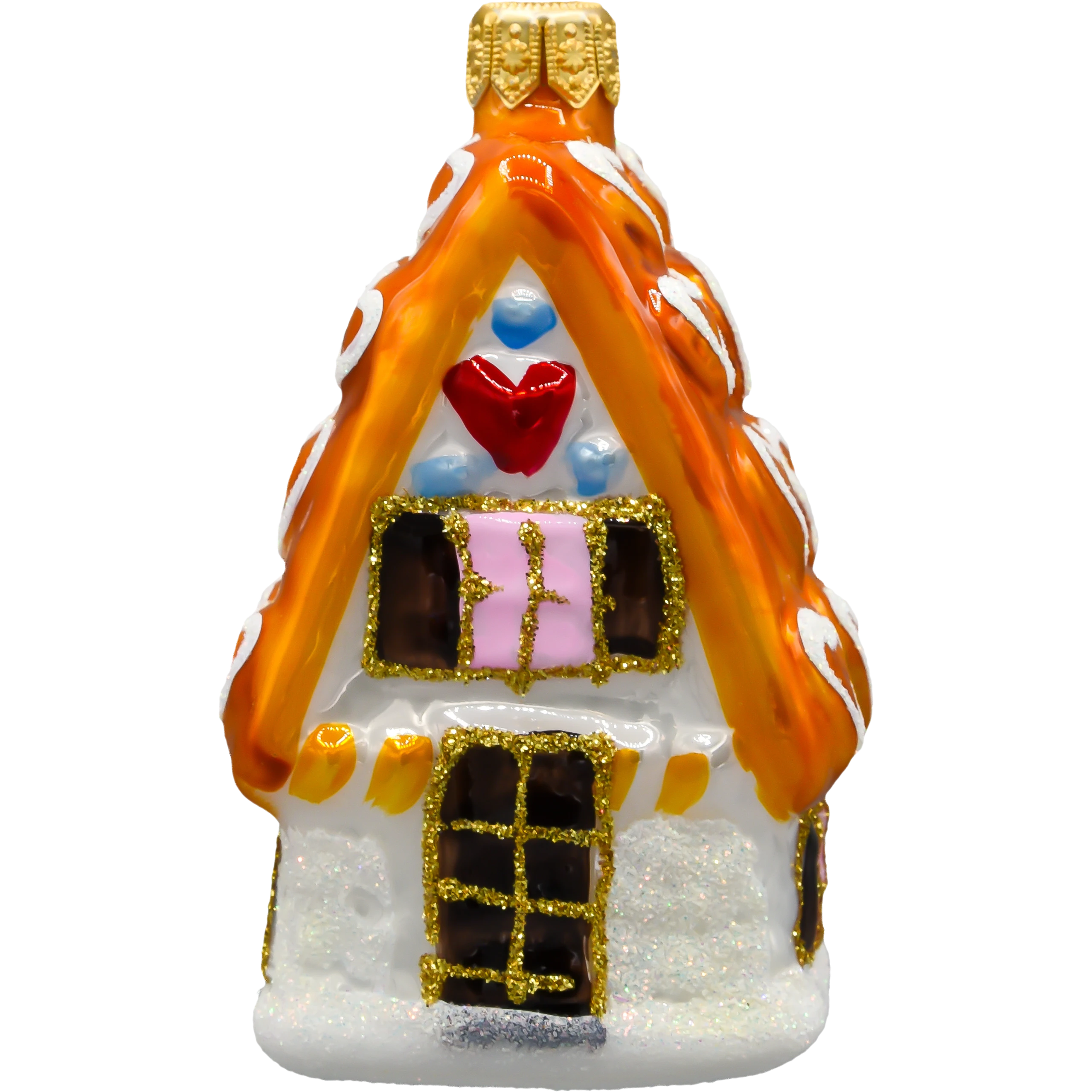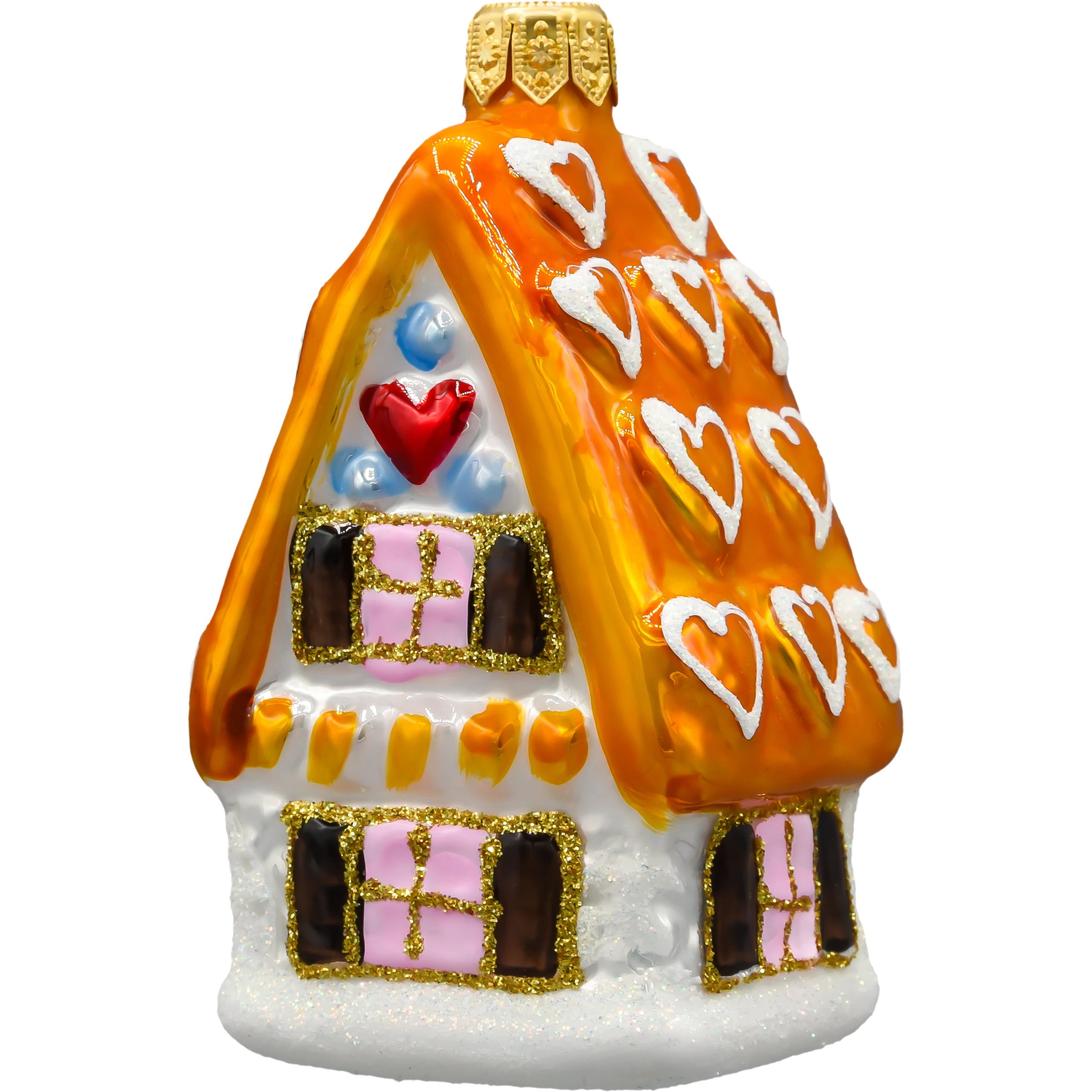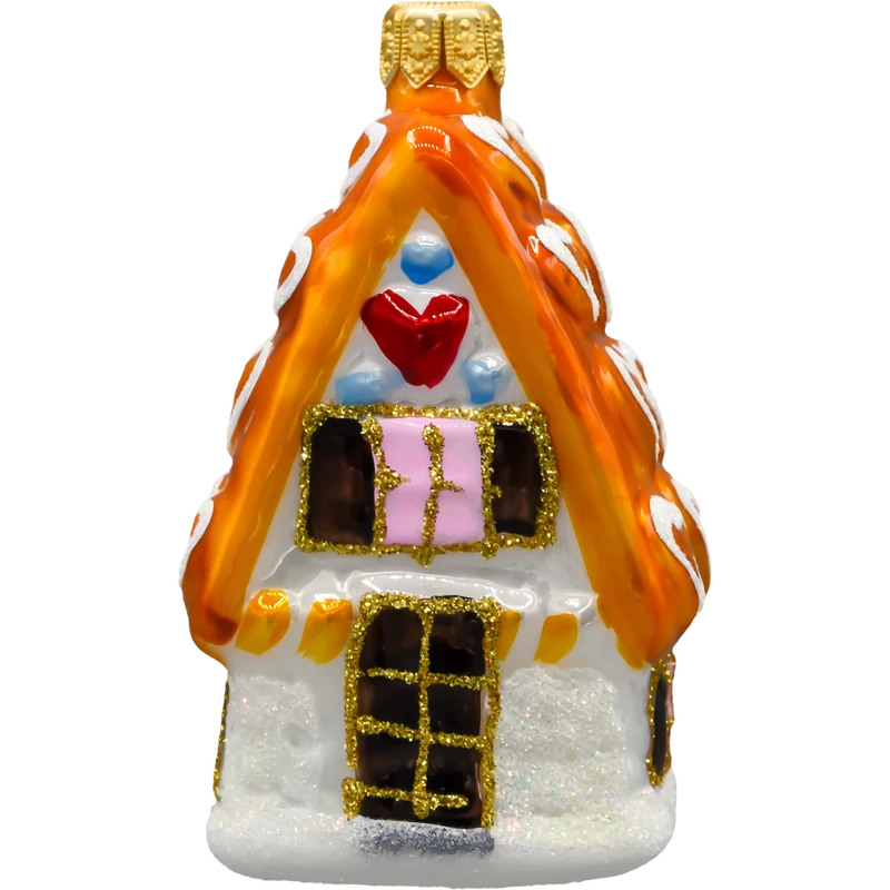 Ręcznie malowana bombka choinkowa w kształcie domku piernikowego. Szklana ozdoba z brokatem i świątecznymi detalami – idealna na choinkę lub na prezent!