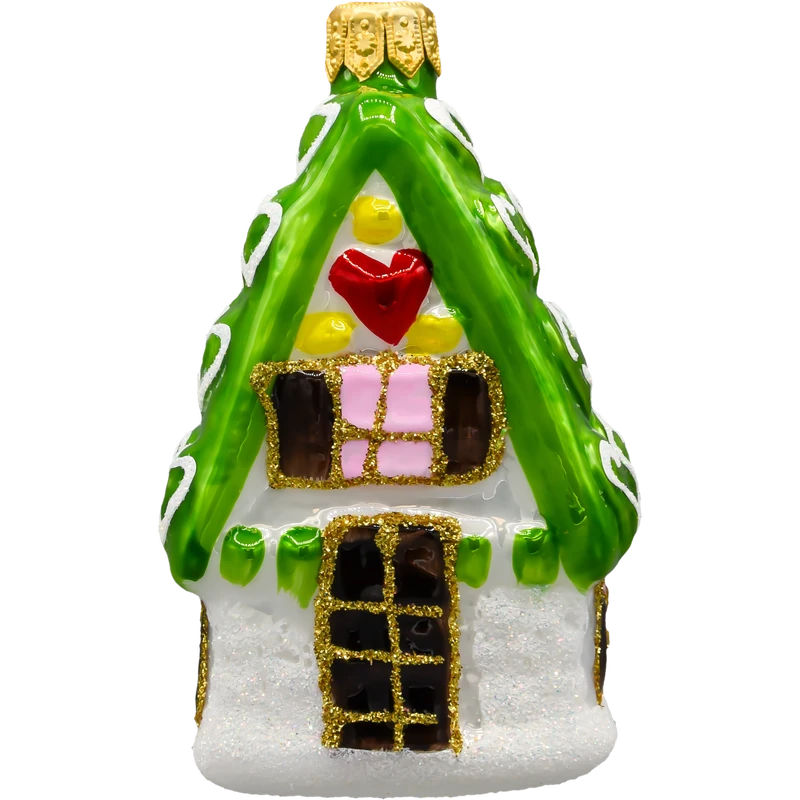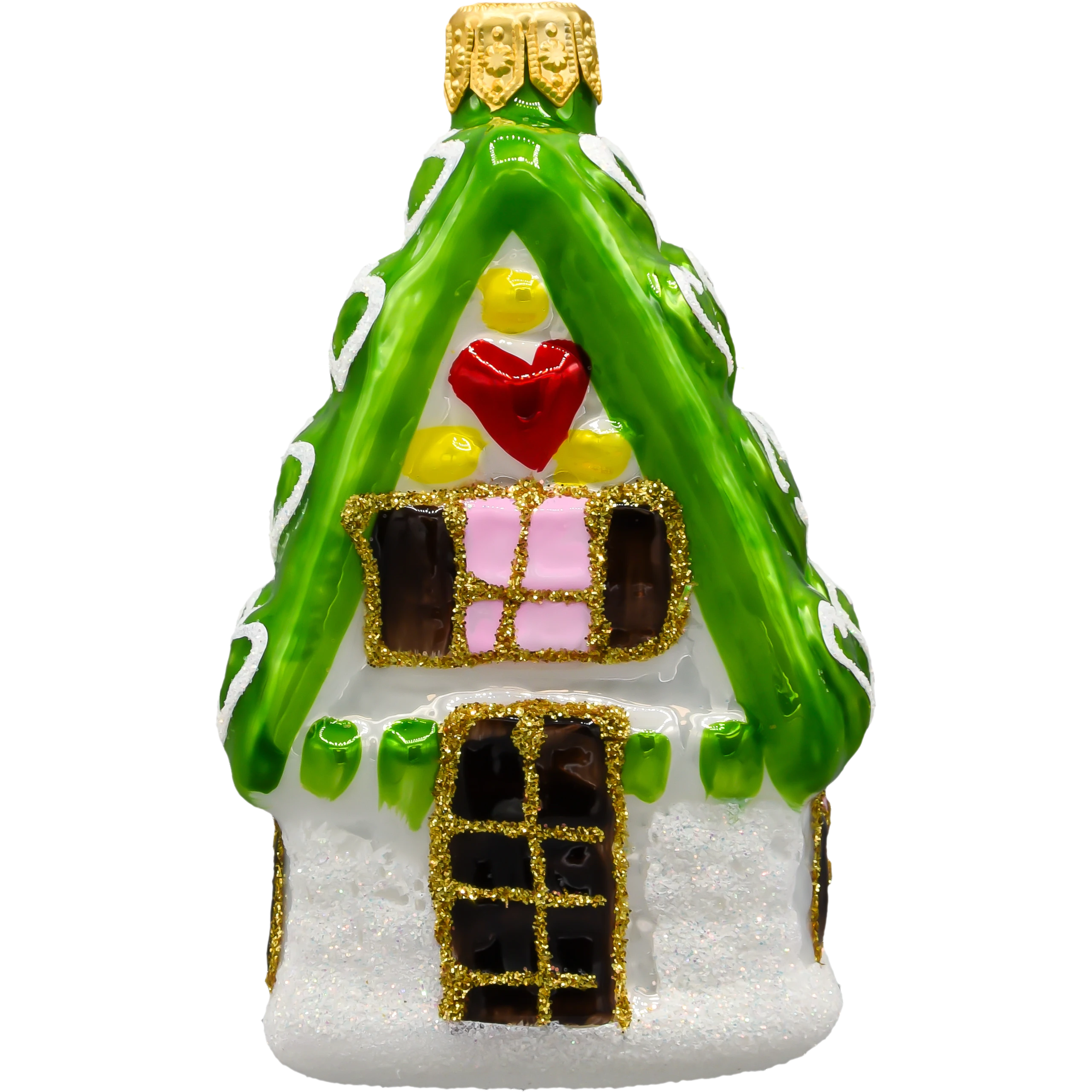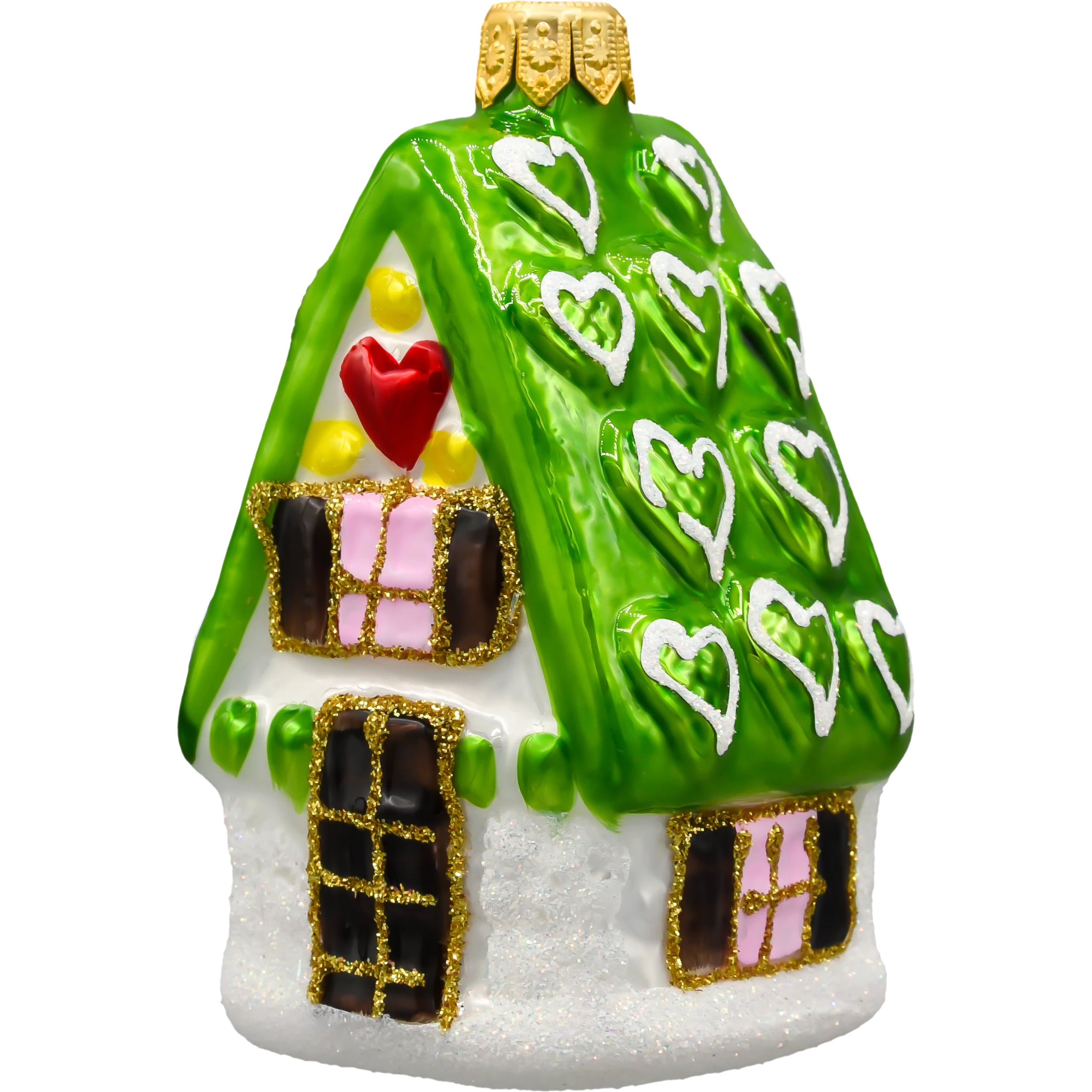 Ręcznie malowana bombka choinkowa w kształcie domku z zielonym dachem. Szklana ozdoba z brokatem i świątecznymi detalami – bajkowy klimat na Twojej choince!