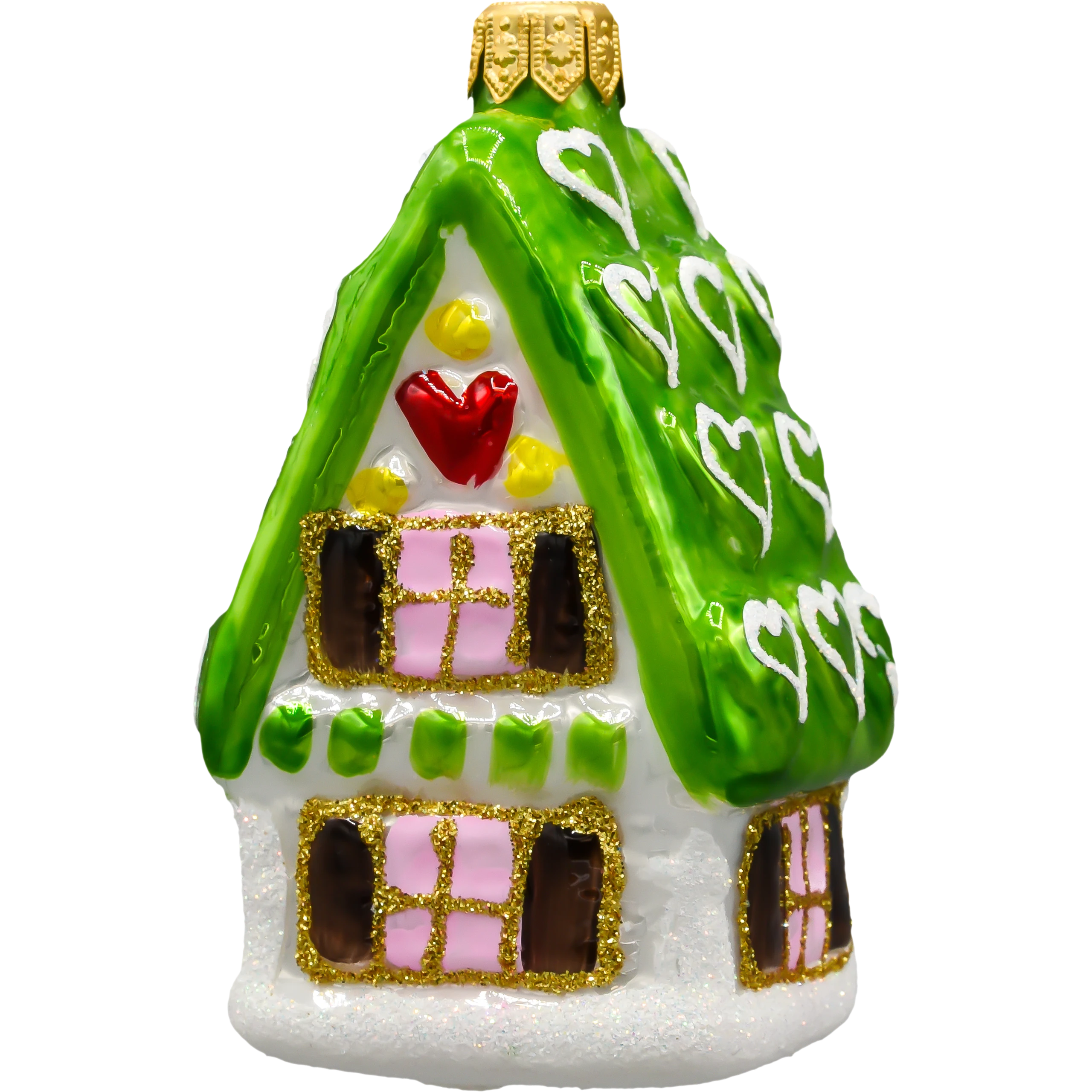 Wprowadź do swojego domu czar świąt dzięki niezwykłej bombce choinkowej w kształcie domku z zielonym dachem! Ta urocza, ręcznie malowana ozdoba wykonana została ze szkła najwyższej jakości, a każdy jej detal zachwyca precyzją i dbałością o świąteczny klimat. Zielony dach pokryty jest wypukłymi białymi serduszkami, przypominającymi lukrowe dekoracje rodem z bajkowej chatki z piernika. Na froncie domku znajdziemy czerwone serce, pastelowe okienka z różowymi szybkami oraz żółte i zielone zdobienia, które nadają całości słodkiego, cukierkowego charakteru.