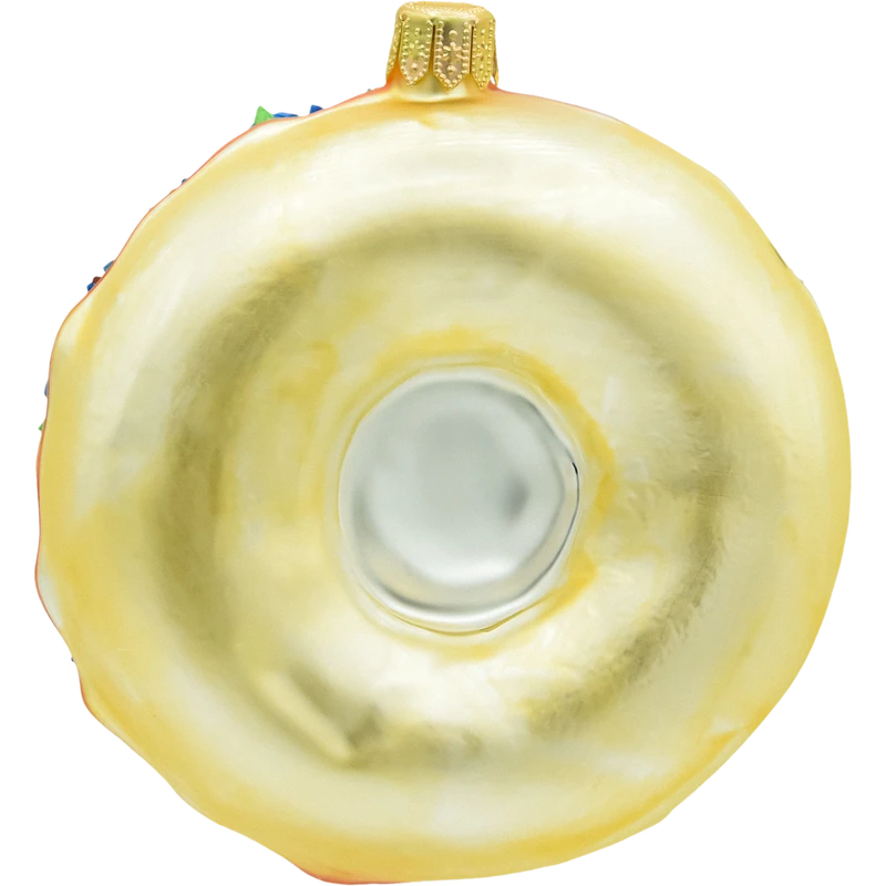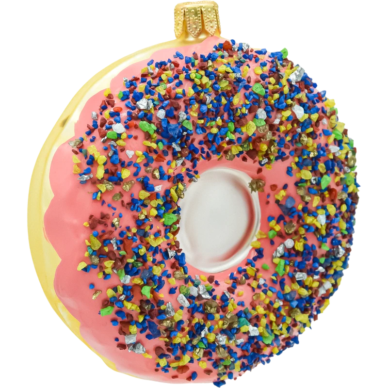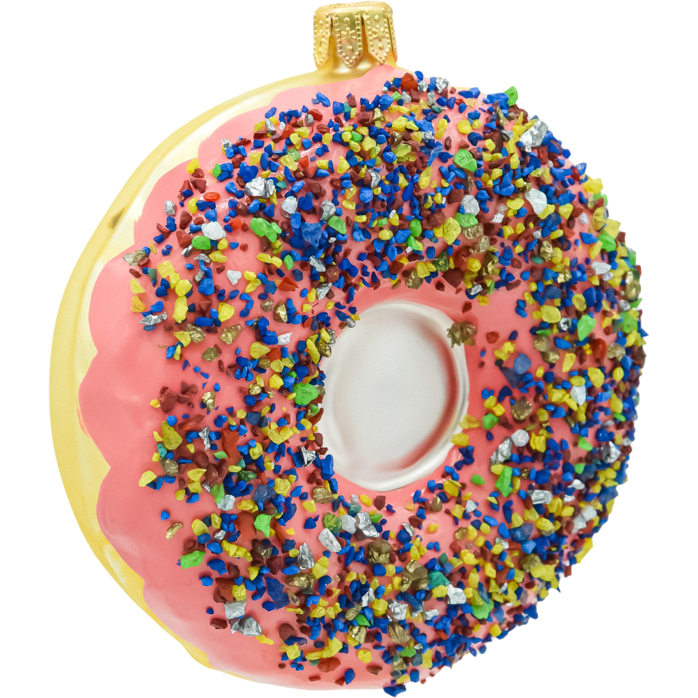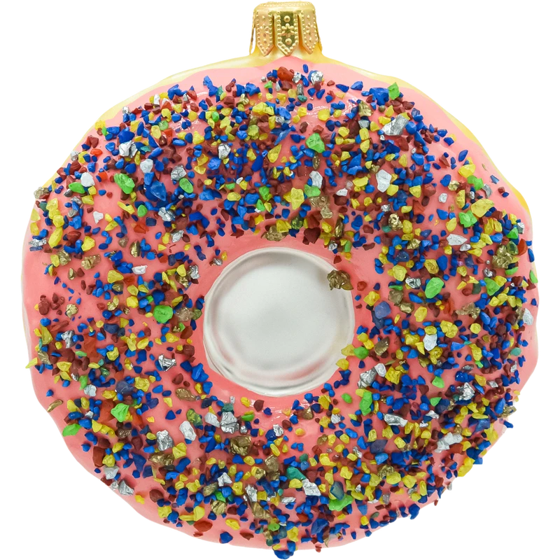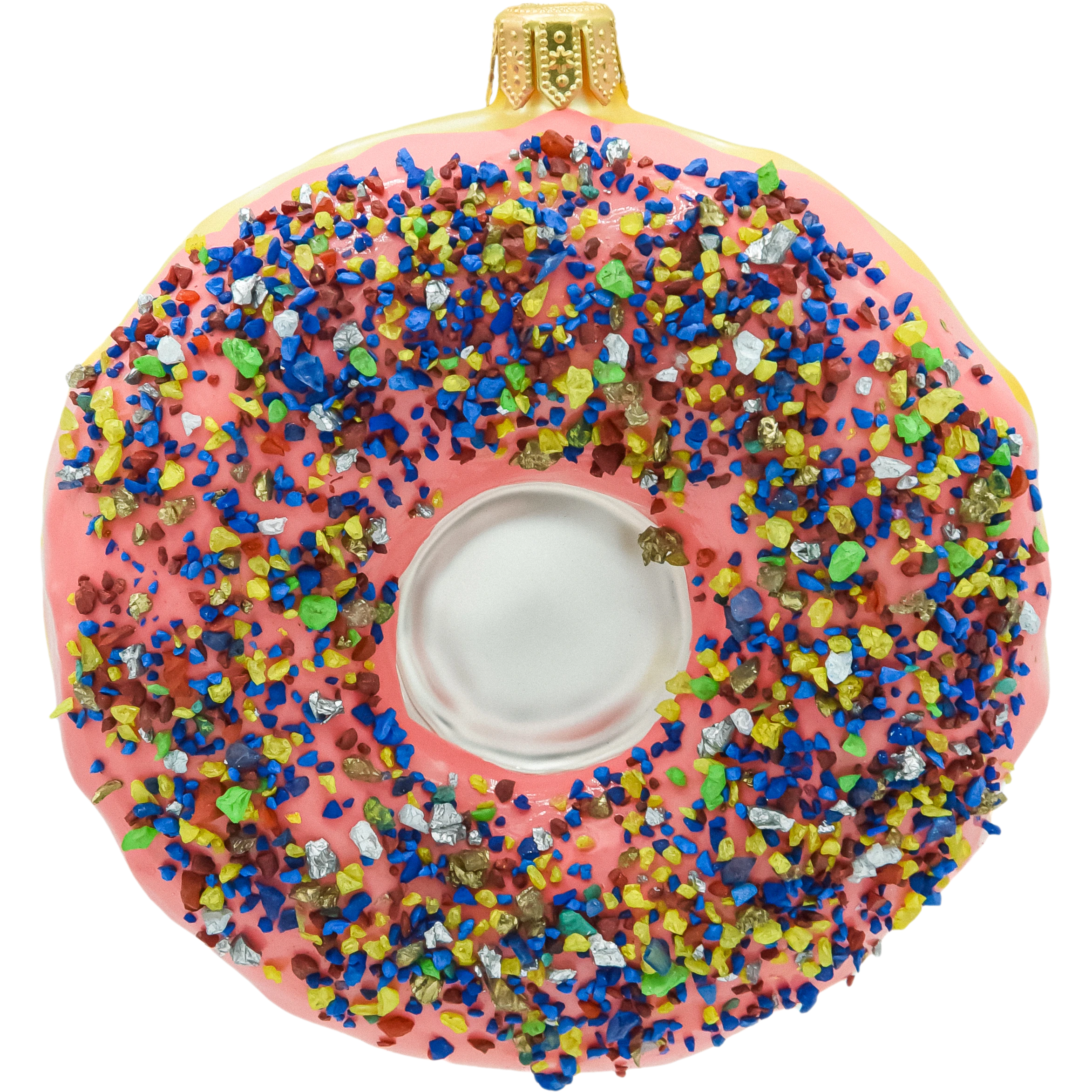 Ręcznie malowana bombka szklana Donut z różowym lukrem i kolorową posypką 3D. Lekka, płaska forma, złota koronka do zawieszenia. Idealna dekoracja choinki w stylu candy land, wyjątkowy prezent dla miłośników słodkich motywów i oryginalnych ozdób bożonarodzeniowych.