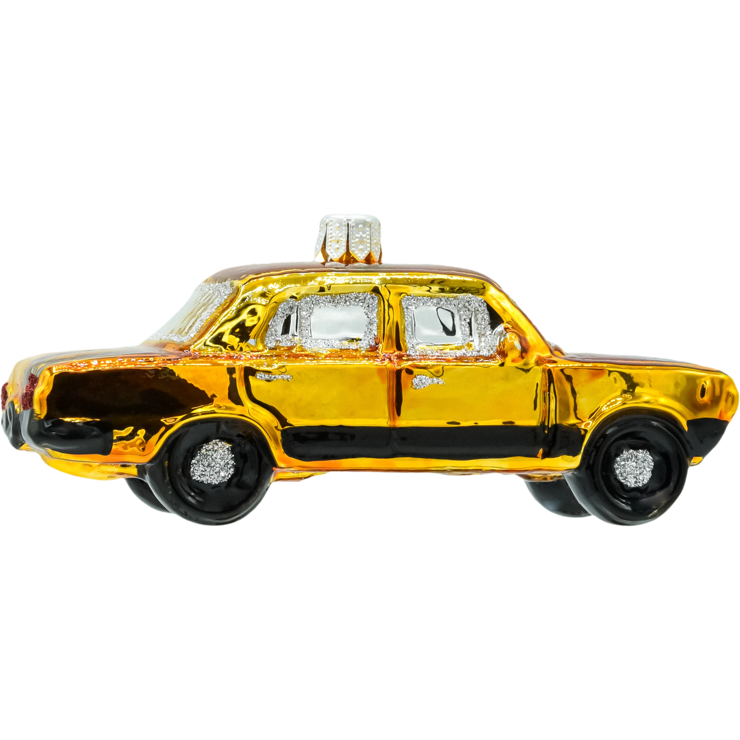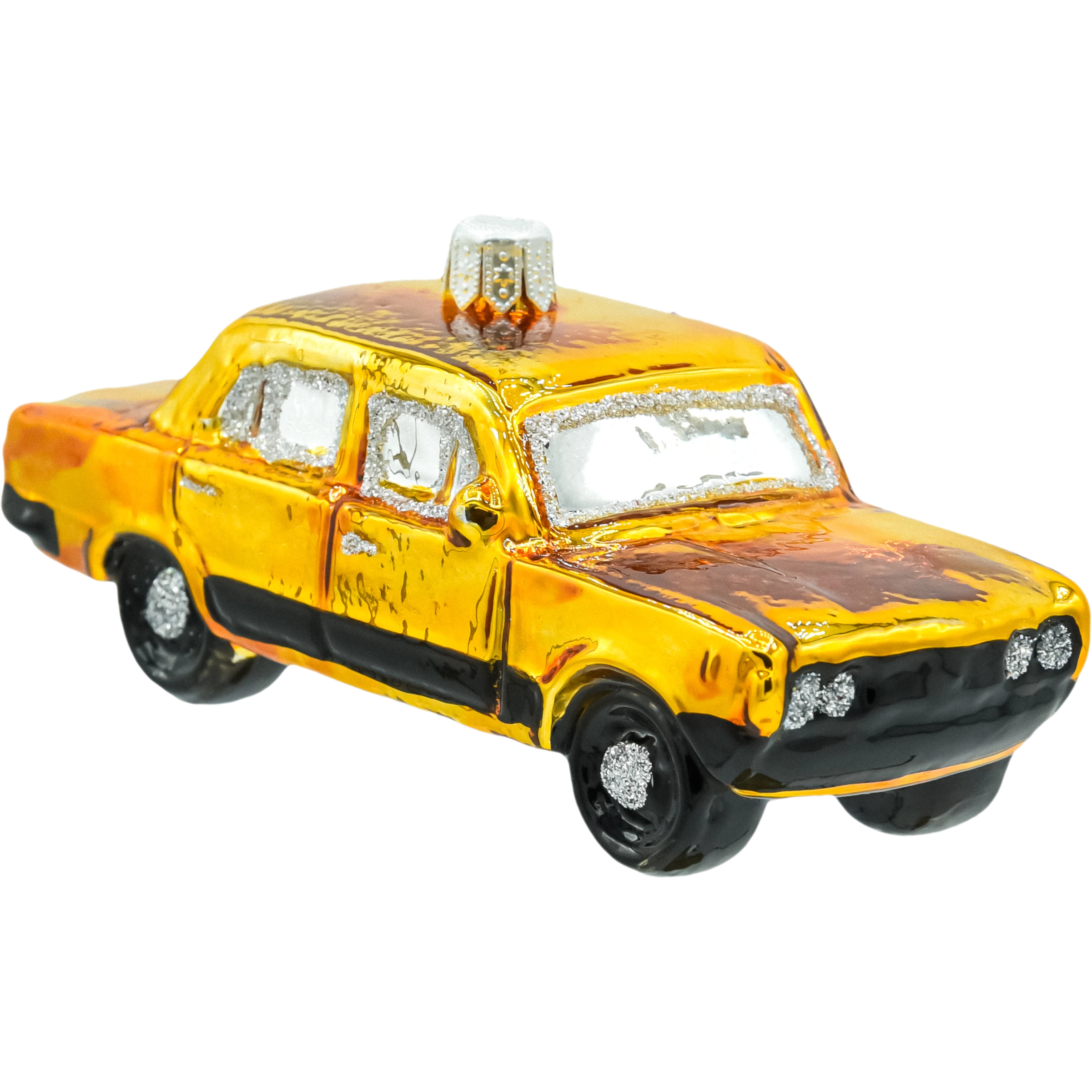 Ręcznie malowana bombka szklana Fiat 125p – żółty klasyk PRL w wersji 3D. Dmuchane szkło, brokatowe „chromy”, metalowy kapturek i długość ok. 10 cm. Lekka, efektowna i idealna na prezent dla miłośnika motoryzacji. Świąteczna ozdoba choinkowa retro w 100% z charakterem.