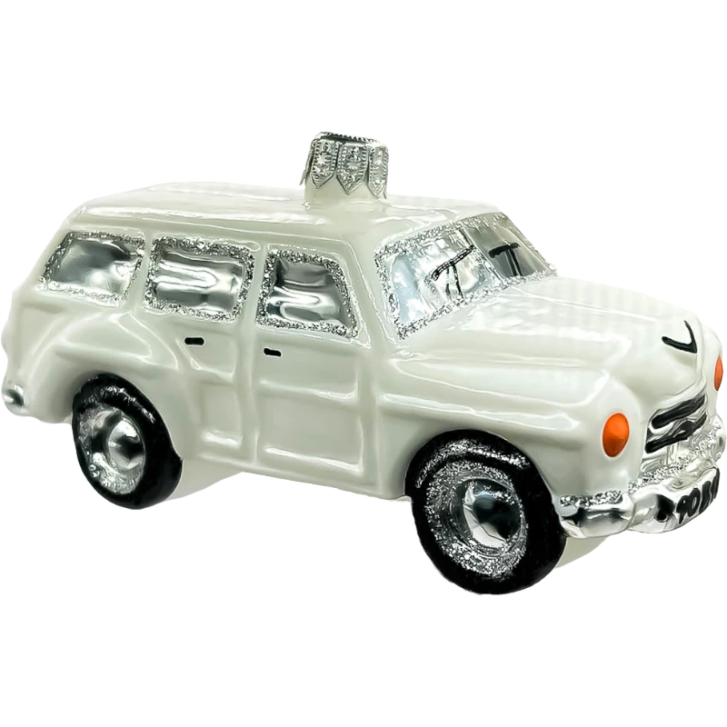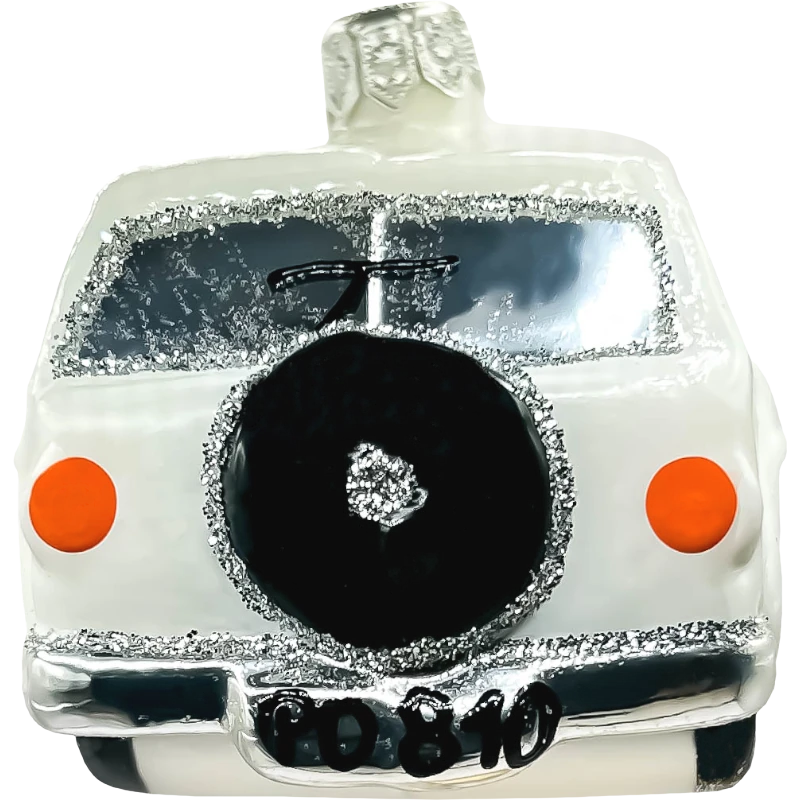Wzbogać swoją choinkę o elegancki, klasyczny akcent dzięki tej szklanej bombce w kształcie białego samochodu retro. Ręcznie wykonana i precyzyjnie malowana, bombka z wysokiej jakości szkła odzwierciedla kultowy design dawnych pojazdów, który przyciąga uwagę i dodaje świątecznym dekoracjom nostalgii. Śnieżnobiała kolorystyka oraz srebrne detale, takie jak obramowania okien i koła, podkreślają subtelny, ale elegancki charakter tej ozdoby, która doskonale wpisuje się w stylowe aranżacje świąteczne.