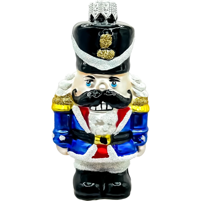 Bombka przedstawia klasycznego Dziadka do Orzechów, ubranego w elegancki mundur w żywych kolorach: niebieskim, czerwonym i złotym. Jego wąsy, broda i charakterystyczna twarz zostały ręcznie malowane, nadając bombce wyrazistego, ale jednocześnie eleganckiego wyglądu. Każdy szczegół jest starannie odwzorowany – od błyszczącego, czarnego kapelusza po zdobienia na jego stroju.