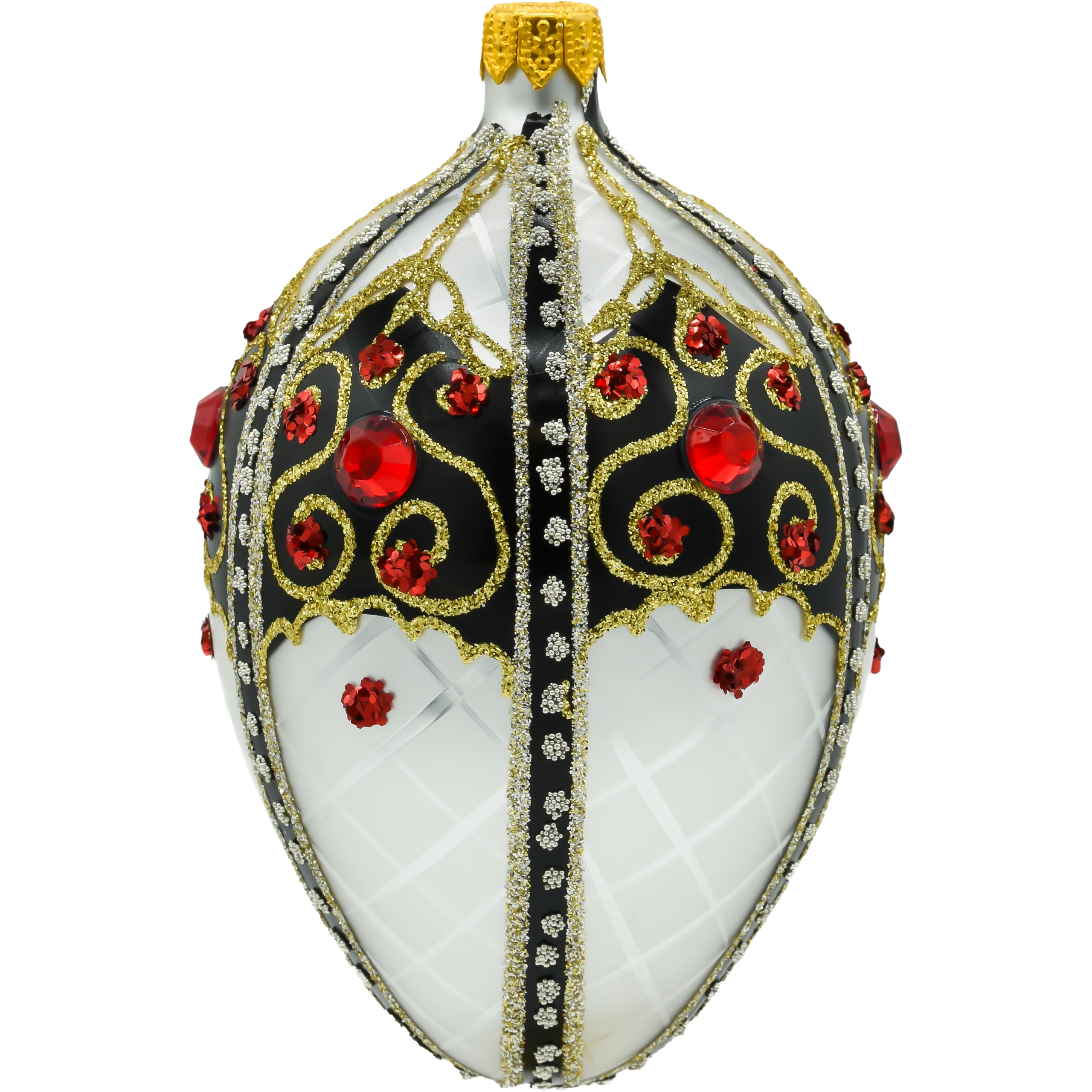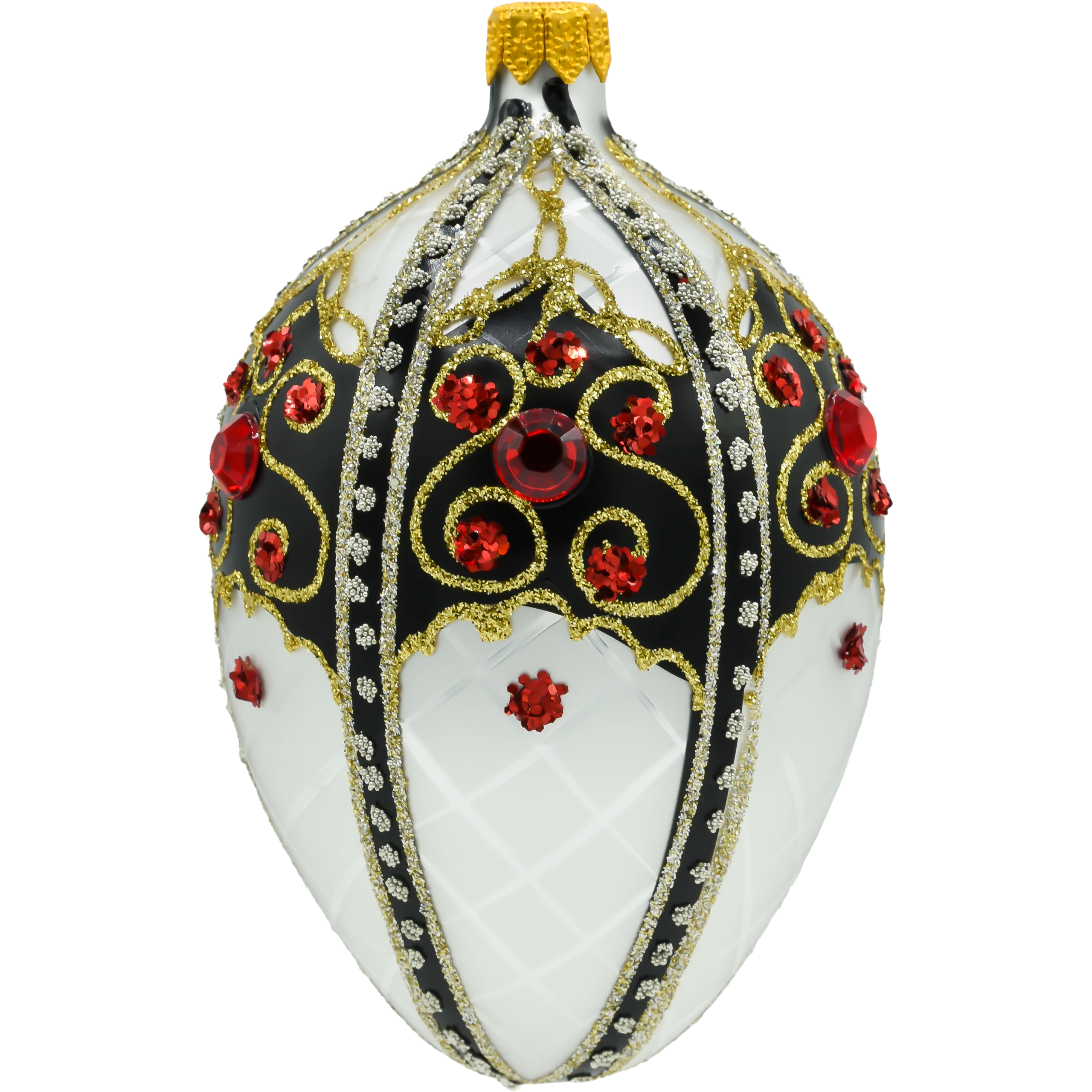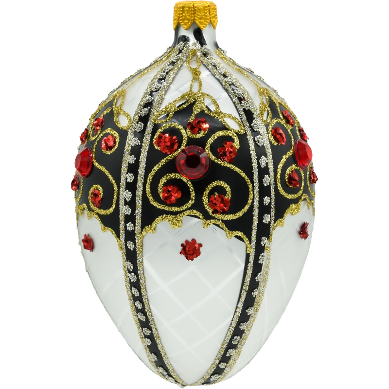 Dodaj odrobinę królewskiego blasku do swojego świątecznego wystroju z tą wyjątkową szklaną bombką inspirowaną jajami Faberge. Ta bombka w kształcie jaja zachwyca swoją elegancją i precyzyjnym wykonaniem, łącząc w sobie klasyczne, luksusowe elementy z nowoczesnym designem. Wykonana ręcznie, bombka łączy w sobie głębokie, czarne zdobienia z delikatnym kremowym tłem, tworząc niezwykły kontrast, który wyróżnia ją na tle innych ozdób choinkowych.
