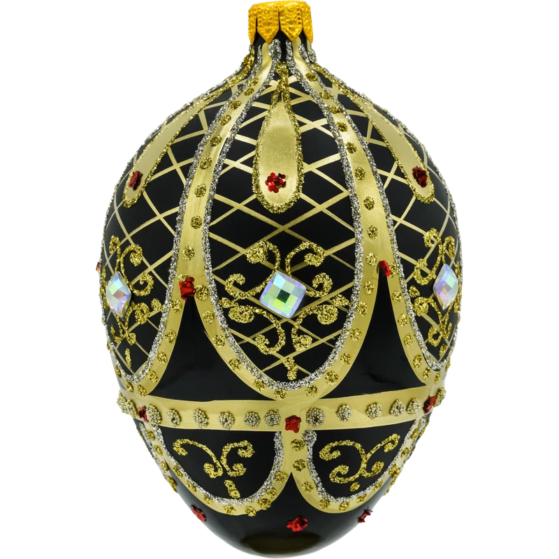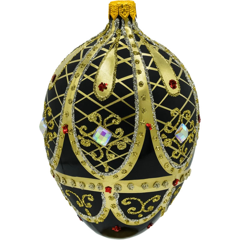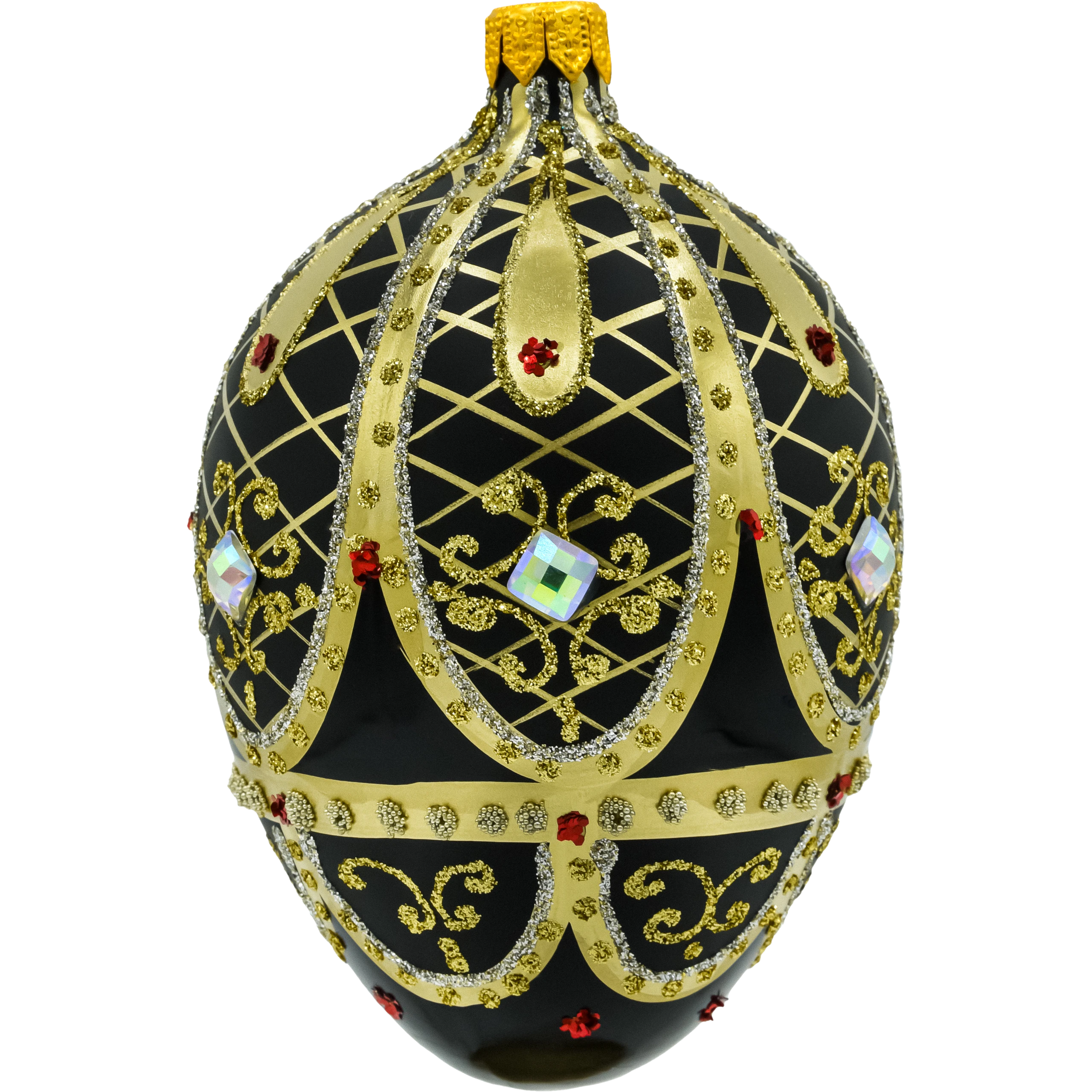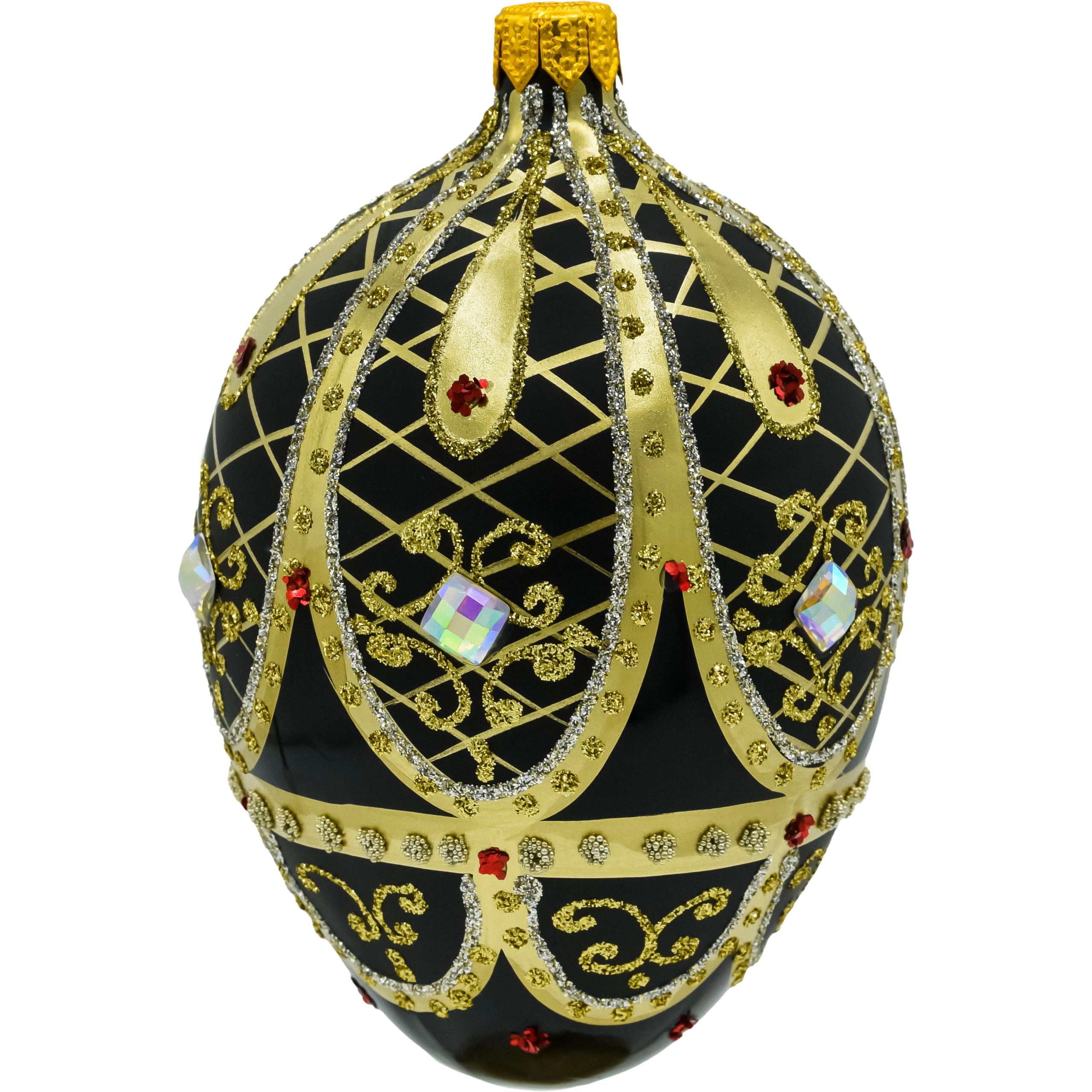 Wzbogać swoją świąteczną dekorację o wyjątkową bombkę inspirowaną słynnymi jajami Faberge, które od wieków symbolizują luksus, elegancję i mistrzowskie rzemiosło. Ta ręcznie wykonana bombka w kształcie jaja zachwyca swoją bogatą ornamentyką, łącząc złote detale z głębokim czarnym tłem, co tworzy wspaniały kontrast, przyciągający uwagę każdego gościa.