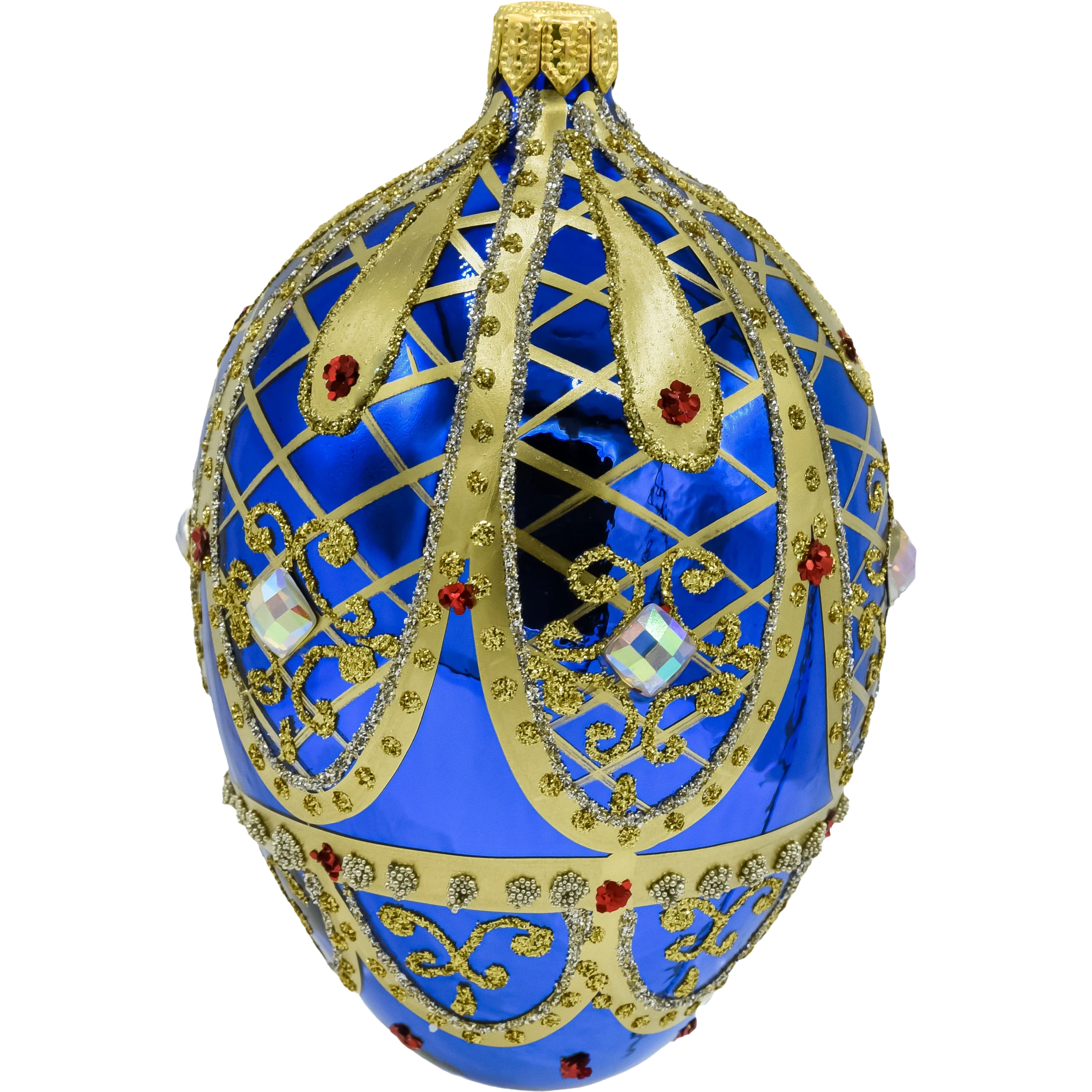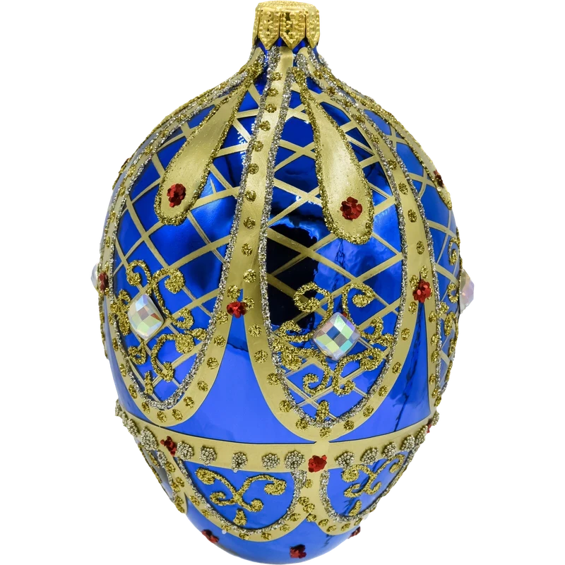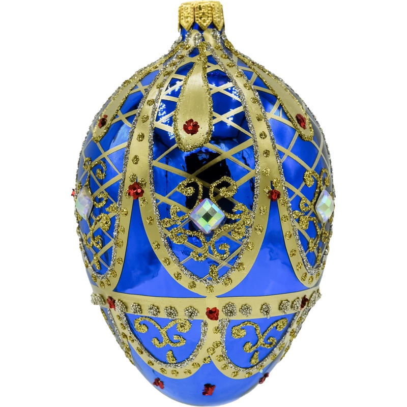 Odkryj wyjątkową ozdobę świąteczną inspirowaną legendarnymi jajami Fabergé, symbolami luksusu i kunsztu artystycznego. Szklane jajo w głębokim niebieskim kolorze, zdobione złotymi ornamentami i połyskującymi kryształami.