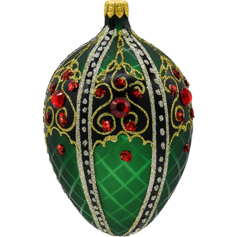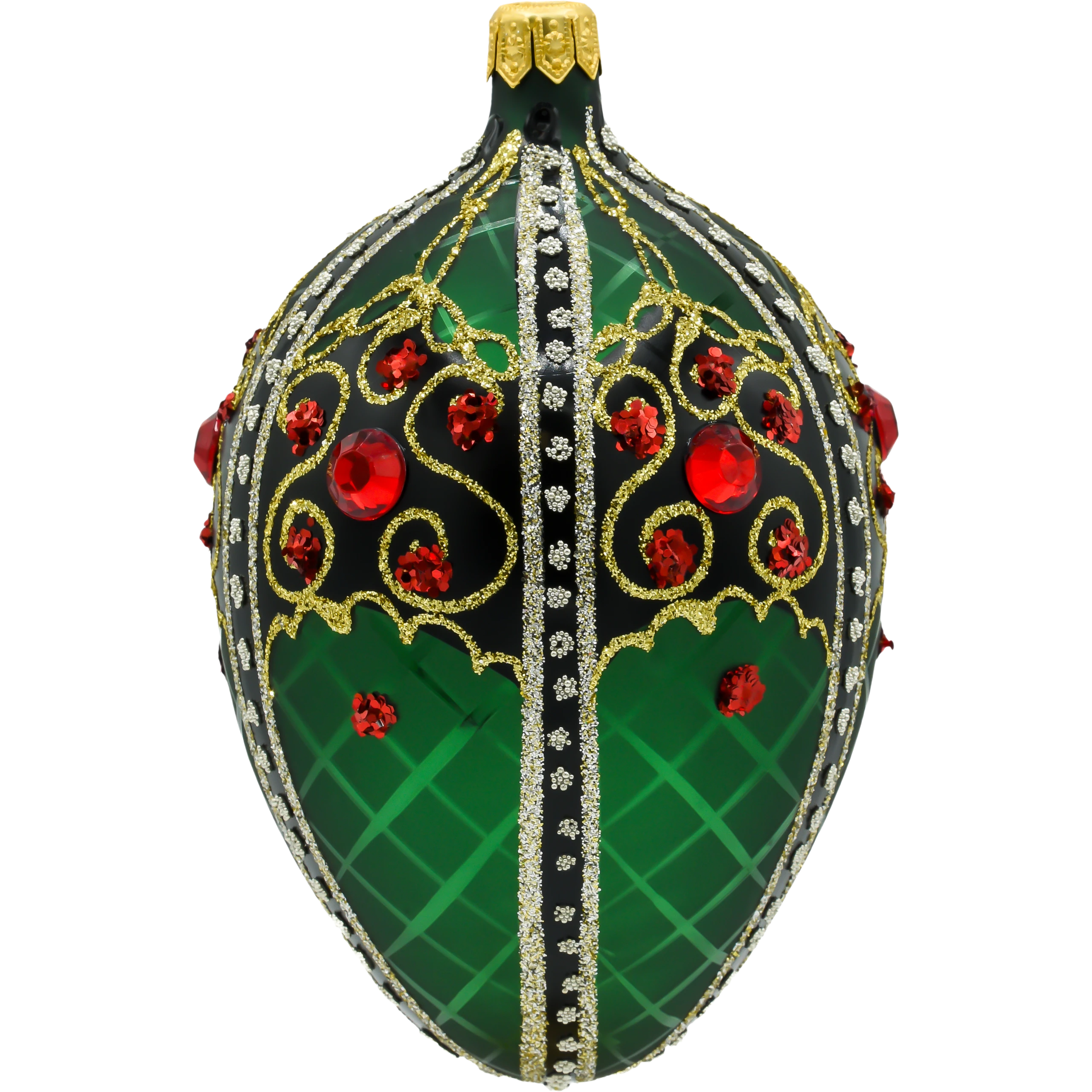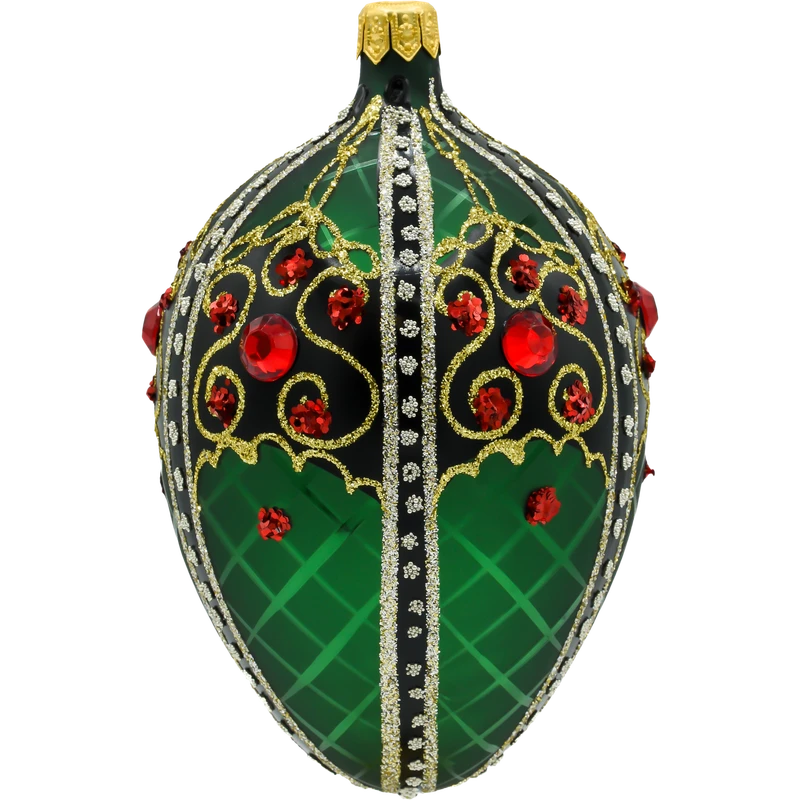 Luksusowe szklane jajo Fabergé w kolorze butelkowej zieleni z czarnym ornamentem, złotymi zdobieniami i czerwonymi kryształkami. Ręcznie malowana bombka choinkowa inspirowana carskim stylem.