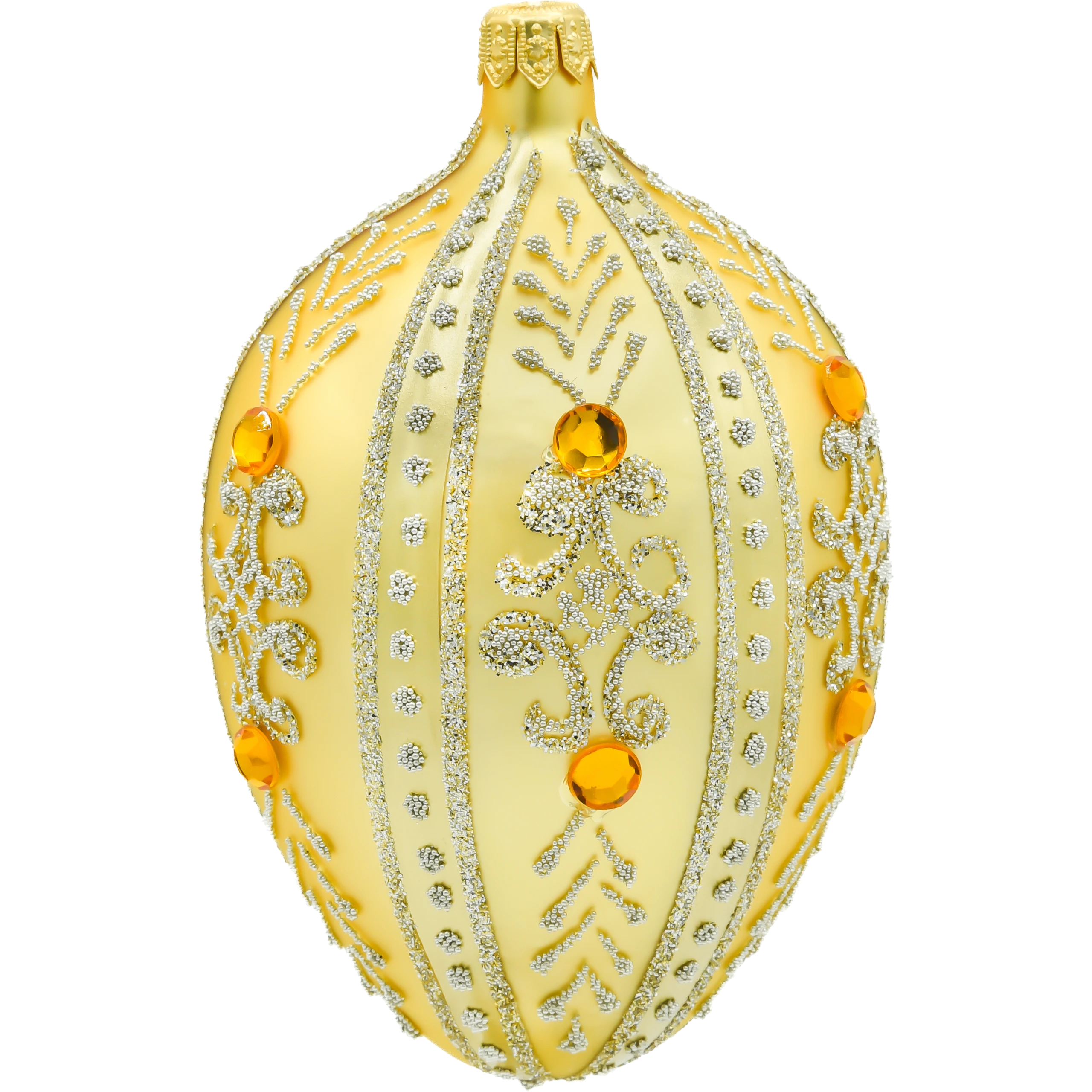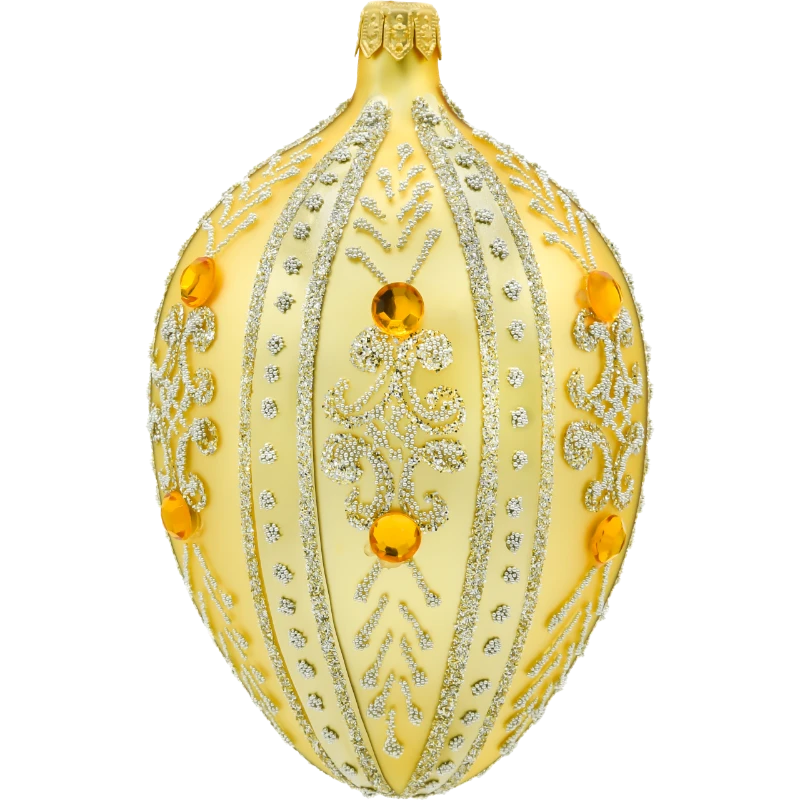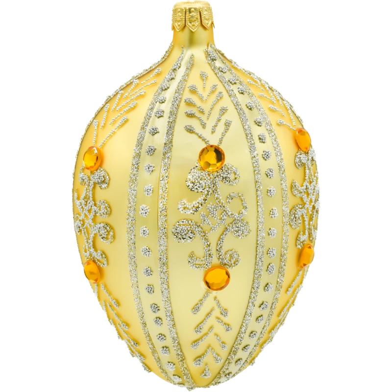 Prezentowana bombka choinkowa w formie szklanego jaja Fabergé zachwyca wytworną elegancją i perfekcją ręcznego wykonania. Utrzymana w klasycznym odcieniu złota, emanuje świątecznym blaskiem i doskonale nawiązuje do arystokratycznej estetyki inspirowanej carskimi jajami Fabergé. Cała powierzchnia ozdobiona została kunsztownym wzorem z drobniutkiego brokatu w kolorze srebrnym, a centralną rolę w dekoracji odgrywają efektowne bursztynowe kryształki, imitujące kamienie szlachetne.