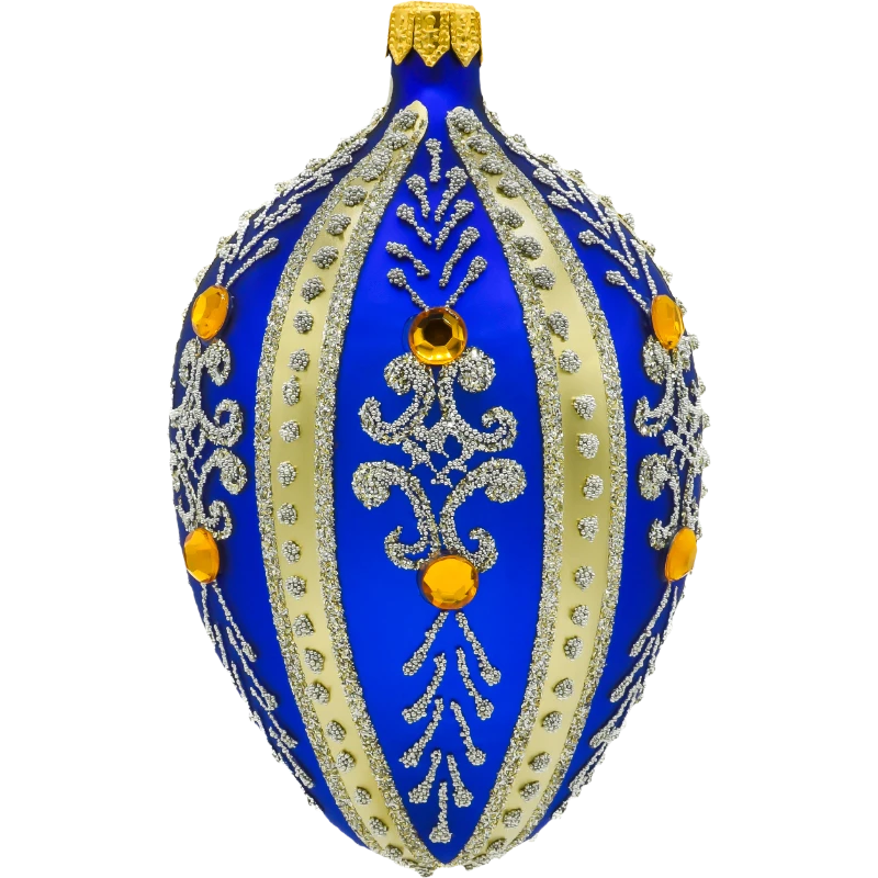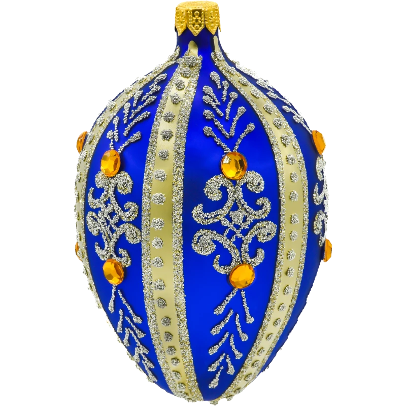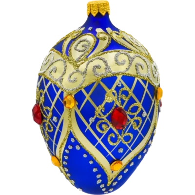 Przenieś się w świat carskich pałaców dzięki tej wyjątkowej bombce choinkowej – szklanemu jajku Fabergé, które emanuje elegancją i bogactwem detali. Ręcznie wykonana z dmuchanego szkła, pokryta satynowym lakierem w intensywnym, królewskim błękicie, ozdobiona jest złotymi pasami i filigranowymi wzorami z drobnego brokatu. Całość dopełniają bursztynowe kryształki w szlifie kamieni szlachetnych, rozmieszczone z dbałością o symetrię i efekt wizualny.