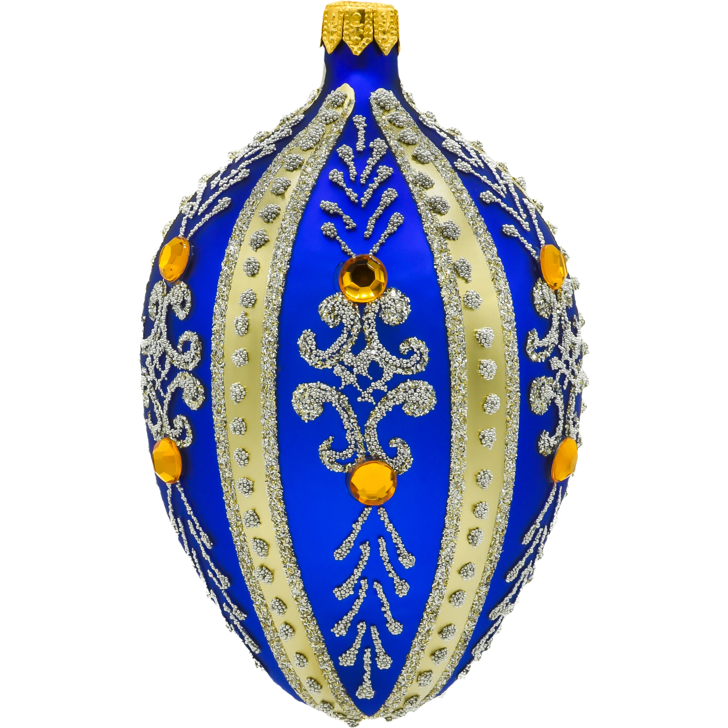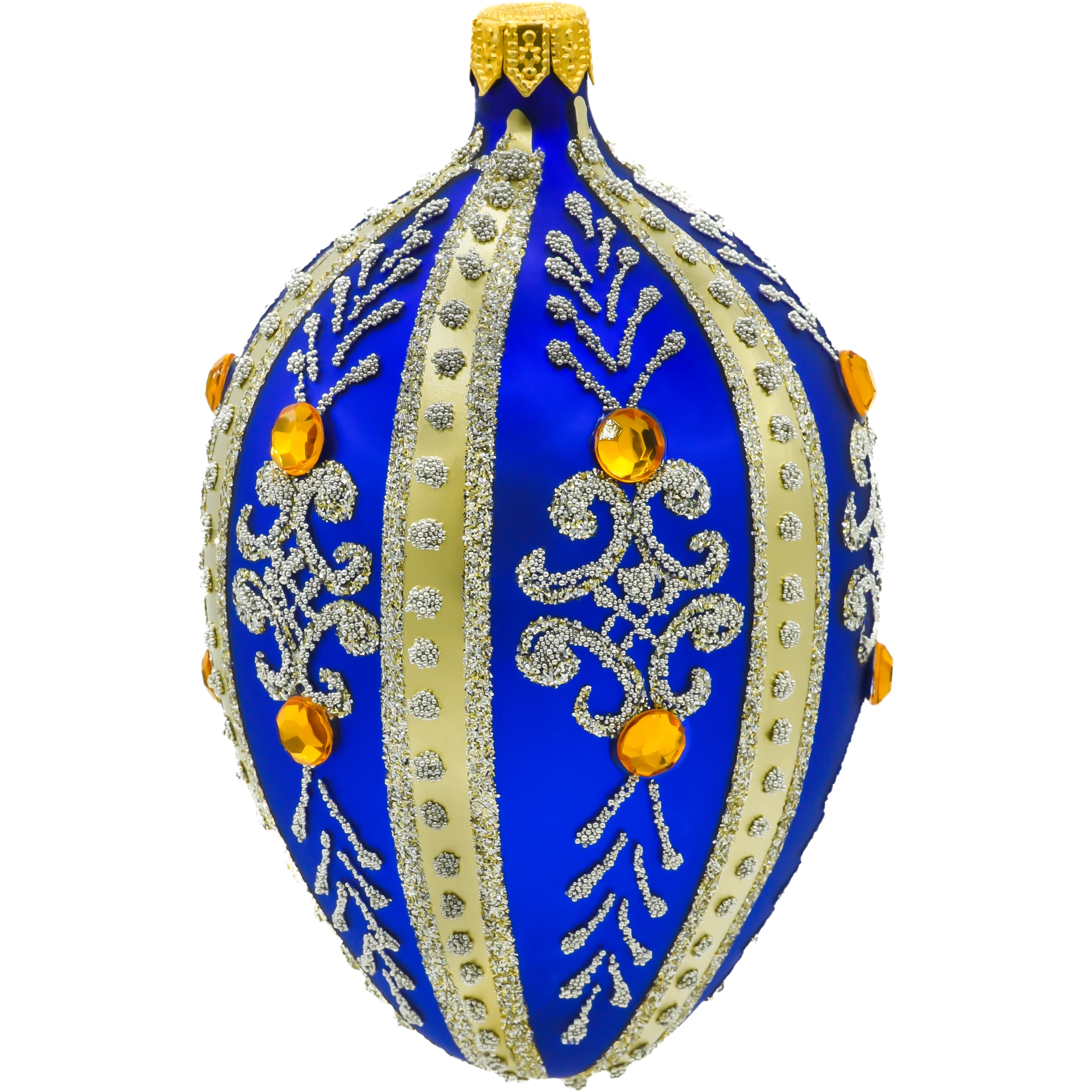 Szklane jajo Fabergé w odcieniu królewskiego błękitu – luksusowa bombka choinkowa z bursztynowymi kryształkami