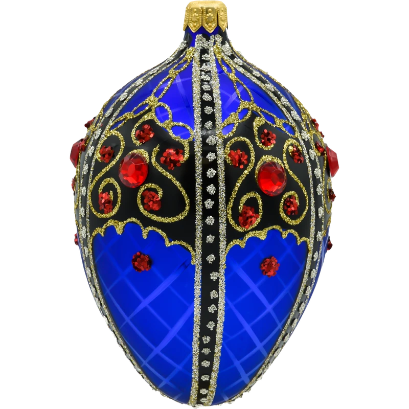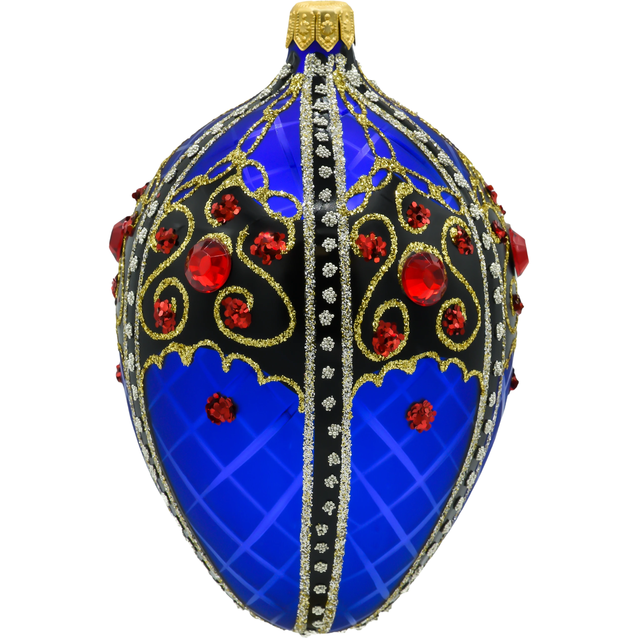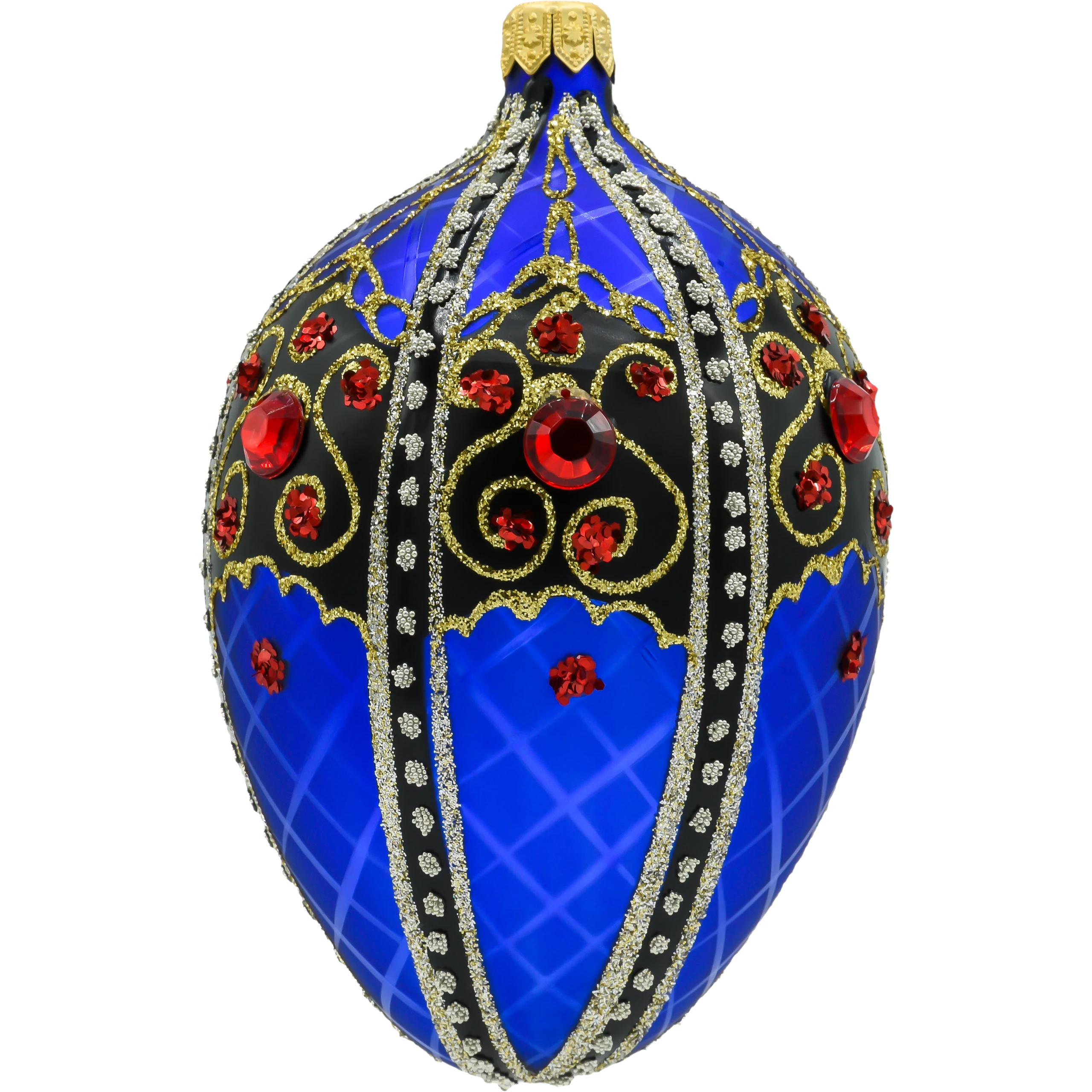 Szklane jajo Fabergé – kobaltowe z czerwonymi kryształkami i złoto-srebrnym zdobieniem