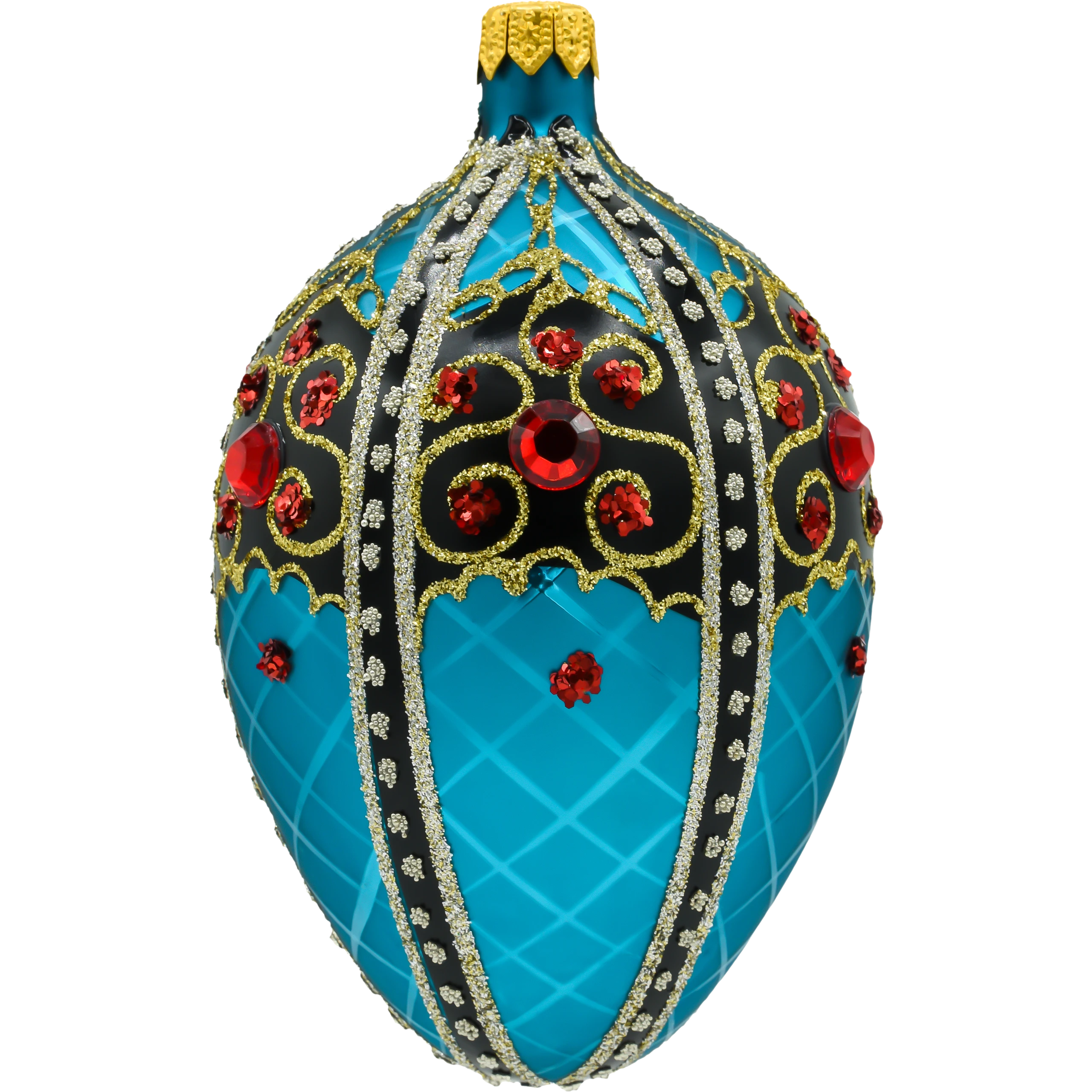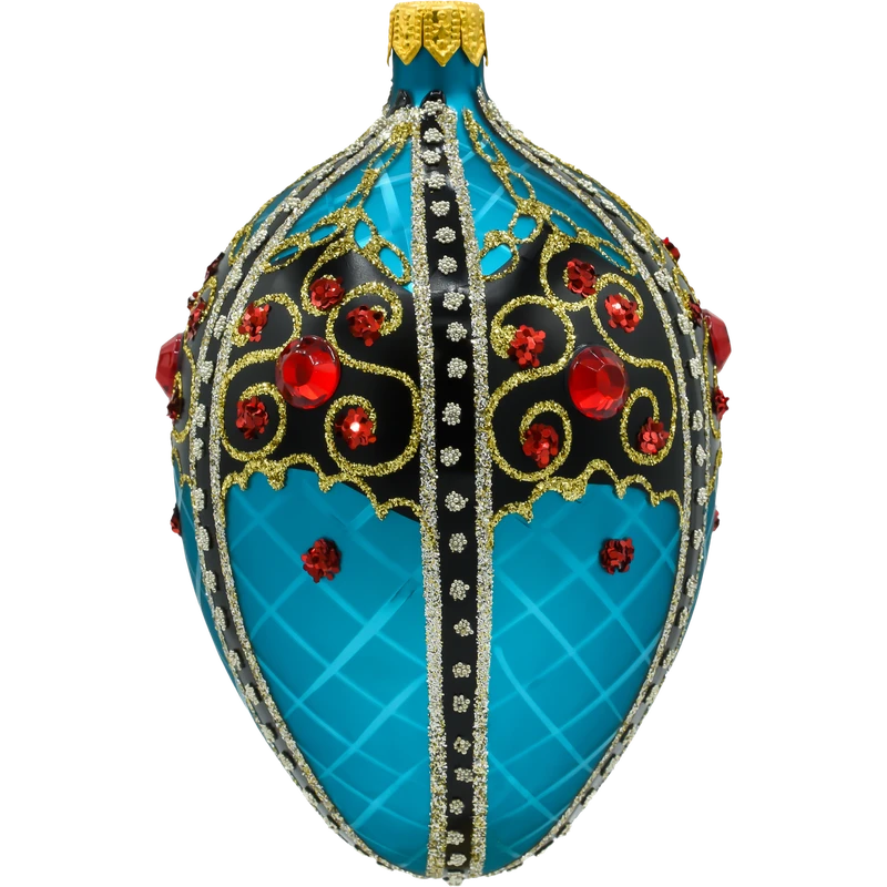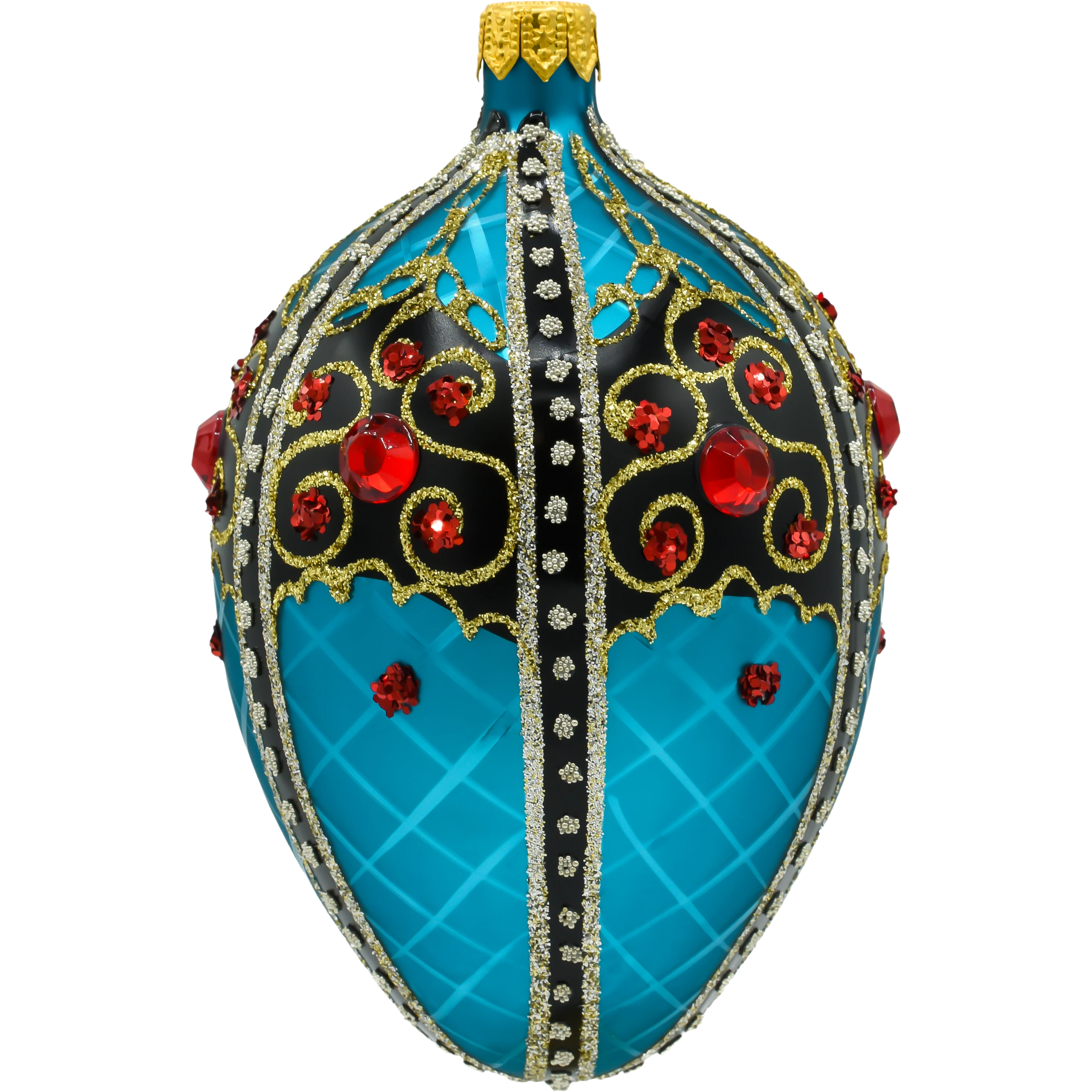 Zachwycające szklane jajo w stylu Fabergé, które wnosi do wnętrza nutę carskiej elegancji i wyrafinowanego bogactwa. Turkusowa baza z satynowym połyskiem pokryta została delikatną siateczką karo, nadającą całości biżuteryjny charakter. Górna część bombki zdobiona jest ręcznie malowanymi, czarnymi pasami z barokowym ornamentem z brokatu w kolorze złota i srebra. Na całej powierzchni rozmieszczono symetryczne, czerwone kryształki, które przypominają rubiny oprawione w misternie zdobioną biżuterię.