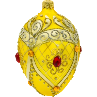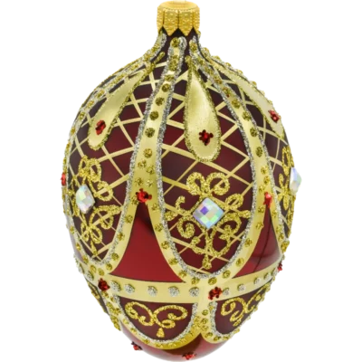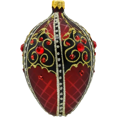 Wzbogać swoją świąteczną dekorację o niepowtarzalny element luksusu dzięki tej ręcznie wykonanej szklanej ozdobie choinkowej w kształcie jaja. Nasza bombka, utrzymana w głębokiej czerwieni, zdobiona jest misternymi złotymi wzorami oraz olśniewającymi kryształami, które nadają jej królewski wygląd. Idealna na centralne miejsce na Twojej choince, ta ozdoba przyciągnie uwagę swoim wyjątkowym blaskiem i elegancją.
