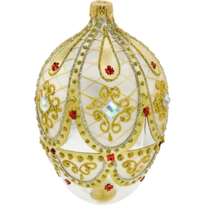 Szklana bombka „Ekskluzywne Jajo szklane z kamieniami” to idealna ozdoba dla tych, którzy cenią sobie elegancję i tradycję w świątecznym wystroju. Jej bogaty design i staranne wykonanie sprawiają, że stanie się ona centralnym punktem Twojej choinki, wprowadzając do wnętrza atmosferę luksusu i świątecznego blasku.