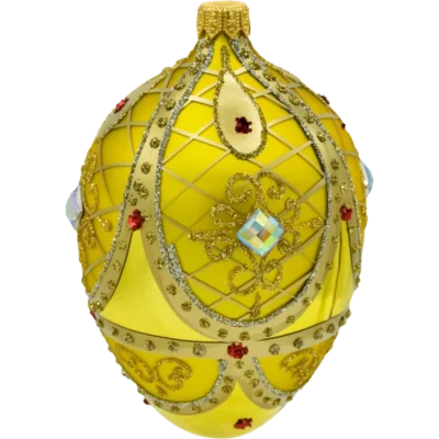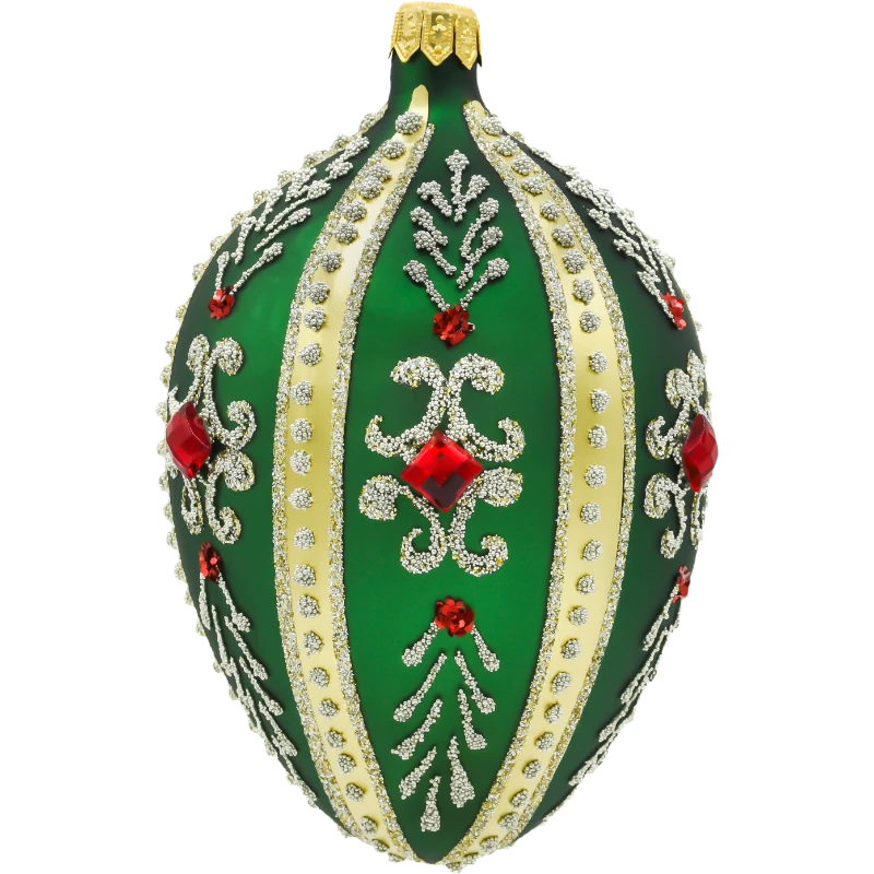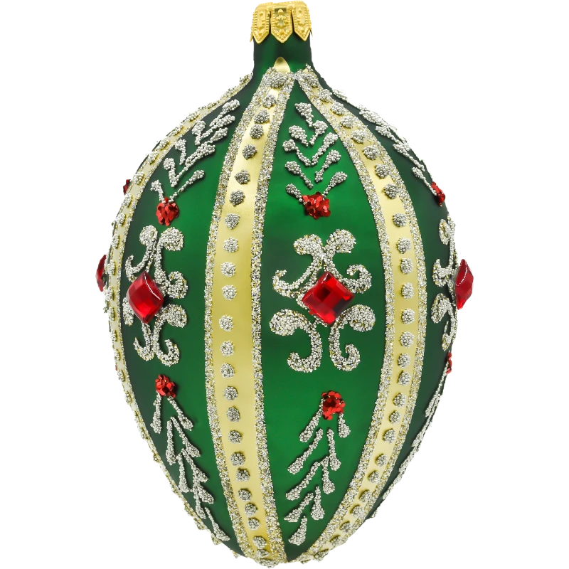 Szklane jajo inspirowane legendarnym stylem Fabergé to prawdziwa perła wśród świątecznych dekoracji. Wykonane z dmuchanego szkła i ręcznie malowane, urzeka szmaragdową zielenią tła, którą elegancko przełamują złote pasy, mieniące się brokatowe ornamenty oraz okazałe czerwone kryształki. Precyzyjnie naniesione detale w postaci złotych wzorów roślinnych oraz symetrycznych linii nadają całości pałacowego szyku i wyjątkowego prestiżu.