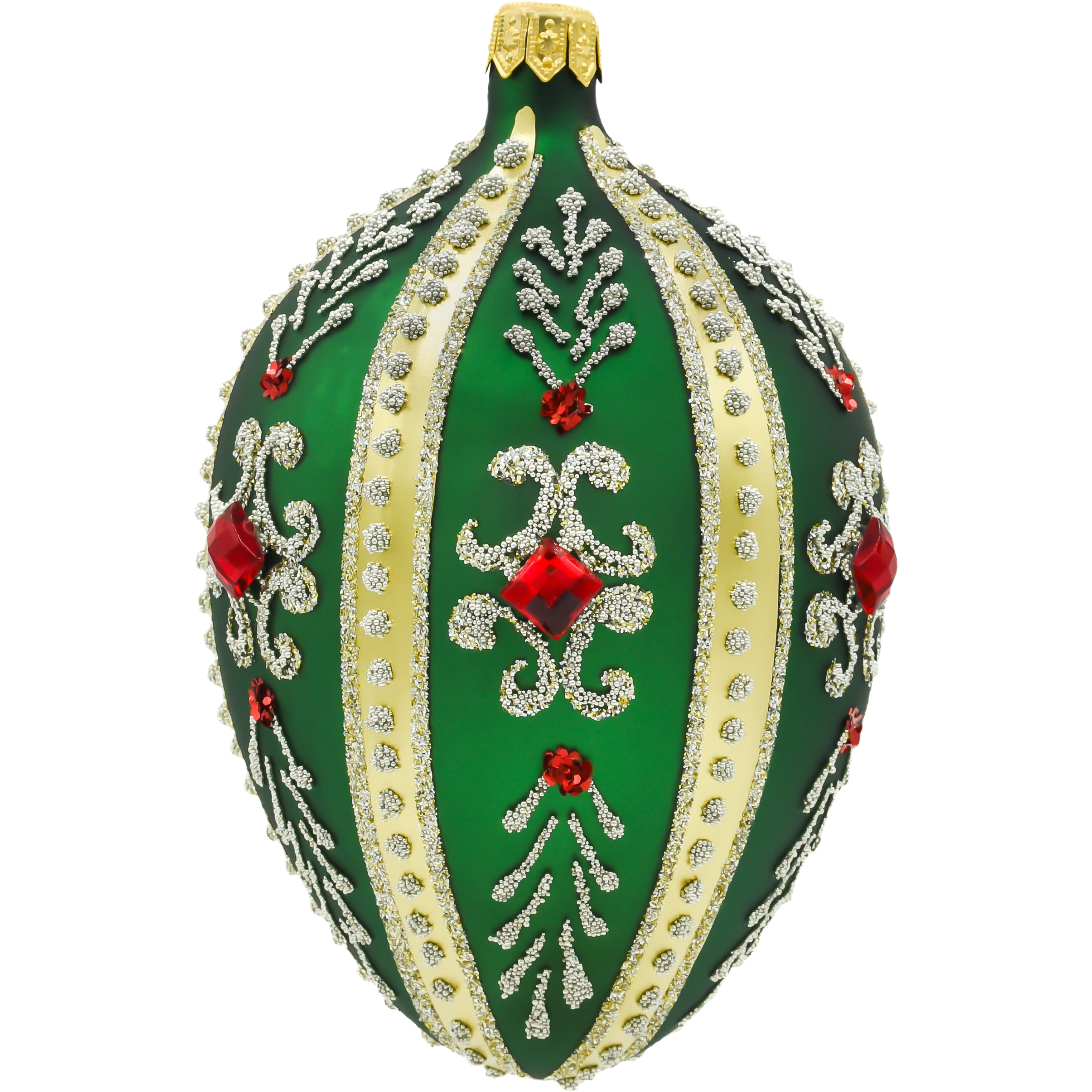 Zielone szklane jajo Fabergé z czerwonymi kryształkami i złotym brokatem – luksusowa bombka choinkowa w stylu pałacowym, idealna na eleganckie dekoracje świąteczne.