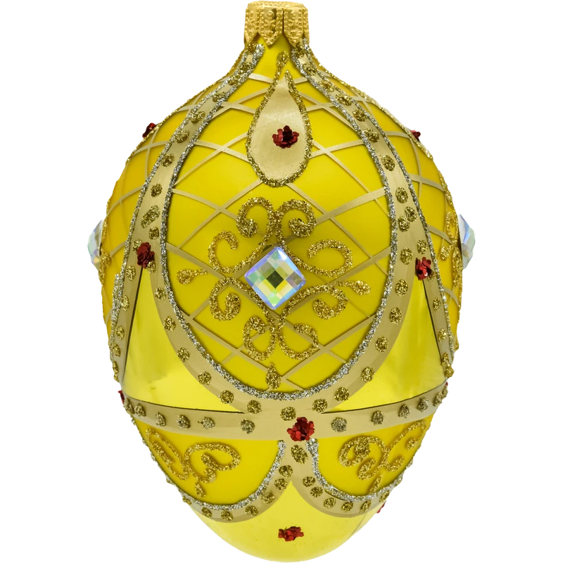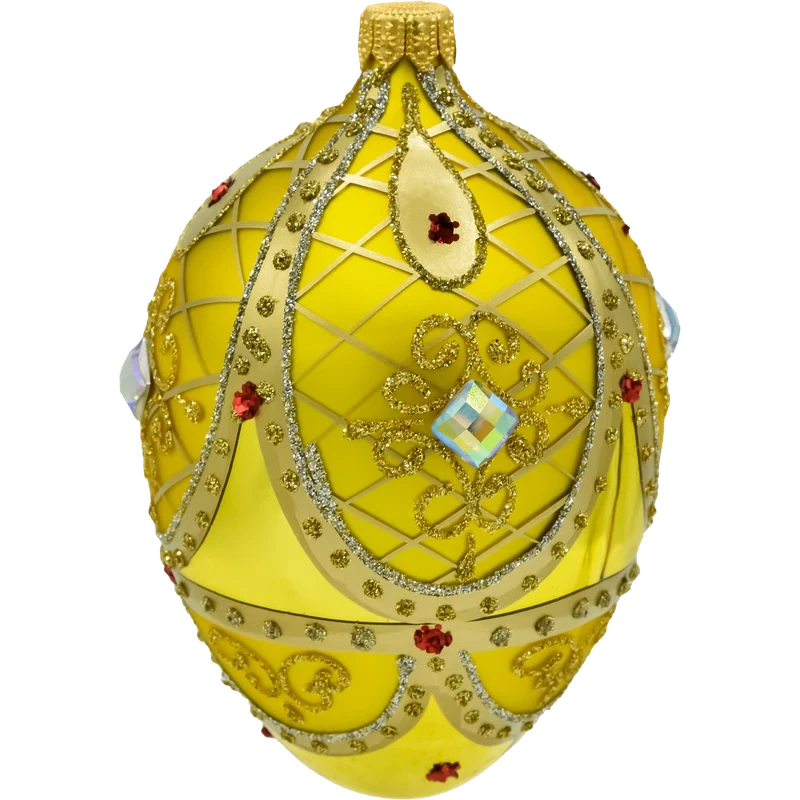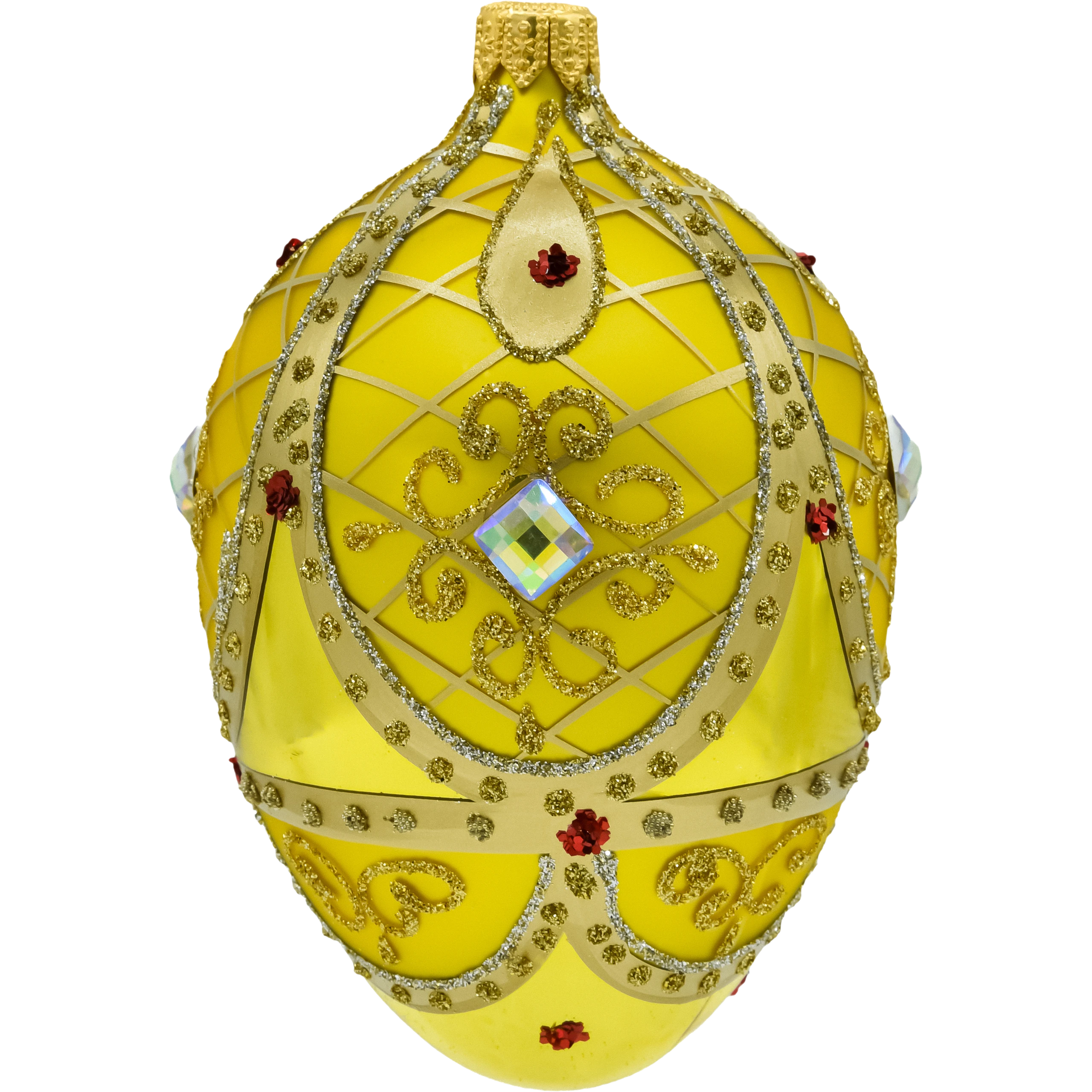 Ozdób swoje świąteczne drzewko z tą wspaniałą bombką w stylu Faberge, która wprowadzi do Twojego wnętrza nutę królewskiego luksusu i elegancji. Ręcznie wykonana bombka choinkowa w kształcie jaja zachwyca głębokim żółtym odcieniem, który idealnie komponuje się z bogatymi, ręcznie malowanymi ornamentami.