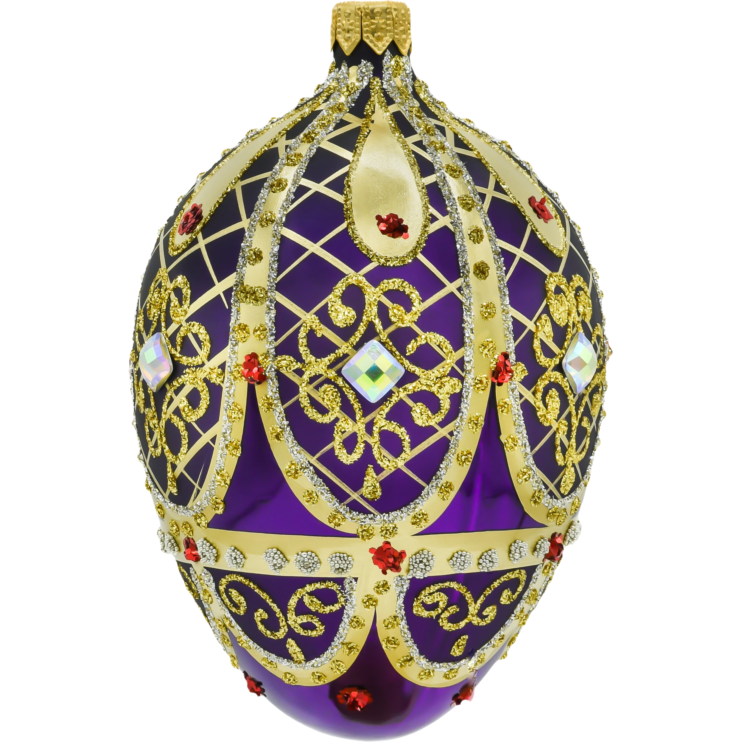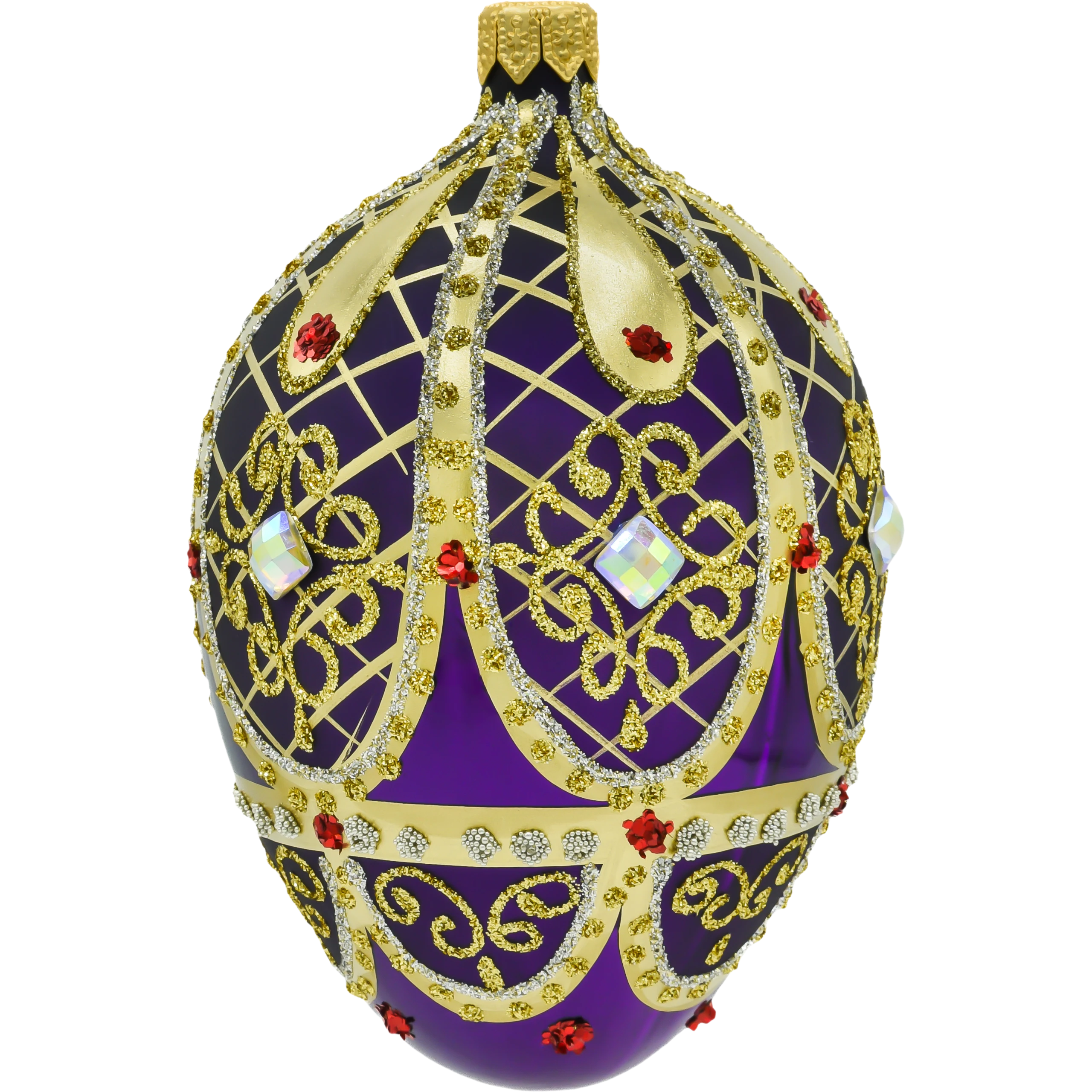 Bombka ma głęboki fioletowy kolor, który symbolizuje królewski przepych, a jej powierzchnię zdobią ręcznie nakładane złote ornamenty i brokatowe wzory, które tworzą piękny kontrast. Centralnym elementem dekoracji są bogato zdobione pasy, przecinające powierzchnię bombki w romboidalnym wzorze, a całość jest udekorowana drobnymi kryształkami oraz większymi, lśniącymi kamieniami w kolorze bursztynu i czerwieni. Kryształowe detale pięknie odbijają światło, tworząc efekt głębi i blasku, który doskonale komponuje się z innymi luksusowymi ozdobami świątecznymi.