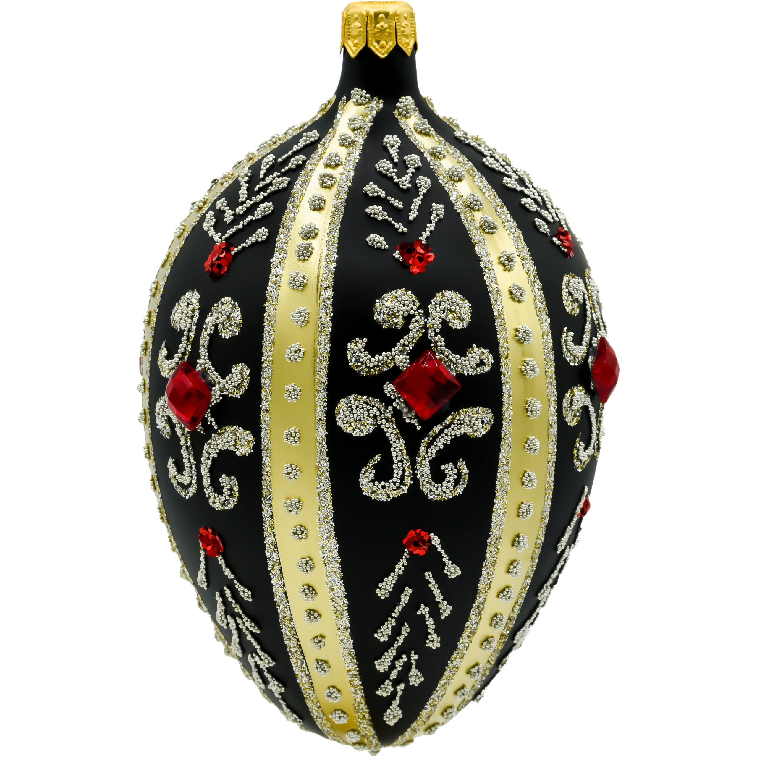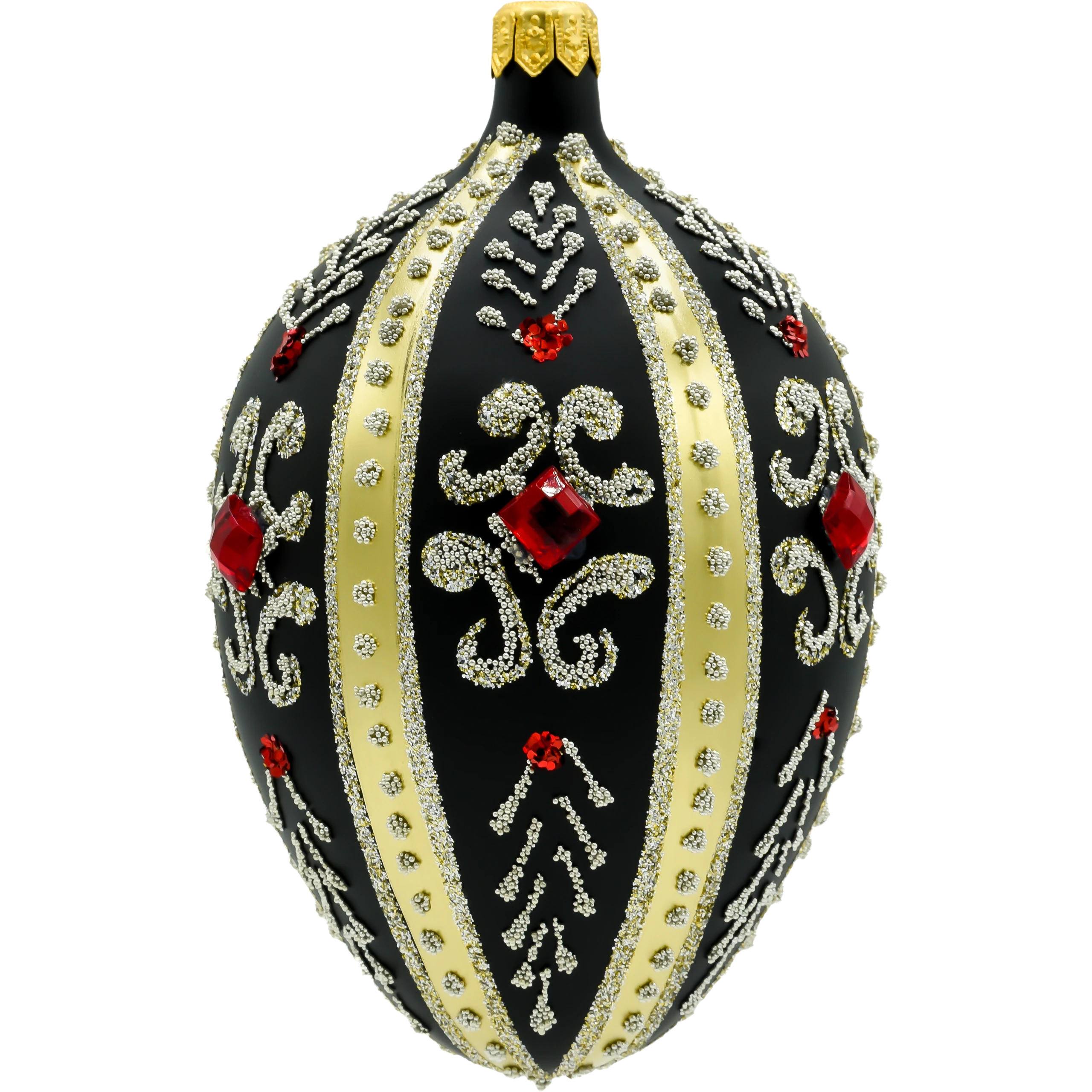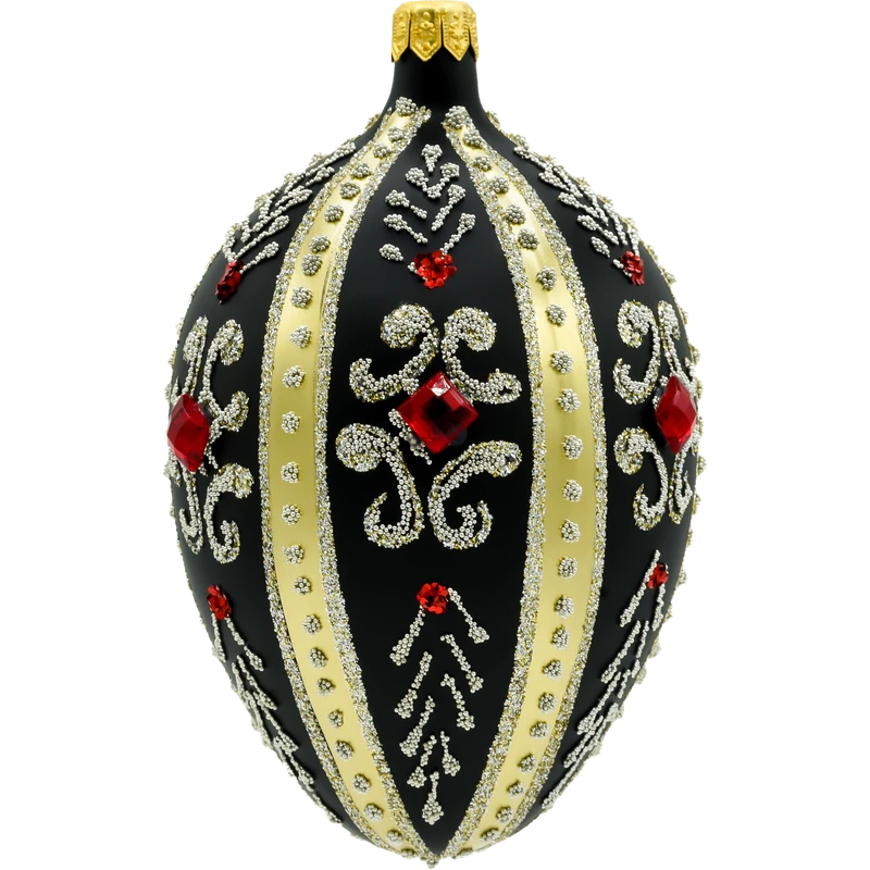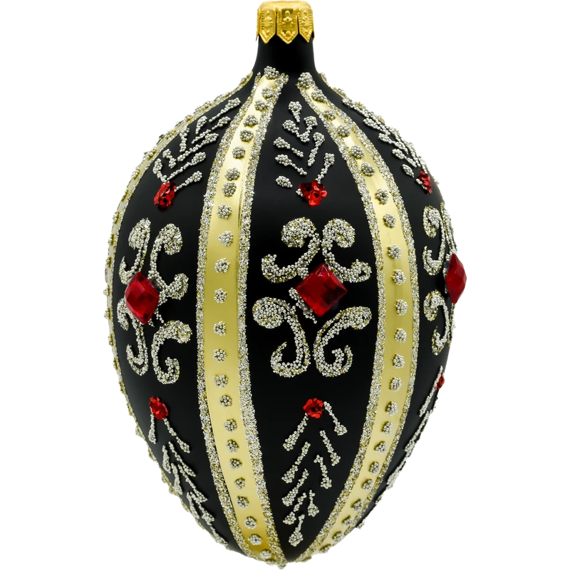 Wprowadź do swojej świątecznej kolekcji odrobinę carskiego splendoru dzięki tej wyjątkowej bombce w kształcie jaja Fabergé. Wykonane ze szkła i ręcznie zdobione z niezwykłą precyzją, czarne szklane jajo zachwyca elegancją i dbałością o detale. Jego matowa, głęboka czerń stanowi doskonałe tło dla złotych pasów, bogatych ornamentów oraz finezyjnych wzorów ułożonych z mikroszklanych koralików i srebrzystego brokatu. Całość dopełniają rubinowoczerwone kryształki, które przyciągają wzrok i subtelnie odbijają światło choinkowych lampek.