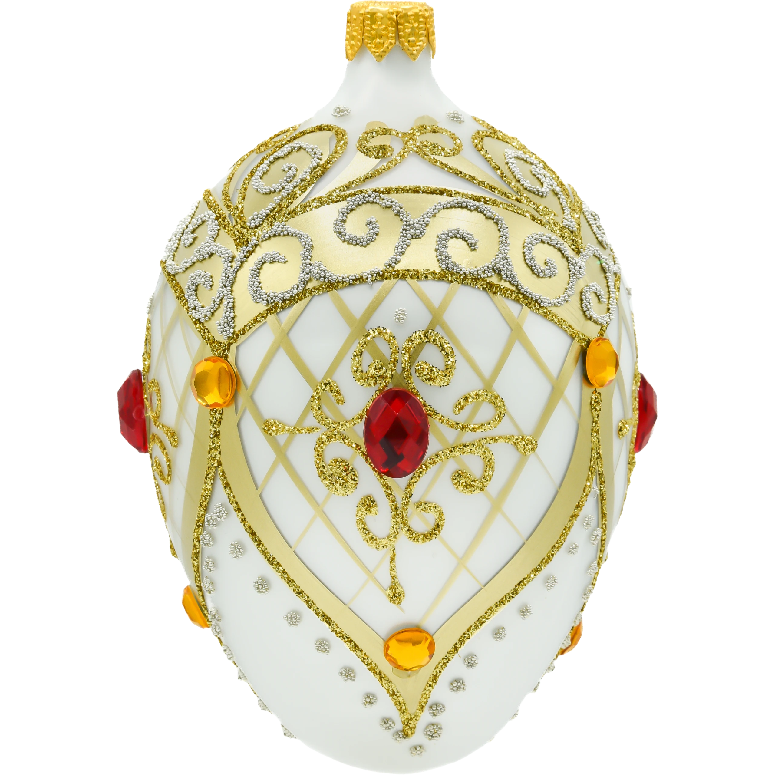 Bombka została zdobiona złotymi, brokatowymi ornamentami, które tworzą misterną siatkę w kształcie rombów, podkreślając jej luksusowy wygląd. Centralnym elementem dekoracyjnym jest duży czerwony kryształ, który lśni na tle złotych zdobień, dodając bombce wyrazistego kontrastu i prestiżu. Dodatkowo, bombka jest przyozdobiona bursztynowymi kryształkami, które delikatnie rozpraszają światło, tworząc subtelny efekt połysku. Złote detale otaczają całą bombkę, nadając jej biżuteryjny blask i podkreślając elegancję.